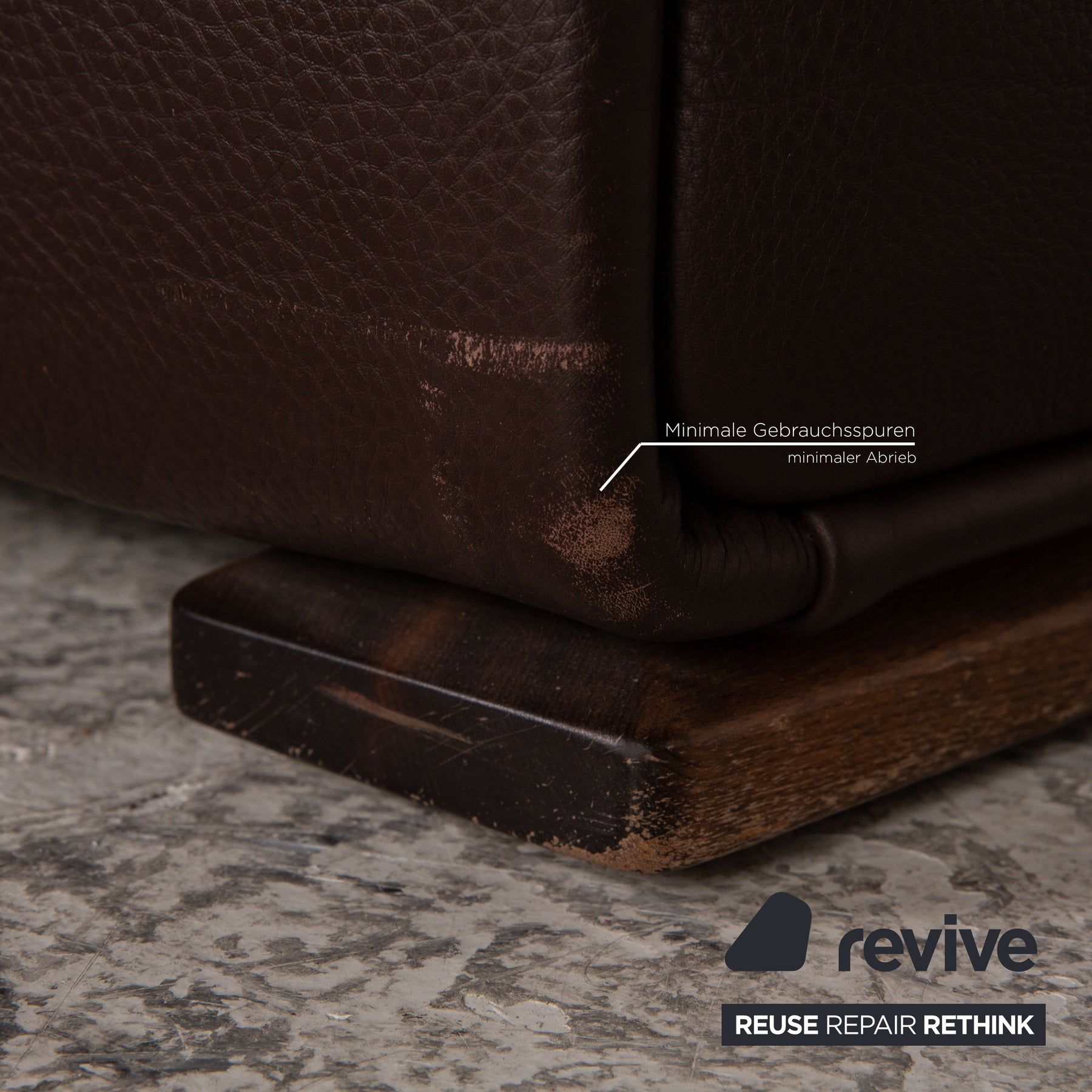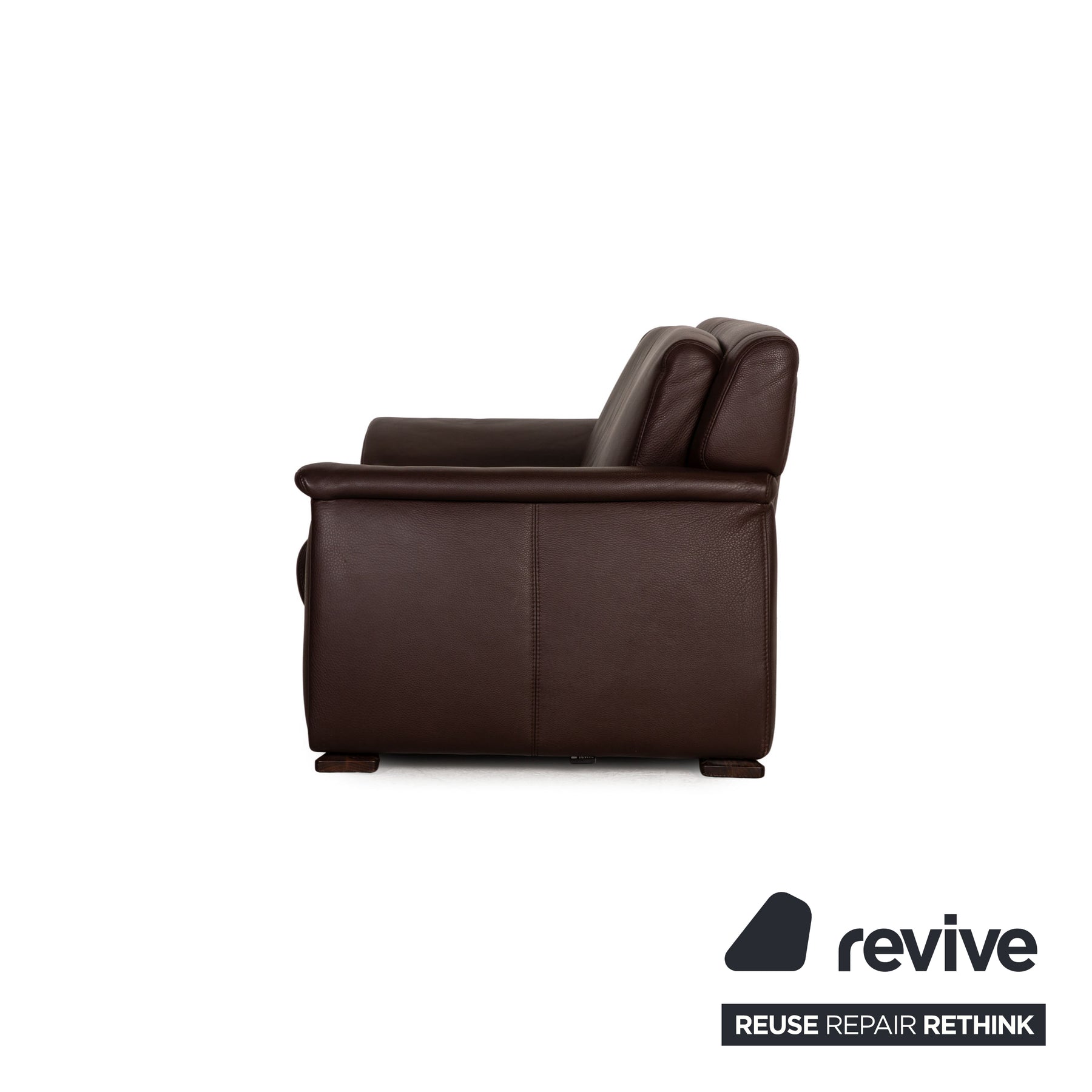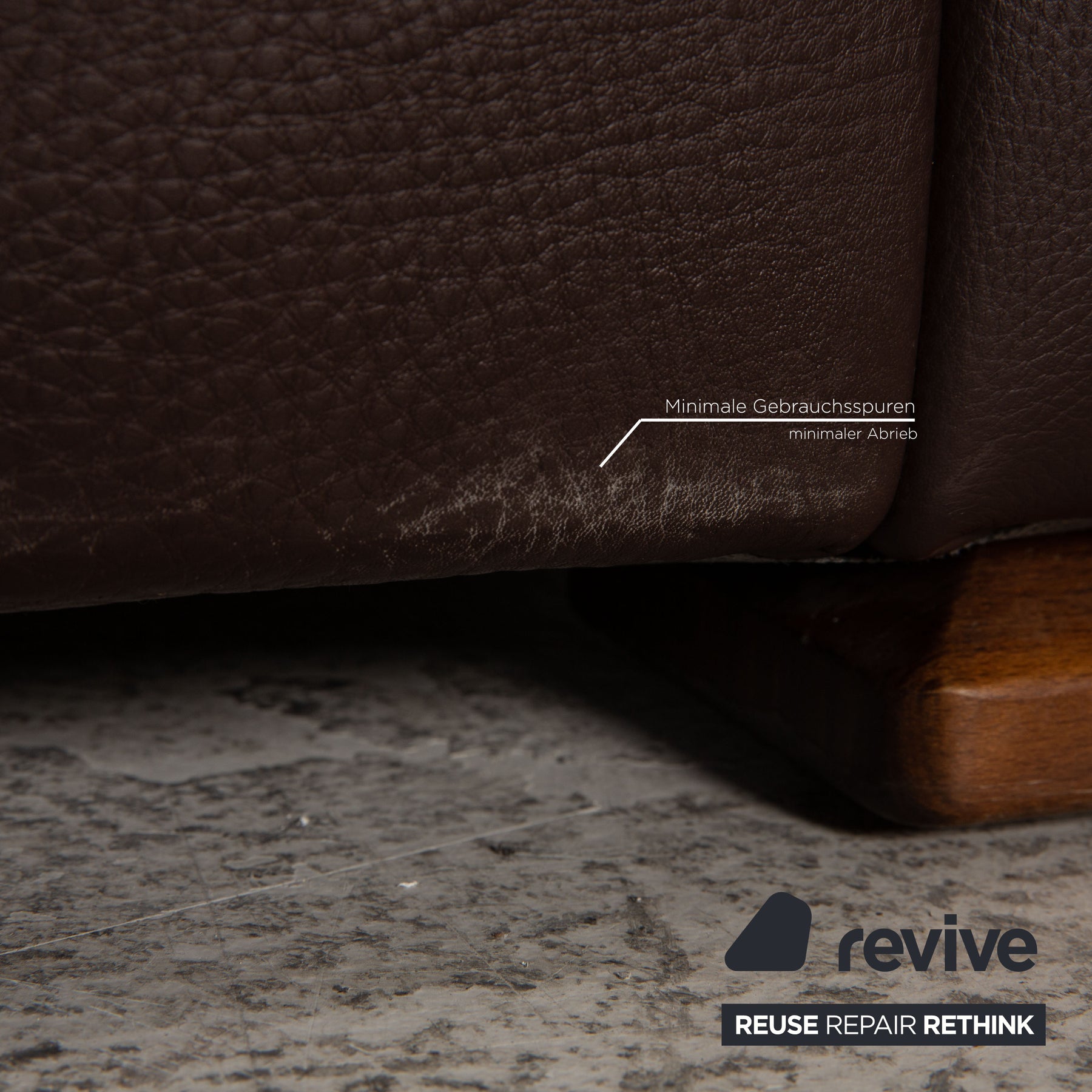 The sofa set by Himolla is covered with brown genuine leather and stands on flat wooden feet. They are characterized by the simple, timeless design and the slanted armrests.