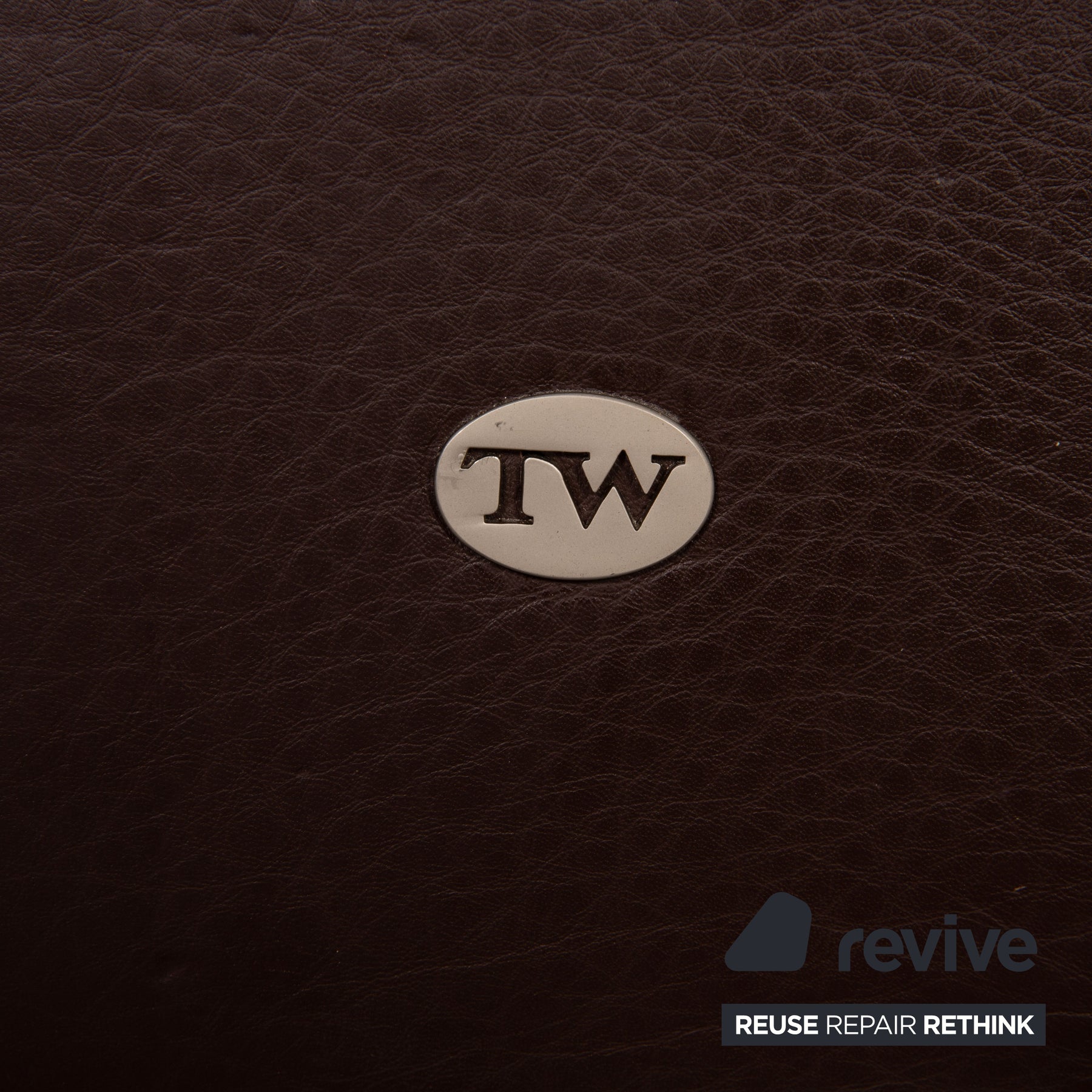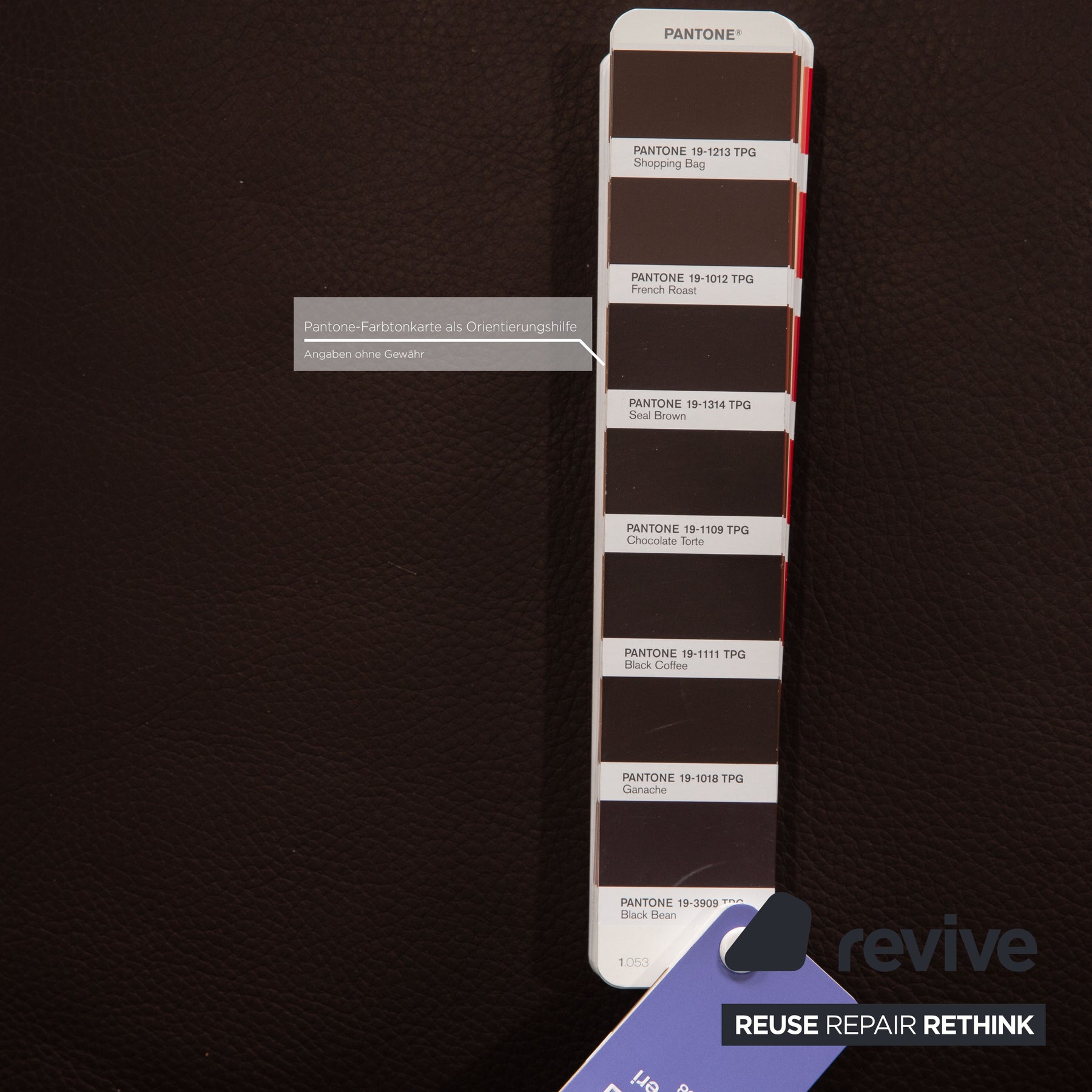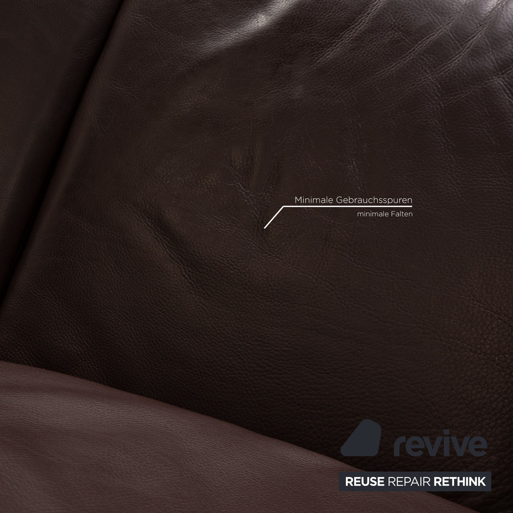 The sofa set by Himolla is covered with brown genuine leather and stands on flat wooden feet. They are characterized by the simple, timeless design and the slanted armrests.