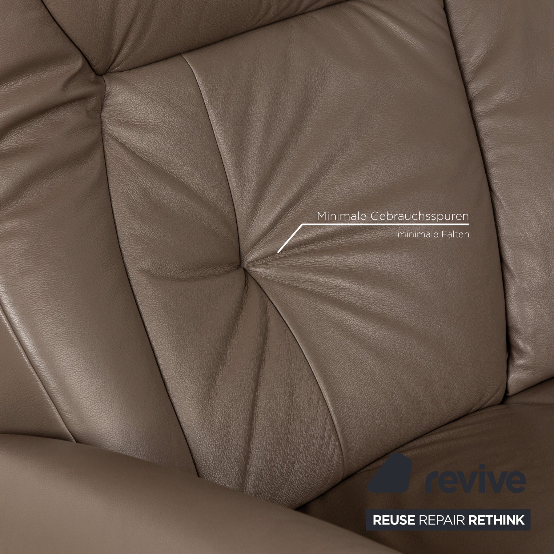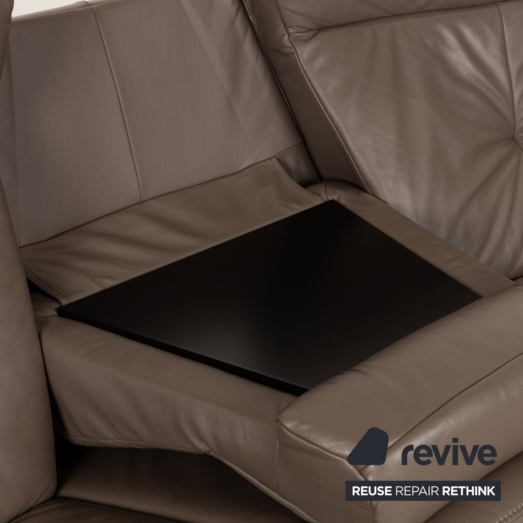 The trapeze sofa from Himolla is covered in brown genuine leather and stands on floor-to-ceiling side panels. The classic design and the practical relaxation function characterize the three-seater.