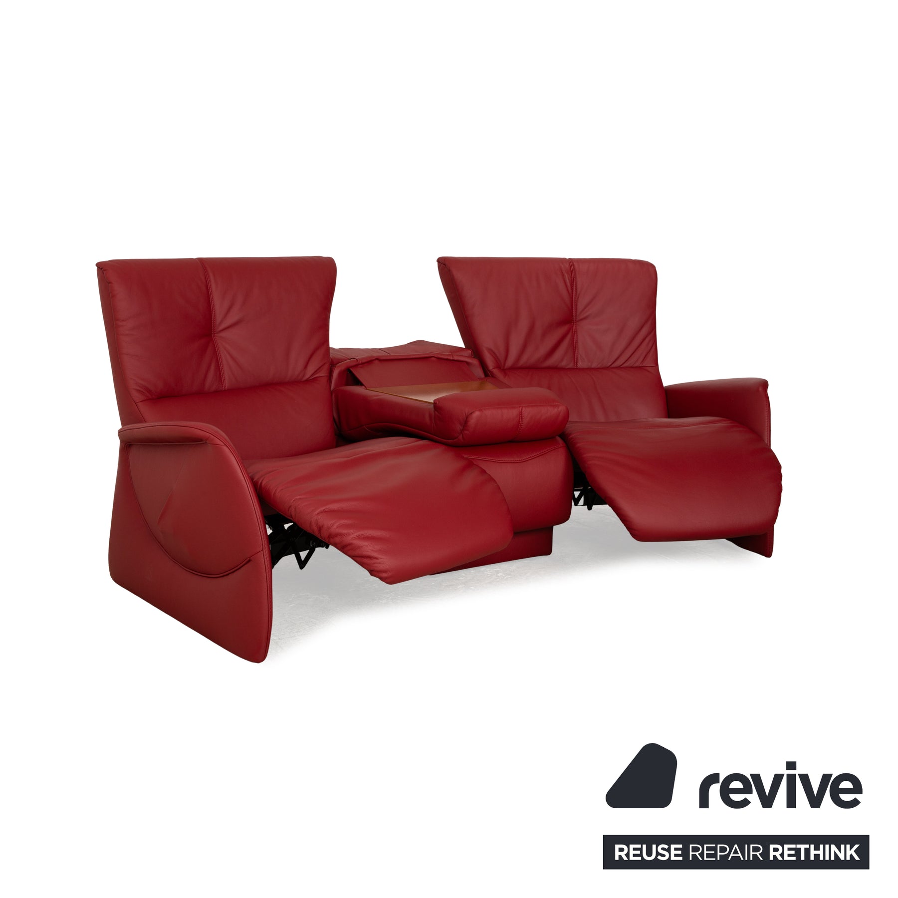 The Trapez sofa from Himolla is covered in dark red genuine leather and can be adjusted to a relaxing position. The three-seater offers a lot of comfort and a wooden storage area under the covered center console.