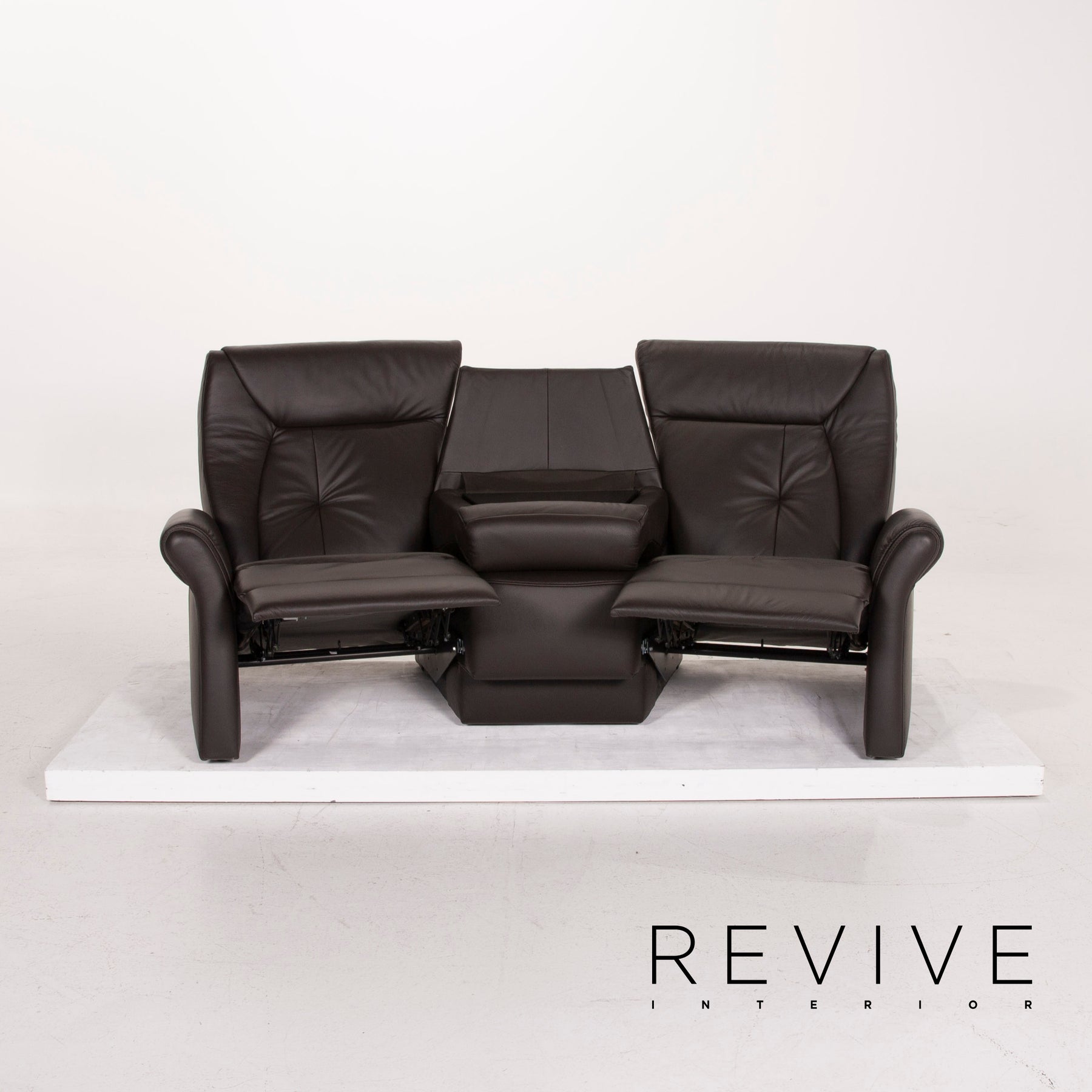 The home cinema sofa Trapeze by Himolla is covered with dark brown real leather and can be brought into a relaxing position. The three-seater offers a lot of comfort and a wooden shelf under the encased center console.