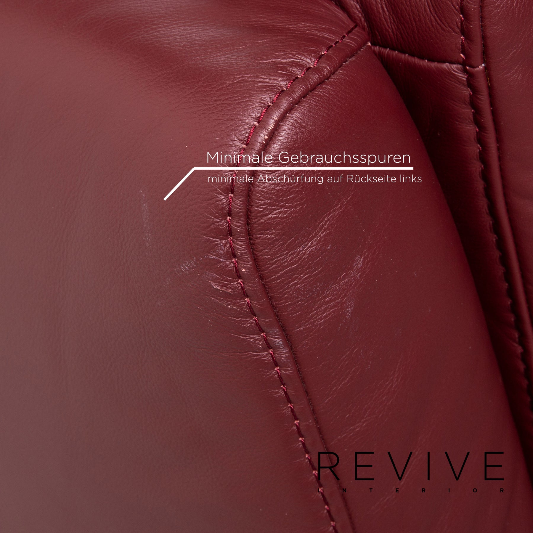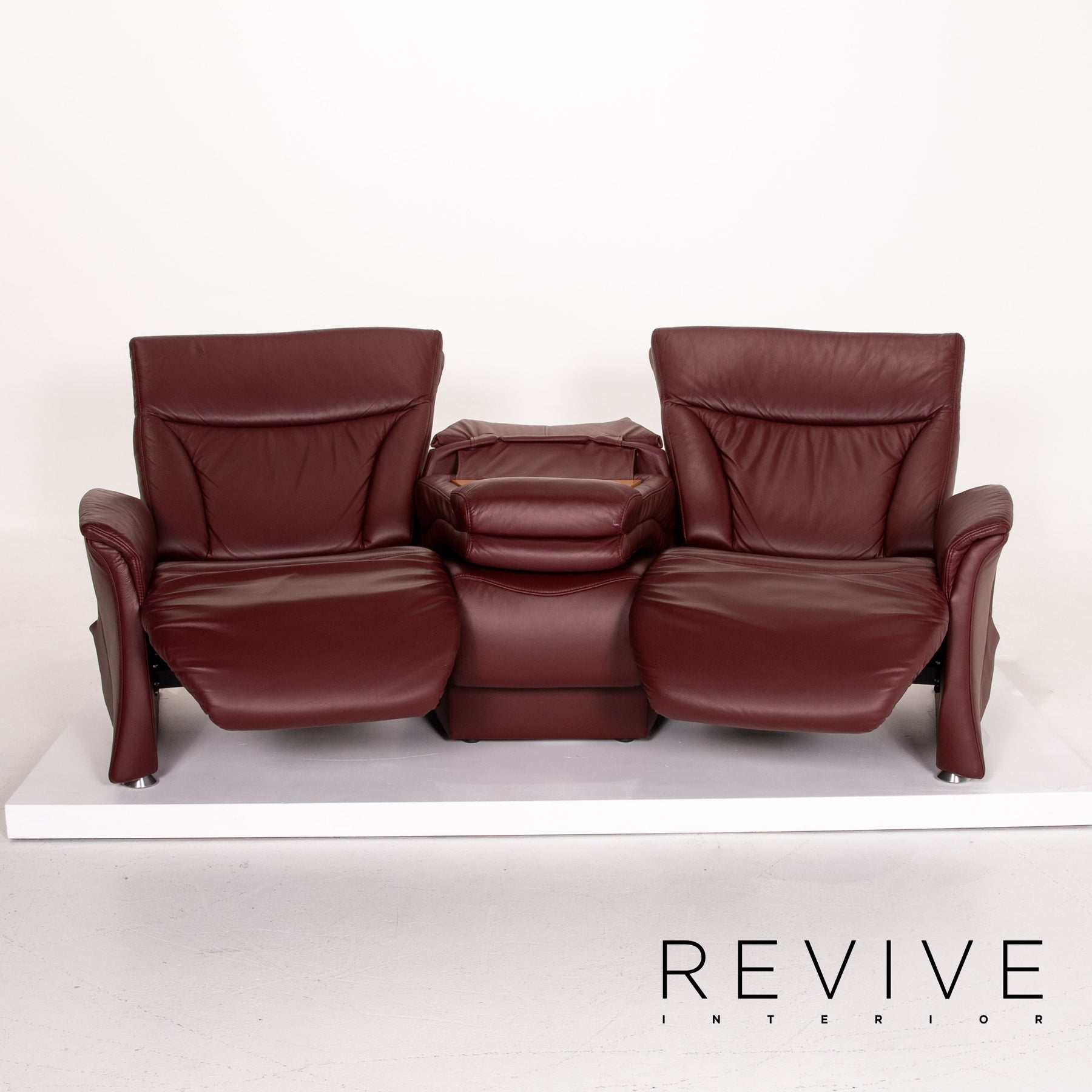 The home cinema sofa Trapez by Himolla for Wohnwert is covered with wine-red genuine leather and can be brought into a relaxing position using the remote control. The three-seater offers a lot of comfort and a fold-out wooden shelf between the two outer seats. The two-seater is part of the set but offers no functions.