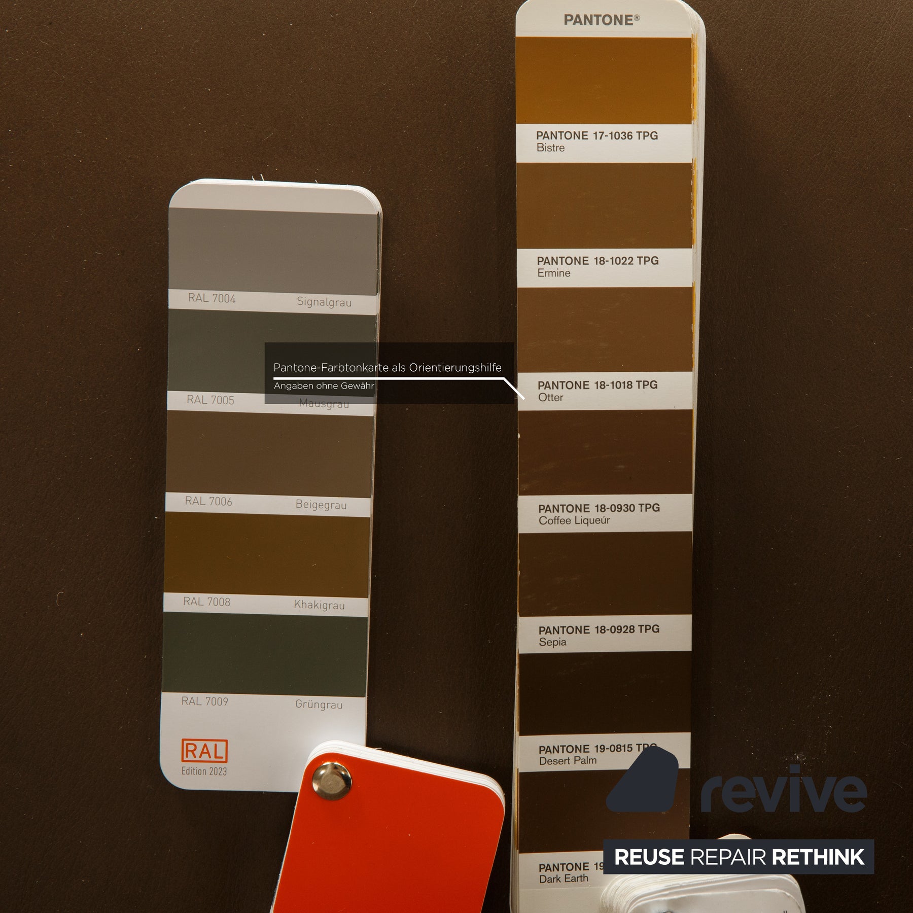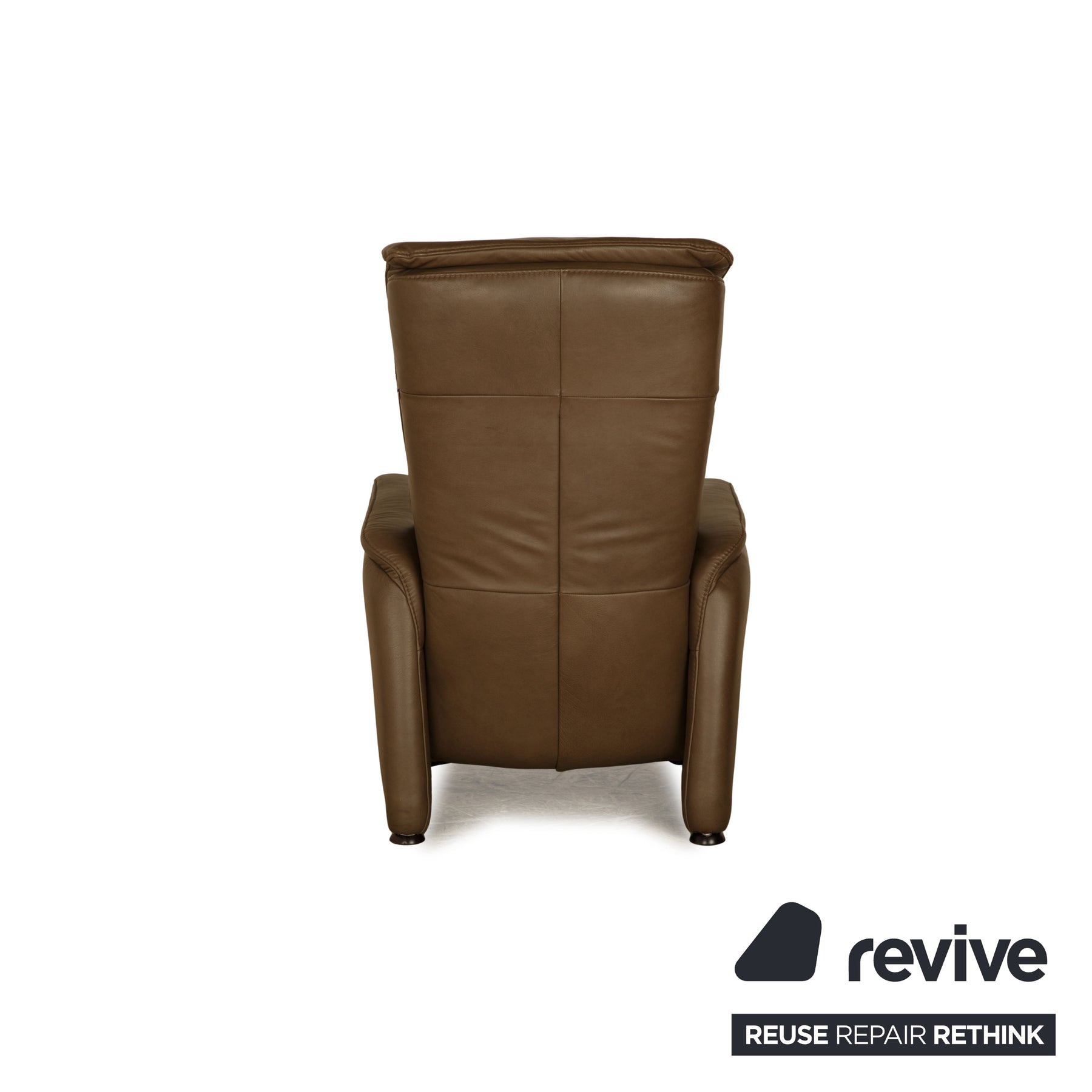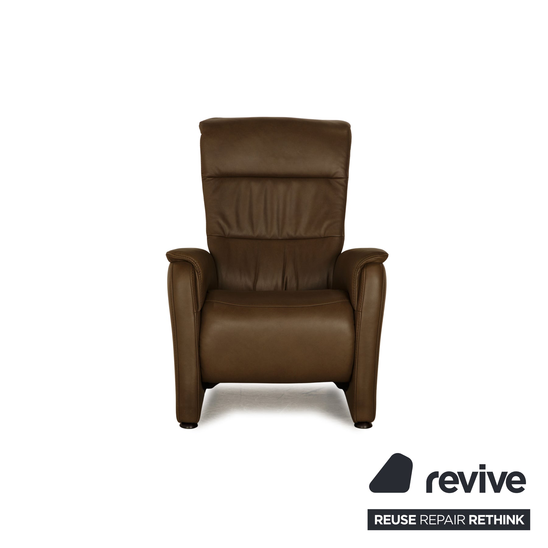 The Hukla armchair is covered with brown genuine leather and stands on small black feet. It is characterized by its classic design and comfortable, high backrest.
