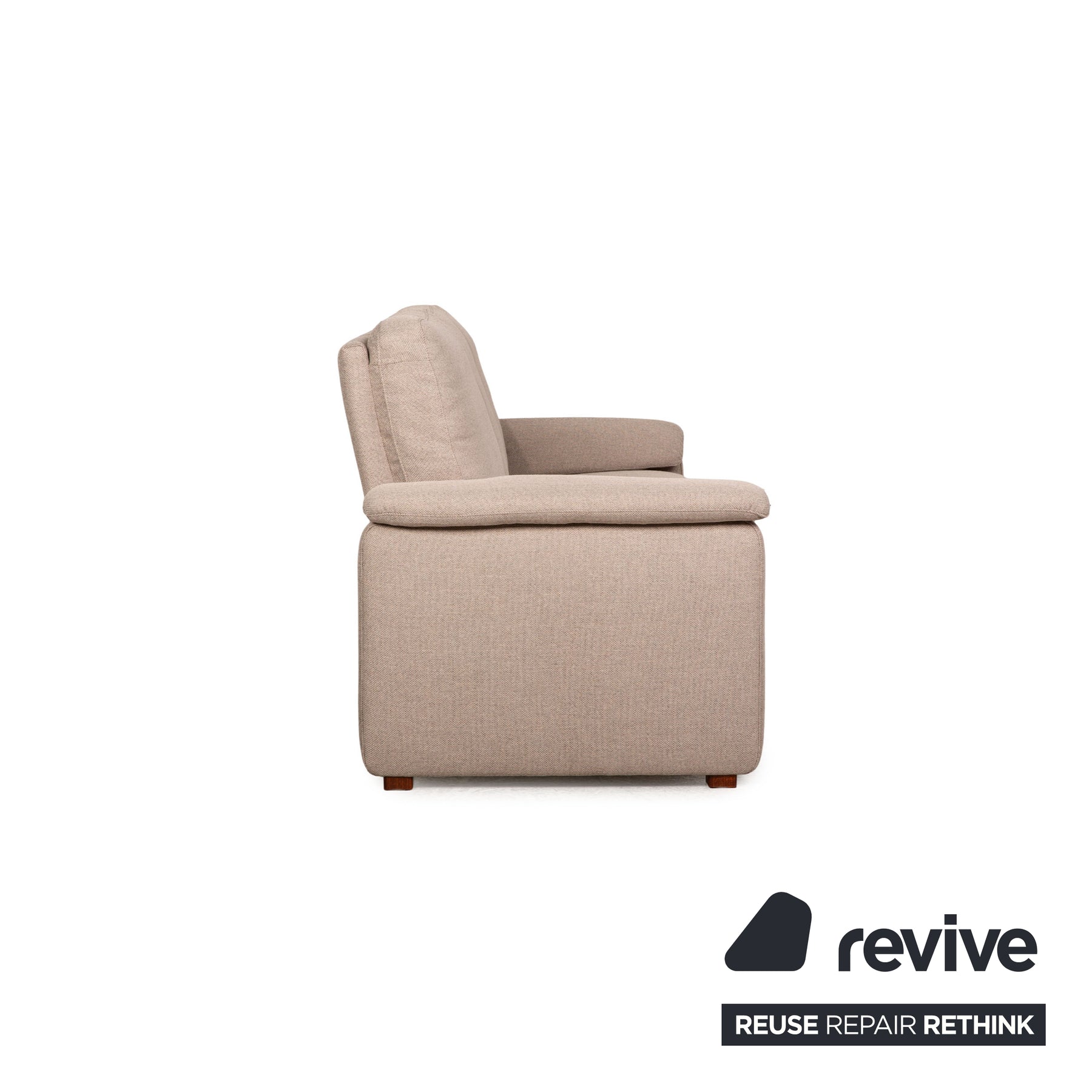 The HUKLA sofa is upholstered with a beige fabric and stands on small, unobtrusive feet. The classic design and the rounded armrests characterize the three-seater.