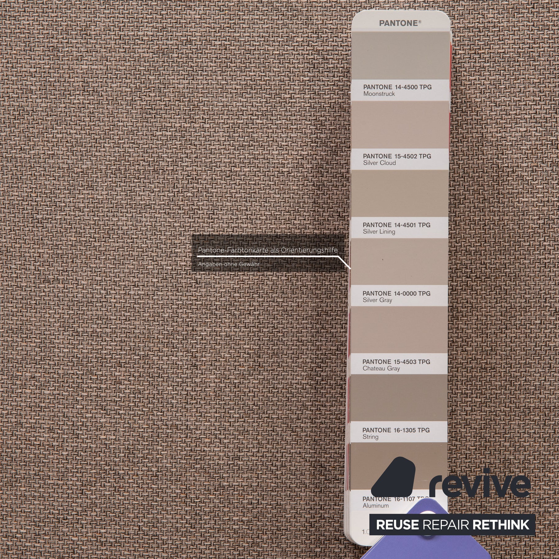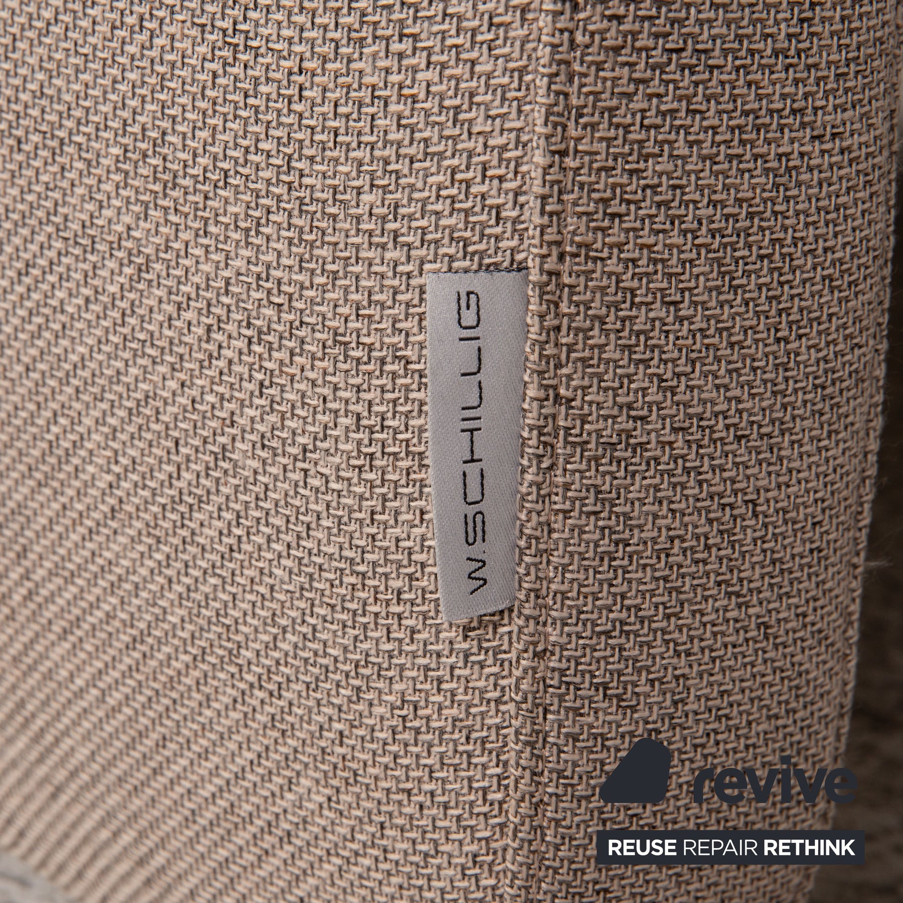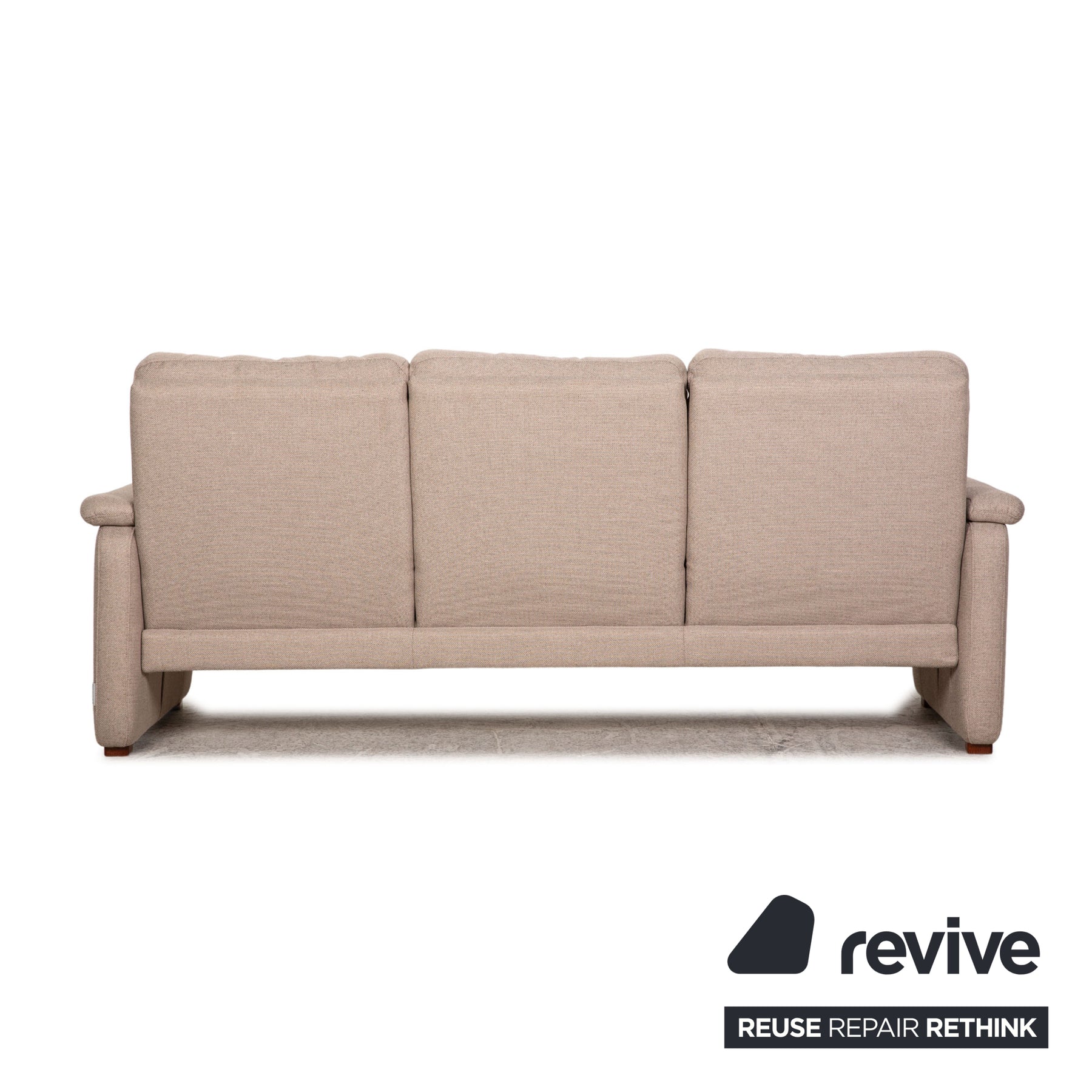 The sofa set by HUKLA is covered with a beige fabric and stands on small, inconspicuous feet. They are characterized by the classic design and the rounded armrests.