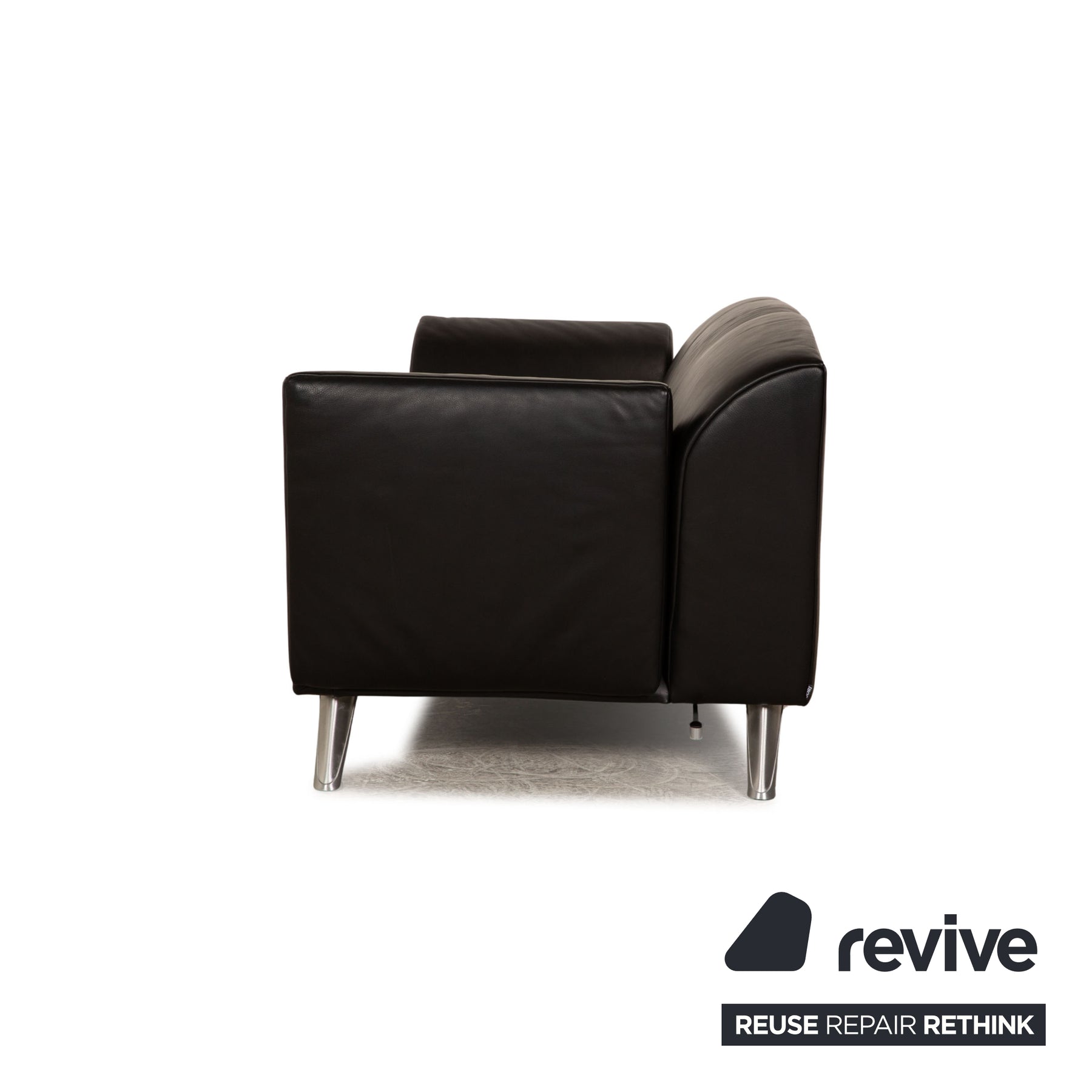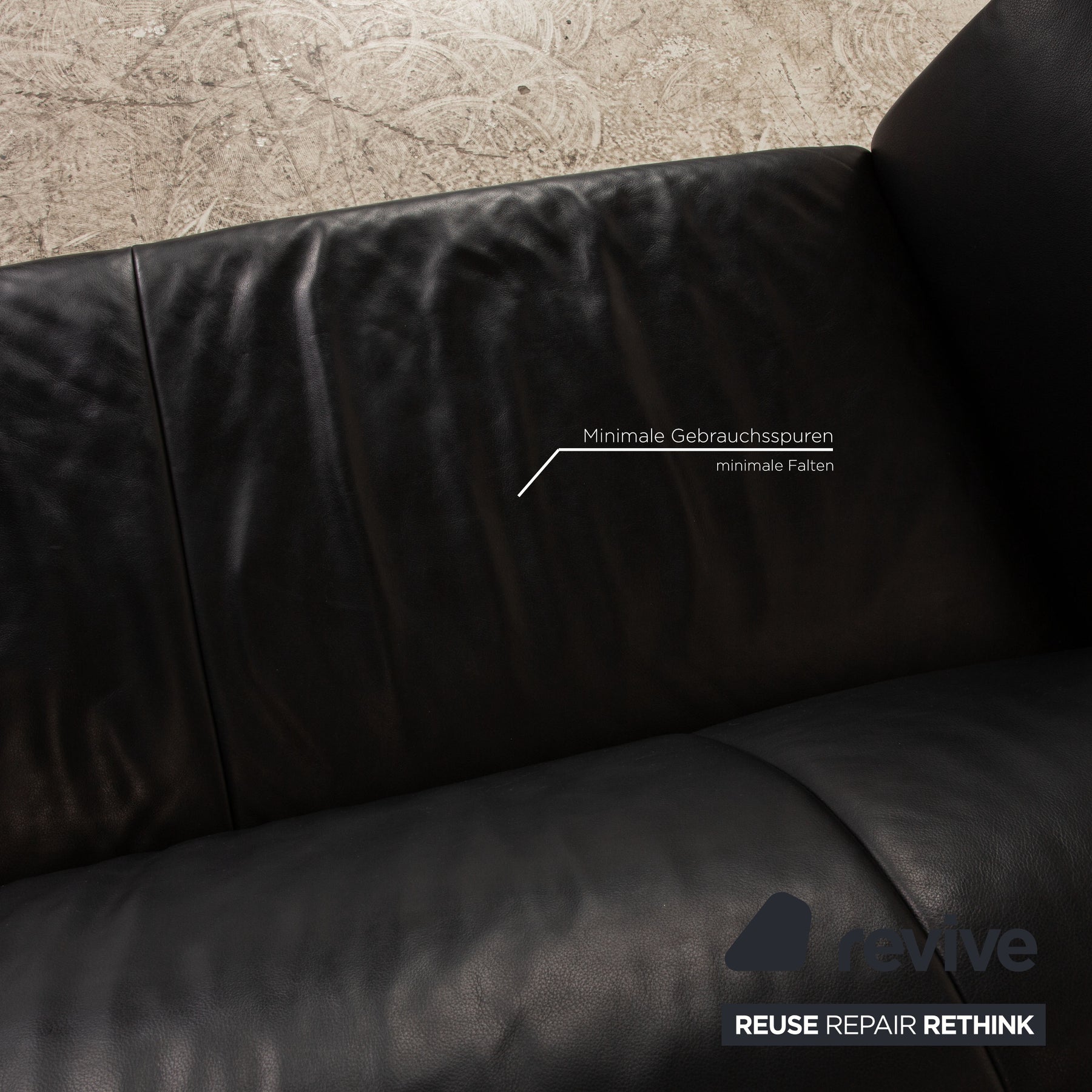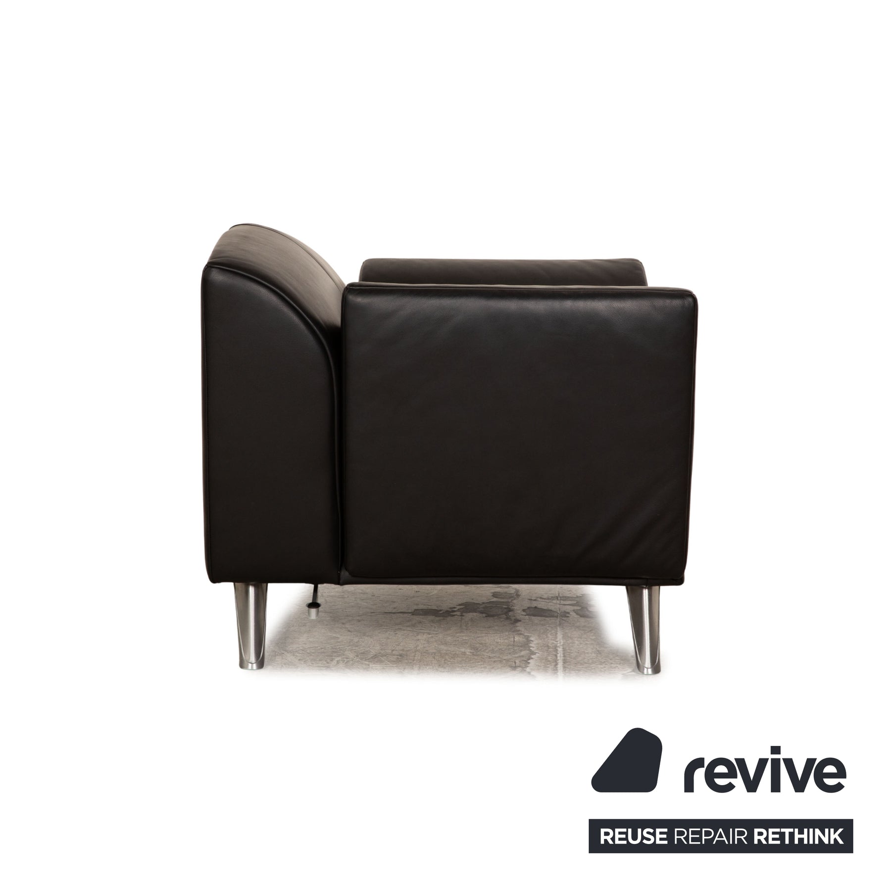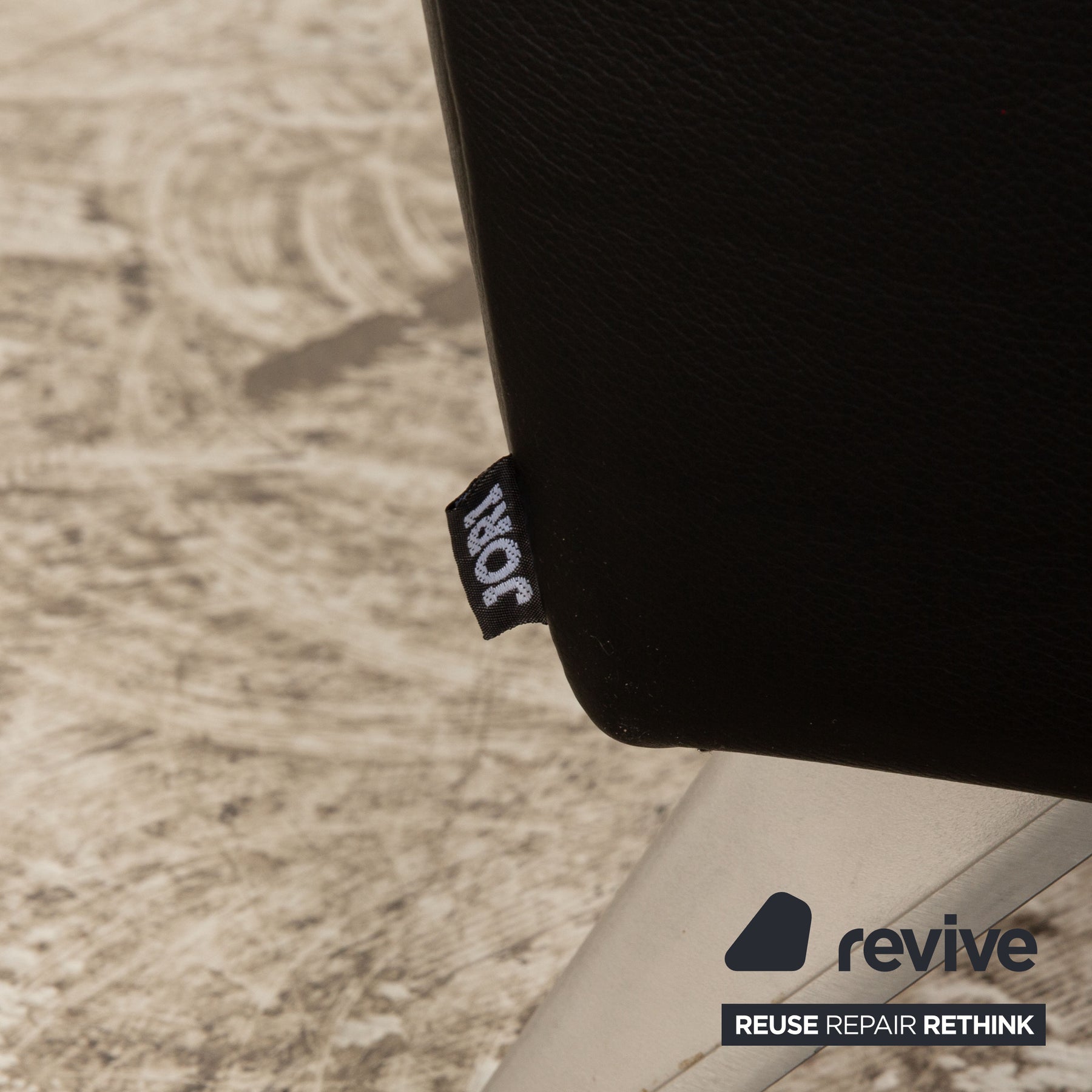 The JR-8100 sofa set from Jori is covered in black genuine leather and stands on silver metal feet. The minimalist design and the rounded armrests set them apart. The set consists of a three-seater and an armchair.