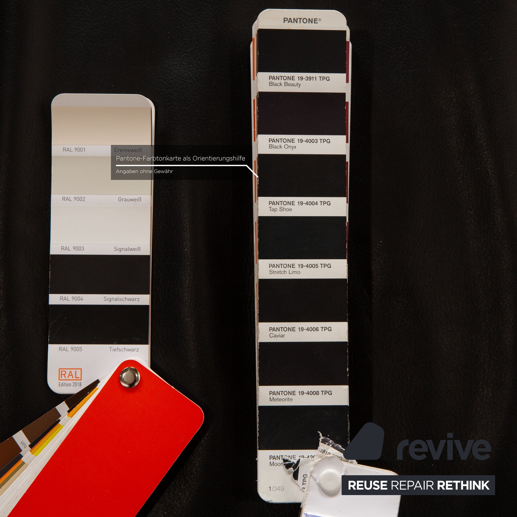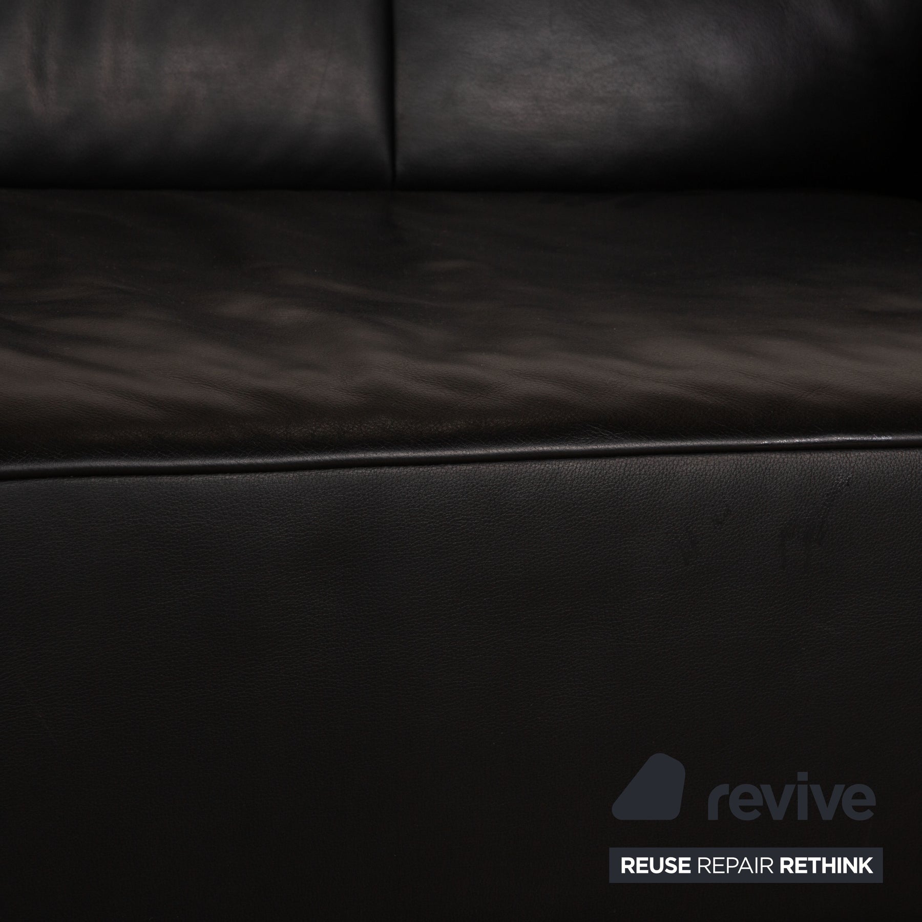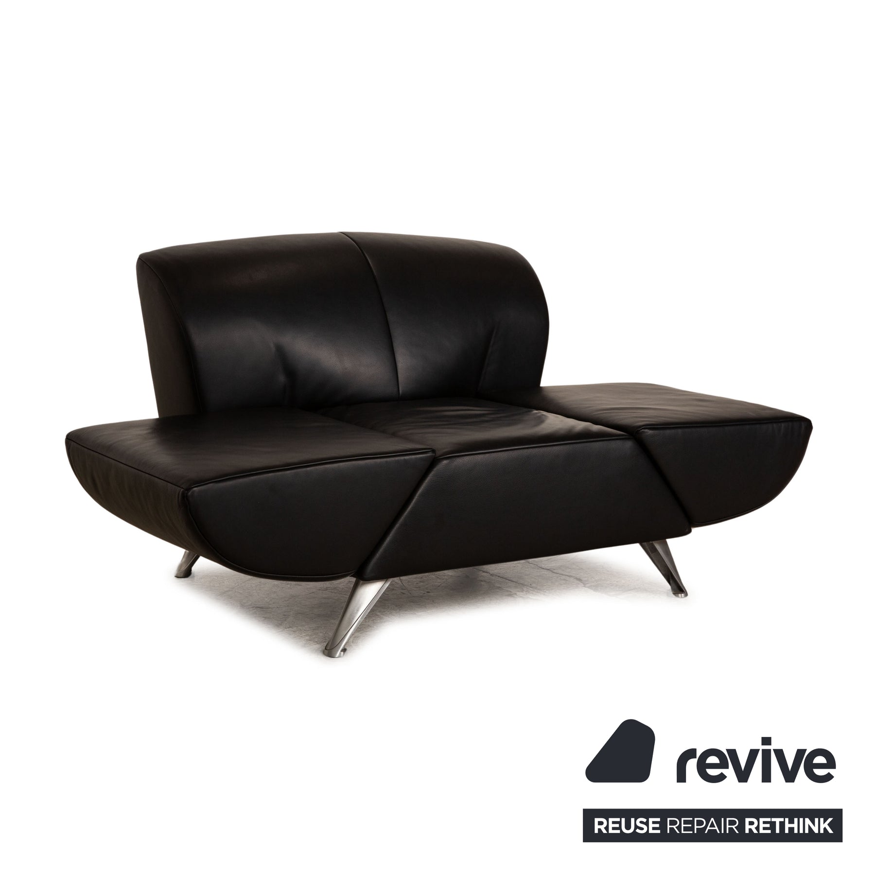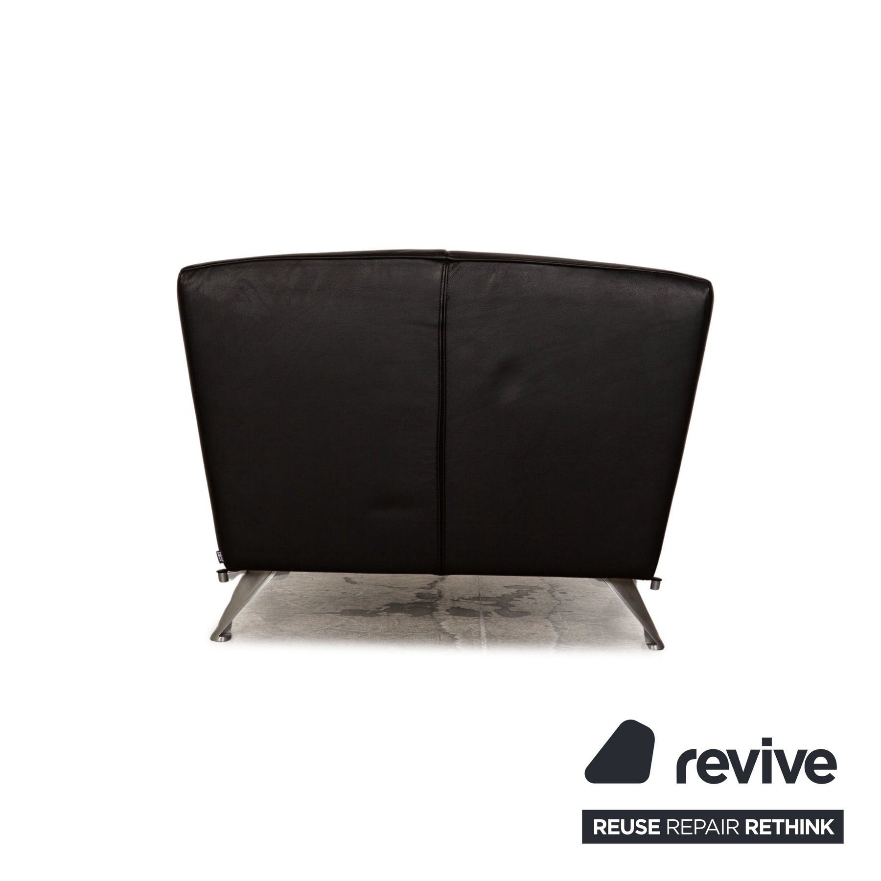 The JR-8100 sofa set from Jori is covered in black genuine leather and stands on silver metal feet. The minimalist design and the rounded armrests set them apart. The set consists of a three-seater and an armchair.