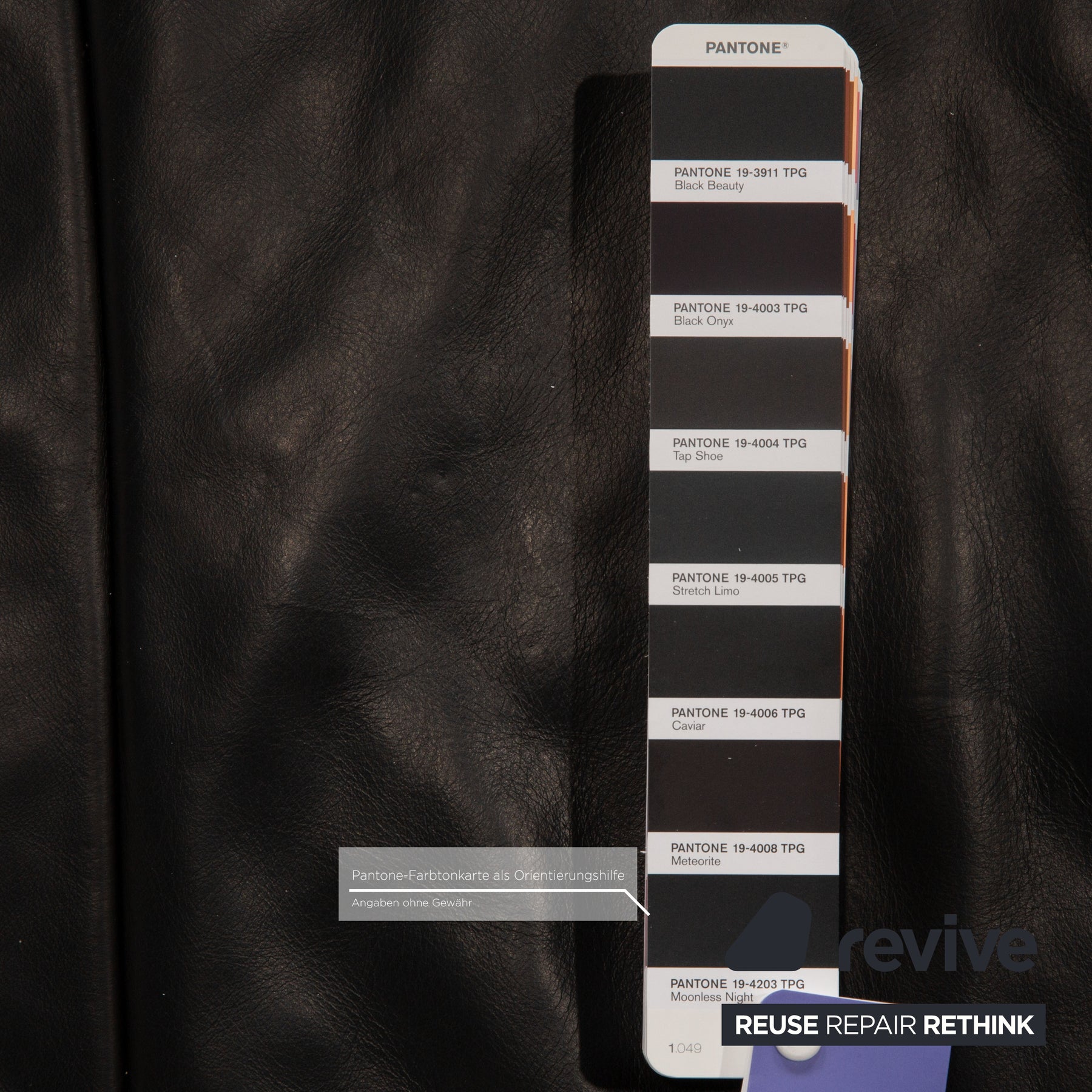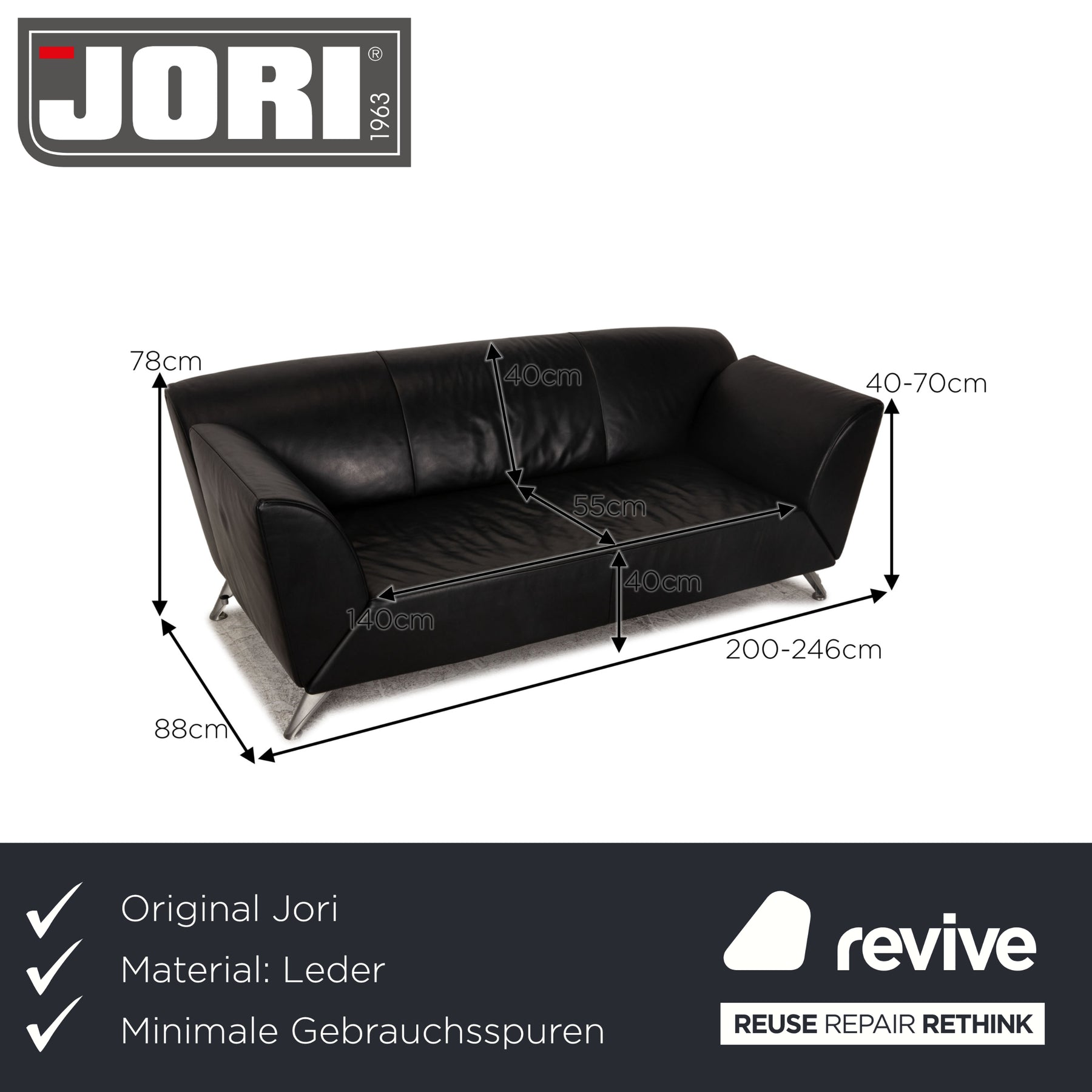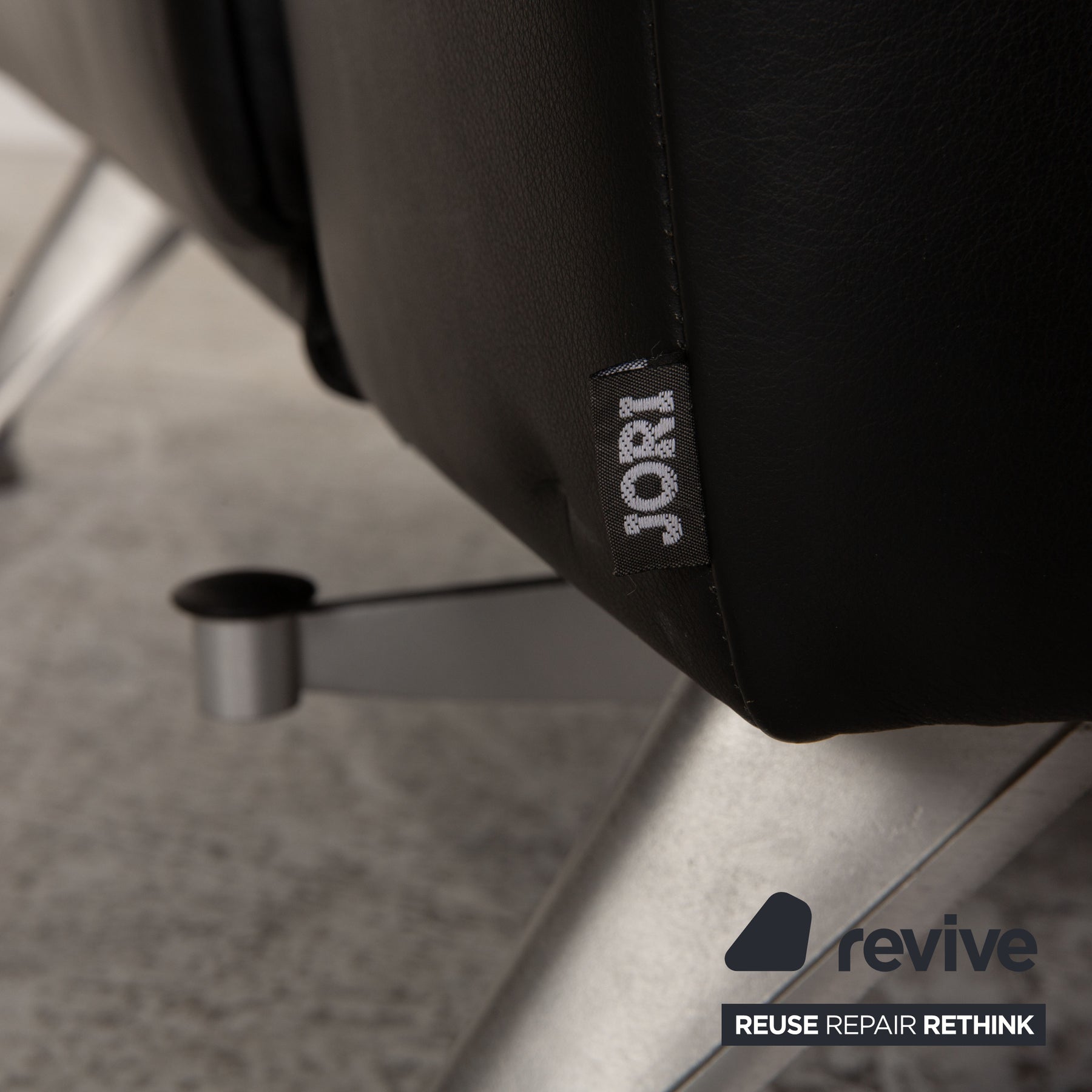 The JR-8100 sofa by Jori is upholstered in black genuine leather and stands on silver metal feet. The modern, minimalist design and the slanted armrests characterize the two-seater.