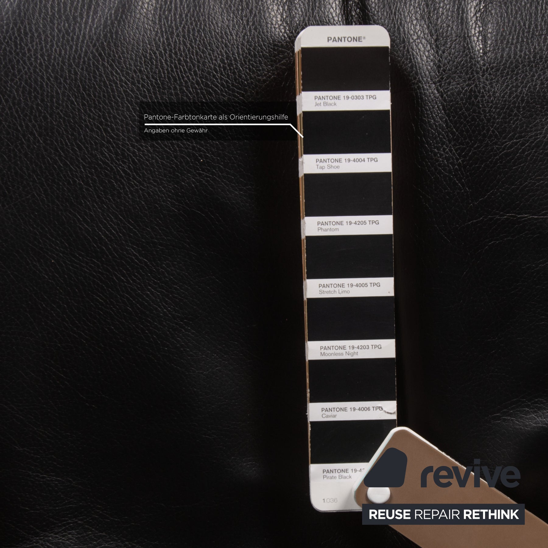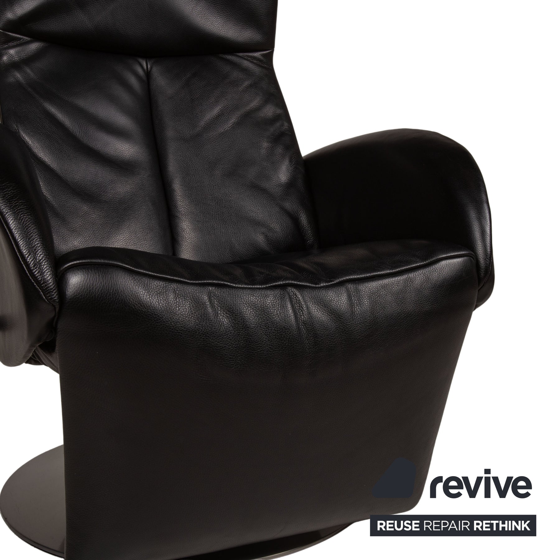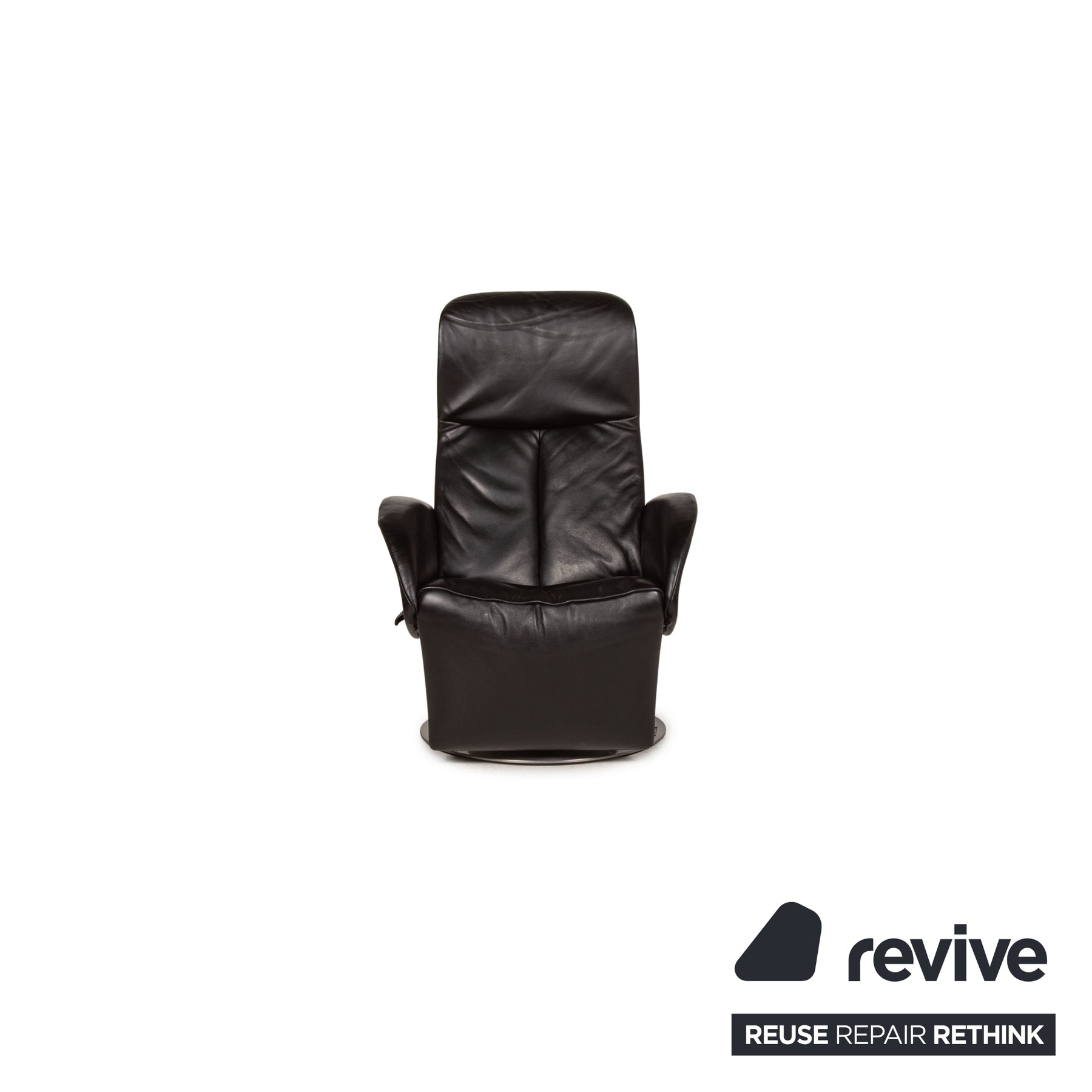The armchair by Jori is upholstered in black genuine leather and stands on a round black metal base. It is characterized by its simple, modern design and its comfortable relaxation function.