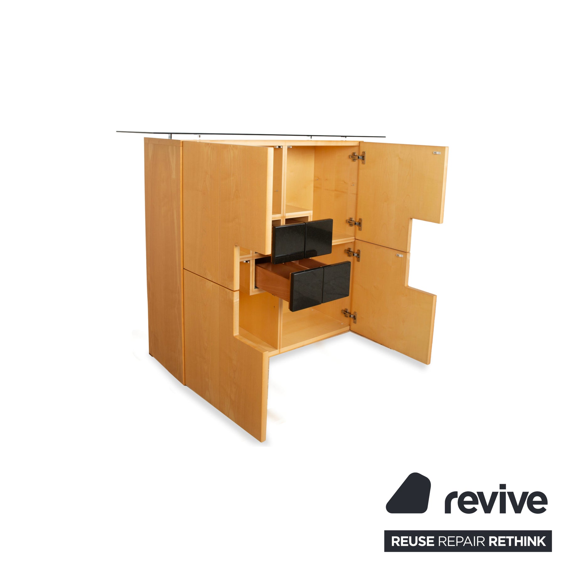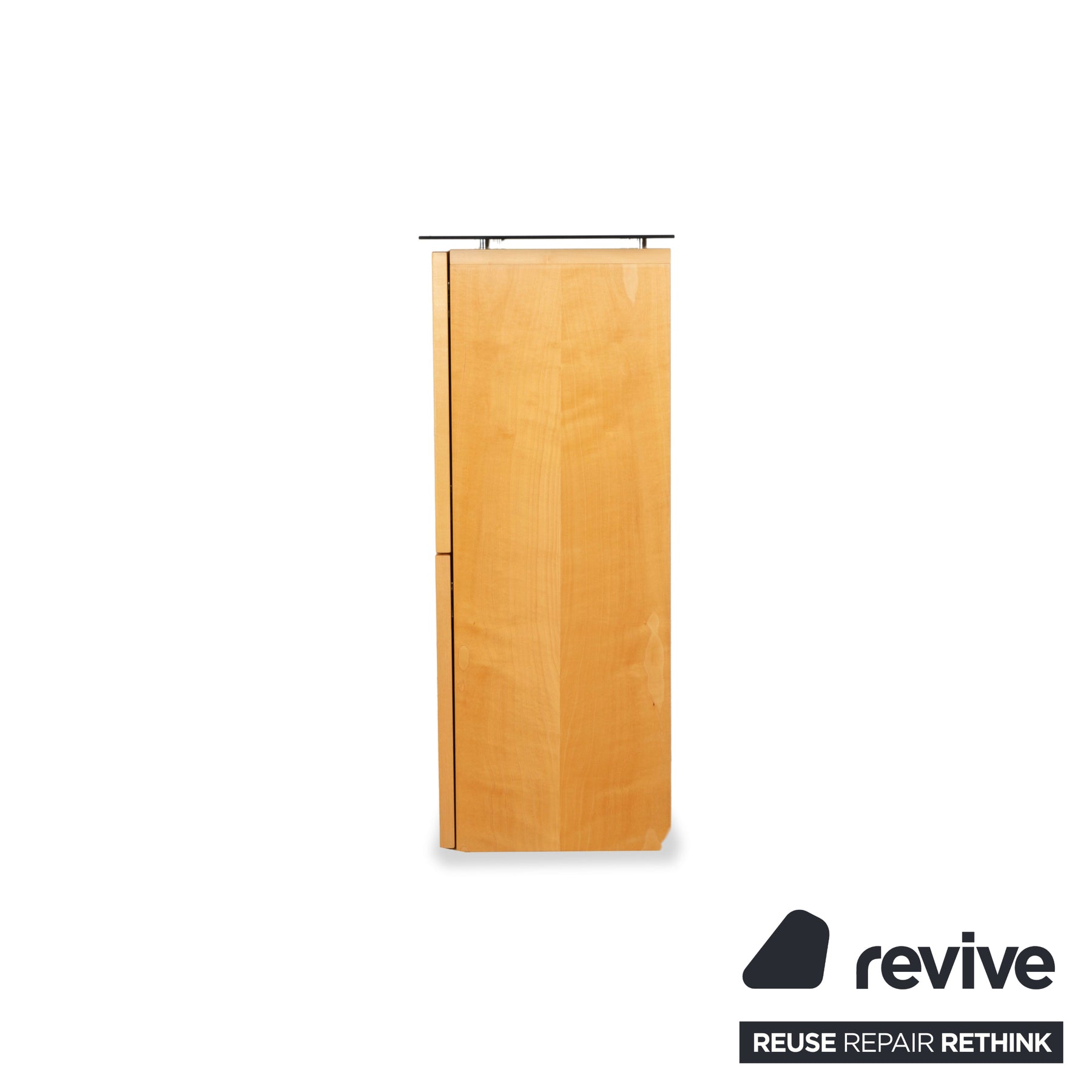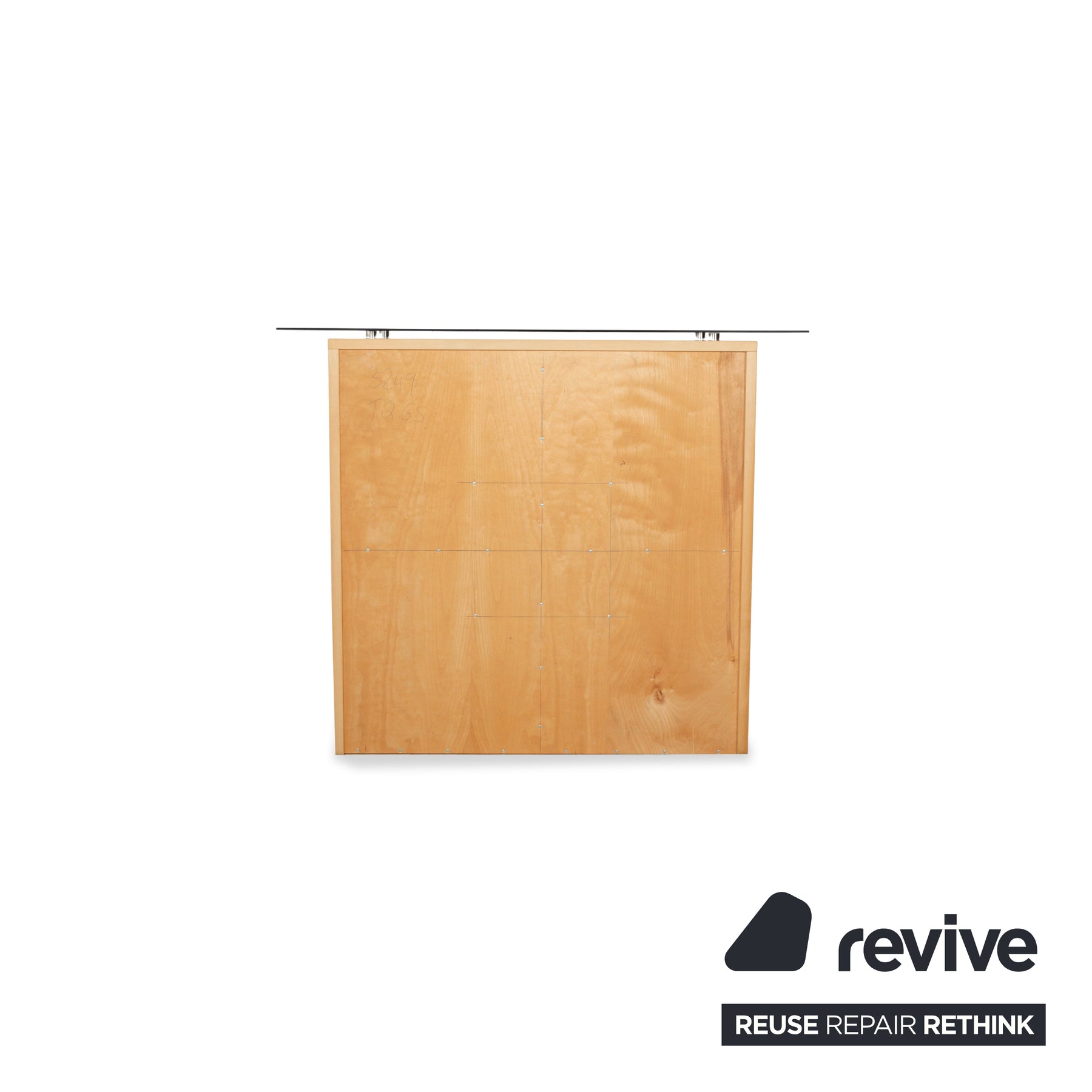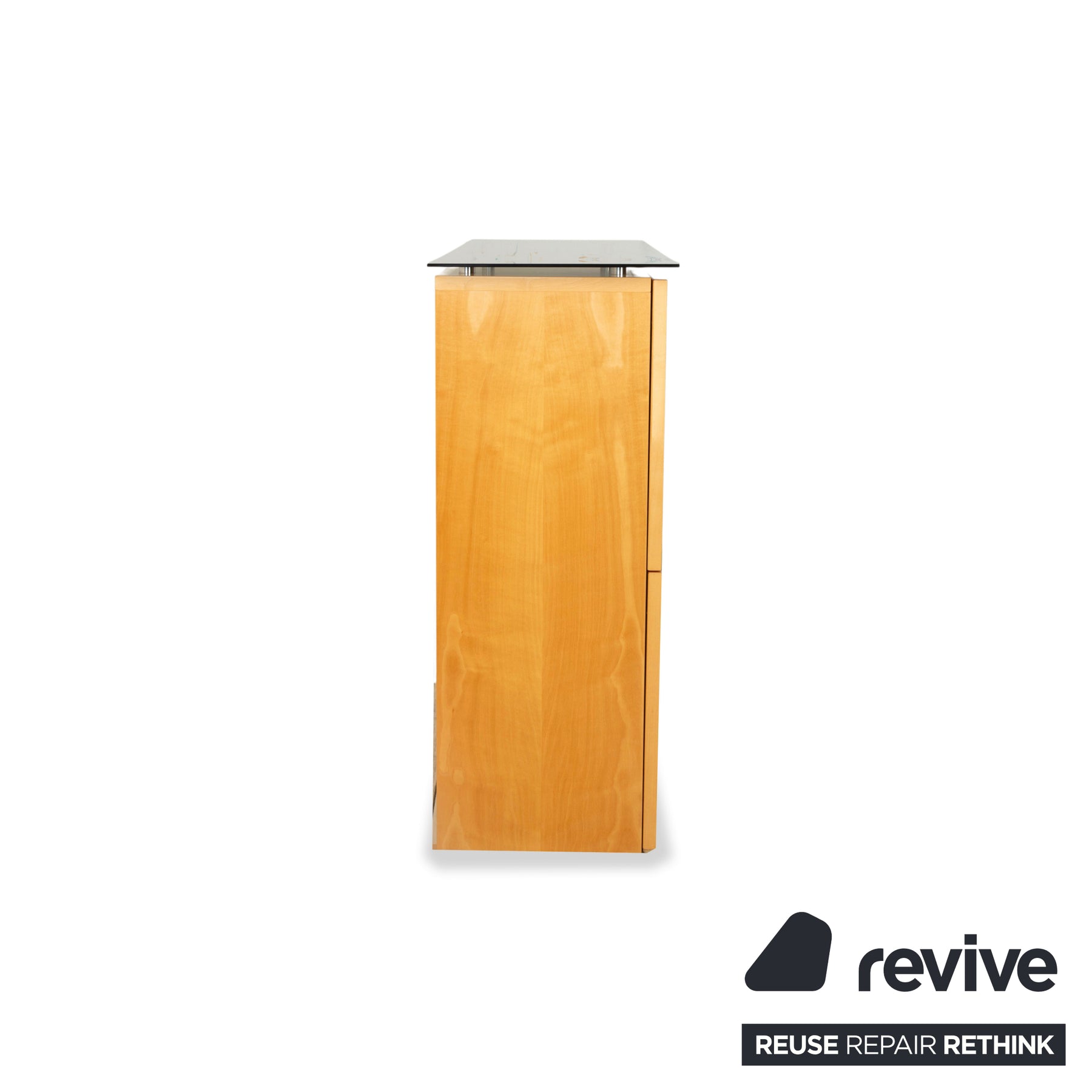 This elegant display cabinet combines a warm wood look with modern accents. The natural grain of the light wood surface brings a welcoming atmosphere to the room, while the central black glass element provides a stylish contrast. The design is crowned by a delicate glass top that adds a sense of lightness and makes the piece a focal point in any living or dining area.