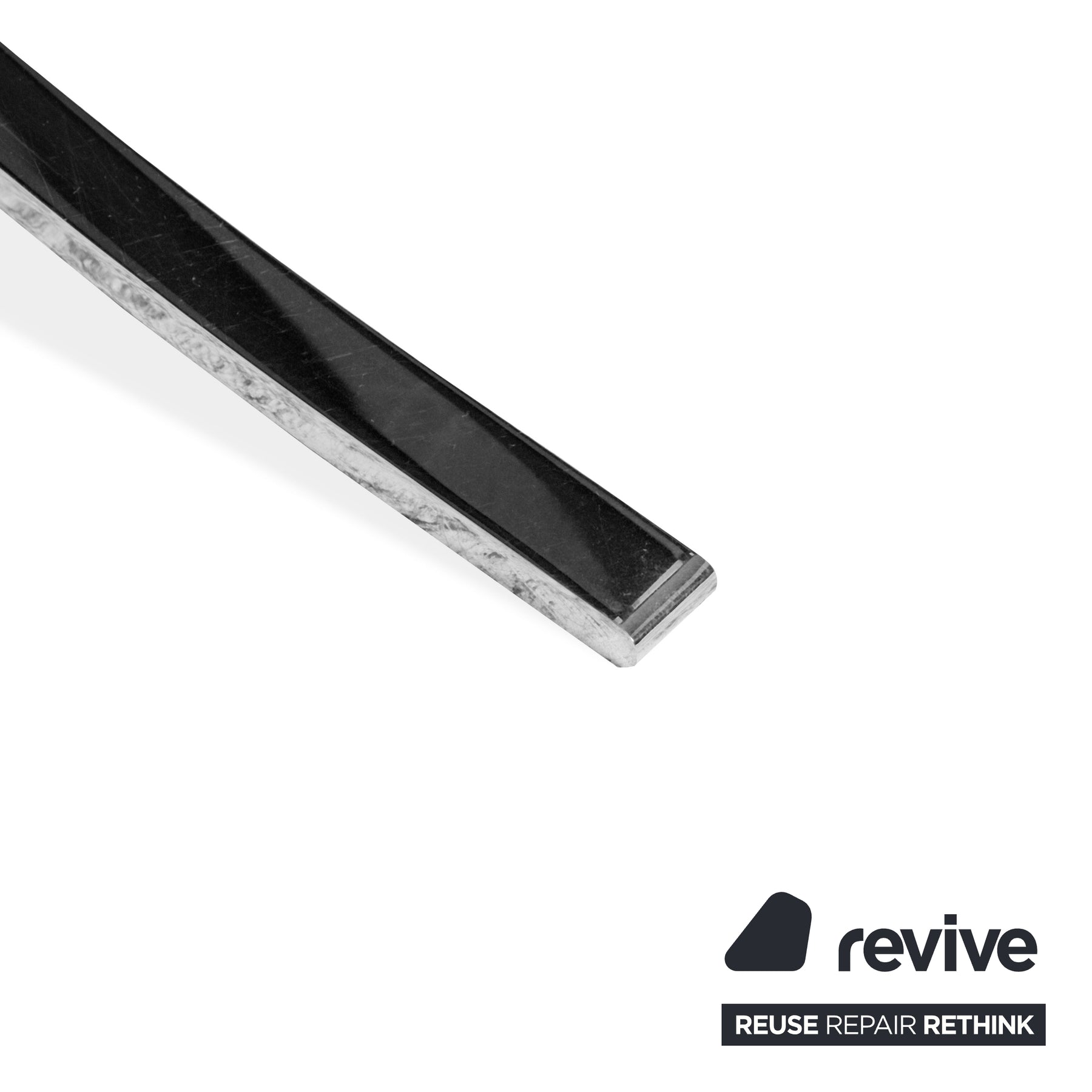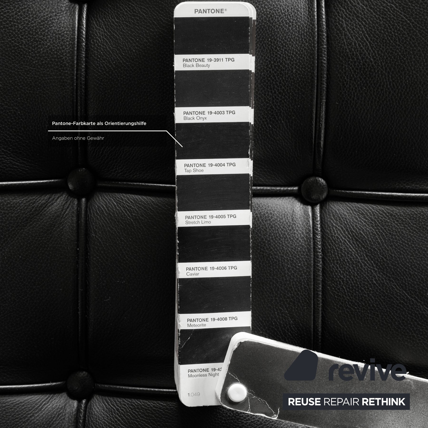 The original Barcelona Chair by Knoll International is upholstered in black genuine leather and stands on metal legs. It impresses with its simple, timeless look and rounded edges, making it a true design classic.