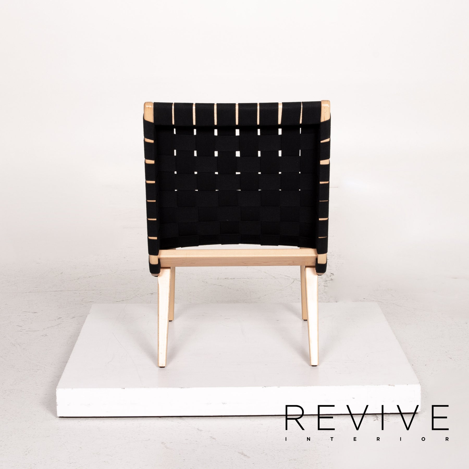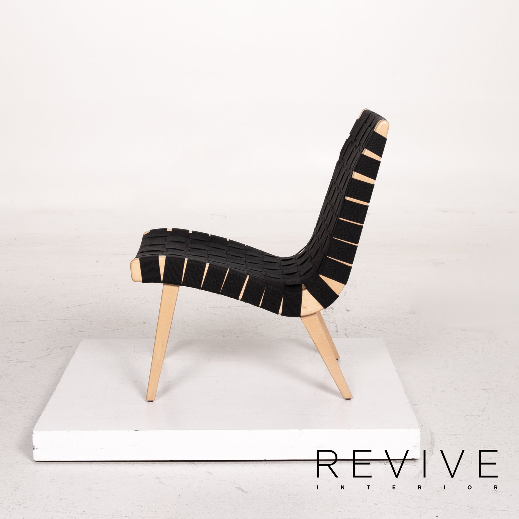 The Risom Lounge Chair by Jens Risom from the 1941 collection is made from a light wooden frame and covered with black fabric (cotton). An organic, harmonious shape and natural materials characterize the armchair.