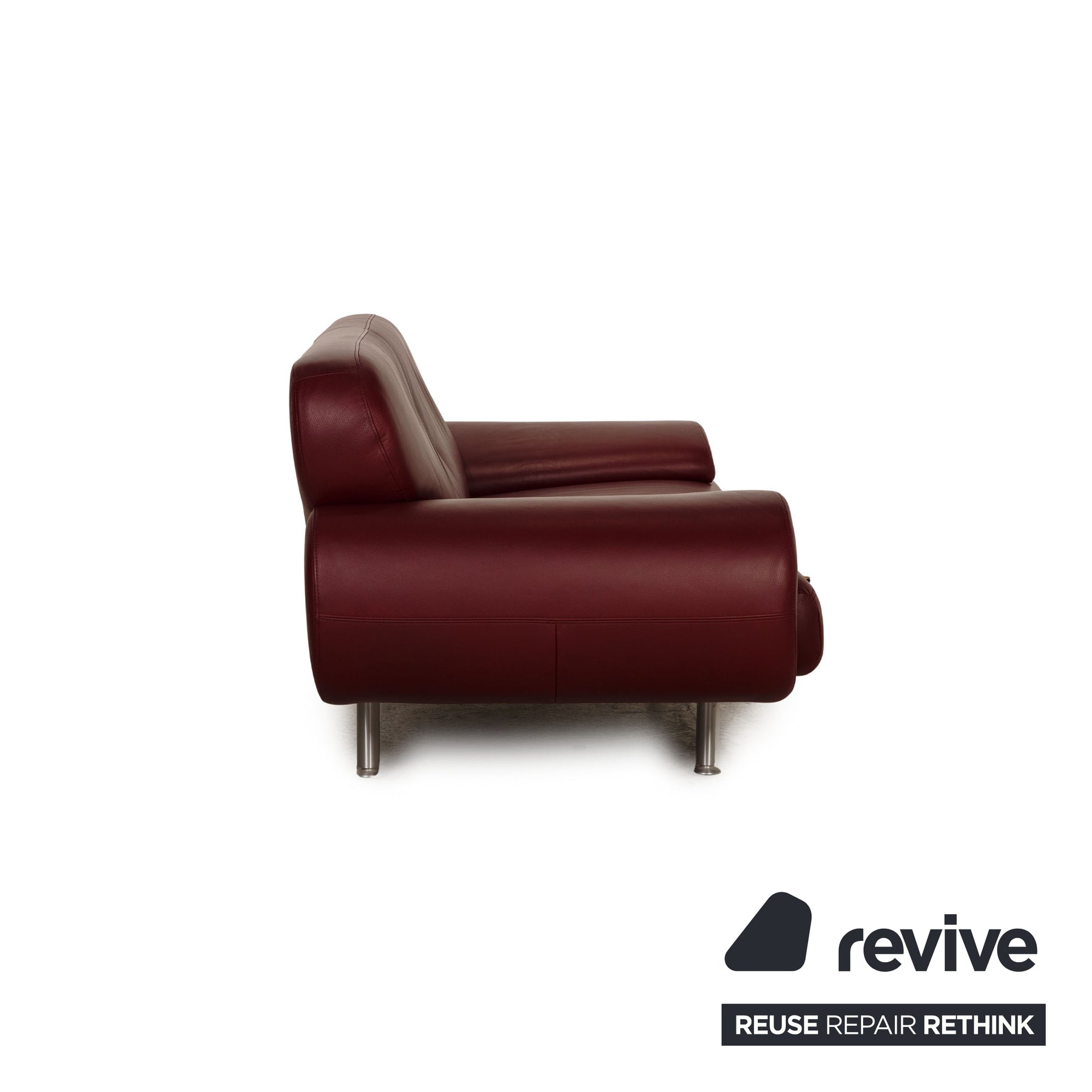 The Laaus sofa is covered with dark red real leather and stands on narrow, silver feet. It impresses with its classic, timeless design and the comfortable, rounded armrests.