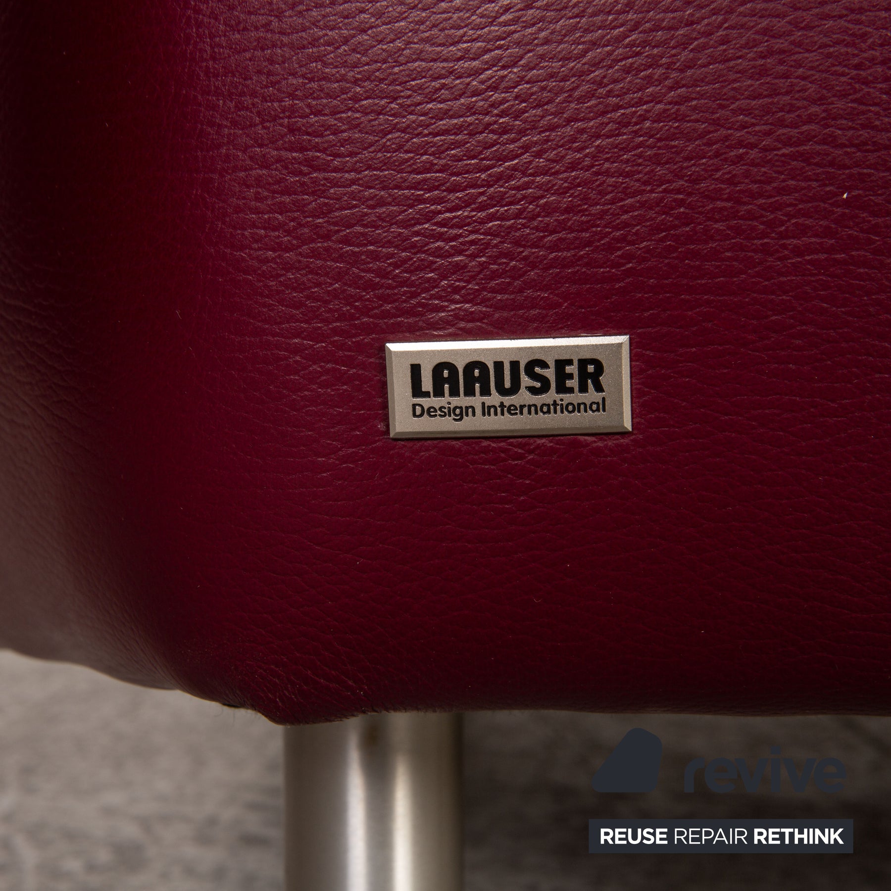 The armchair by Laauser is covered with aubergine-colored real leather and stands on round metal feet. It is characterized by the classic, timeless design and the rounded edges.