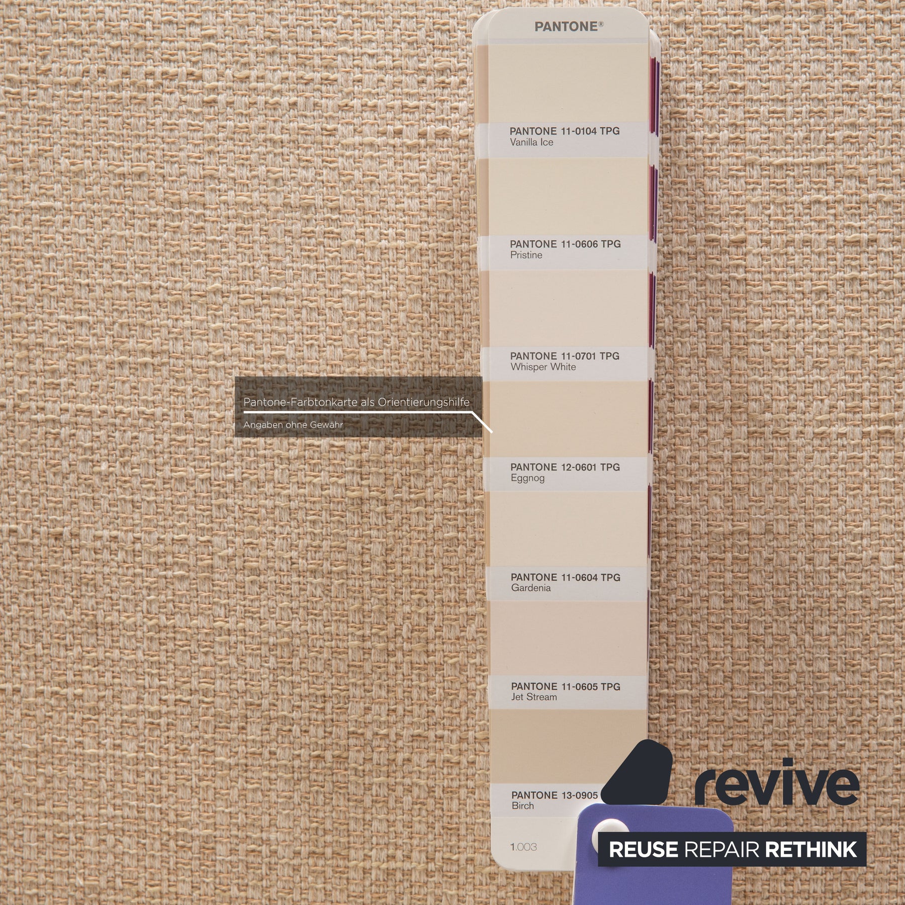 The armchair by Laauser is covered with a cream-colored fabric and stands on floor-to-ceiling side panels. The simple design and the slanted armrests distinguish it.