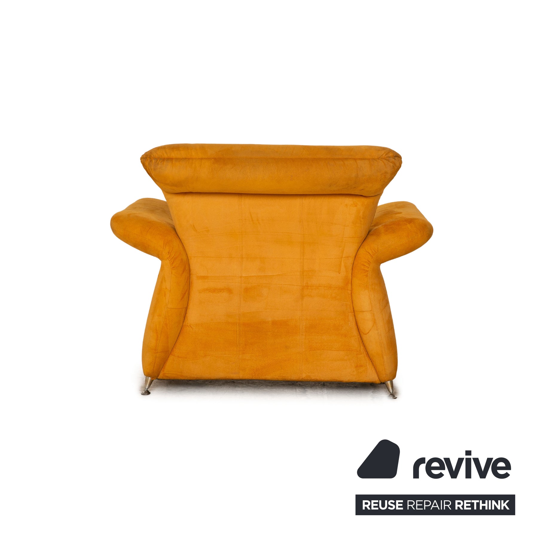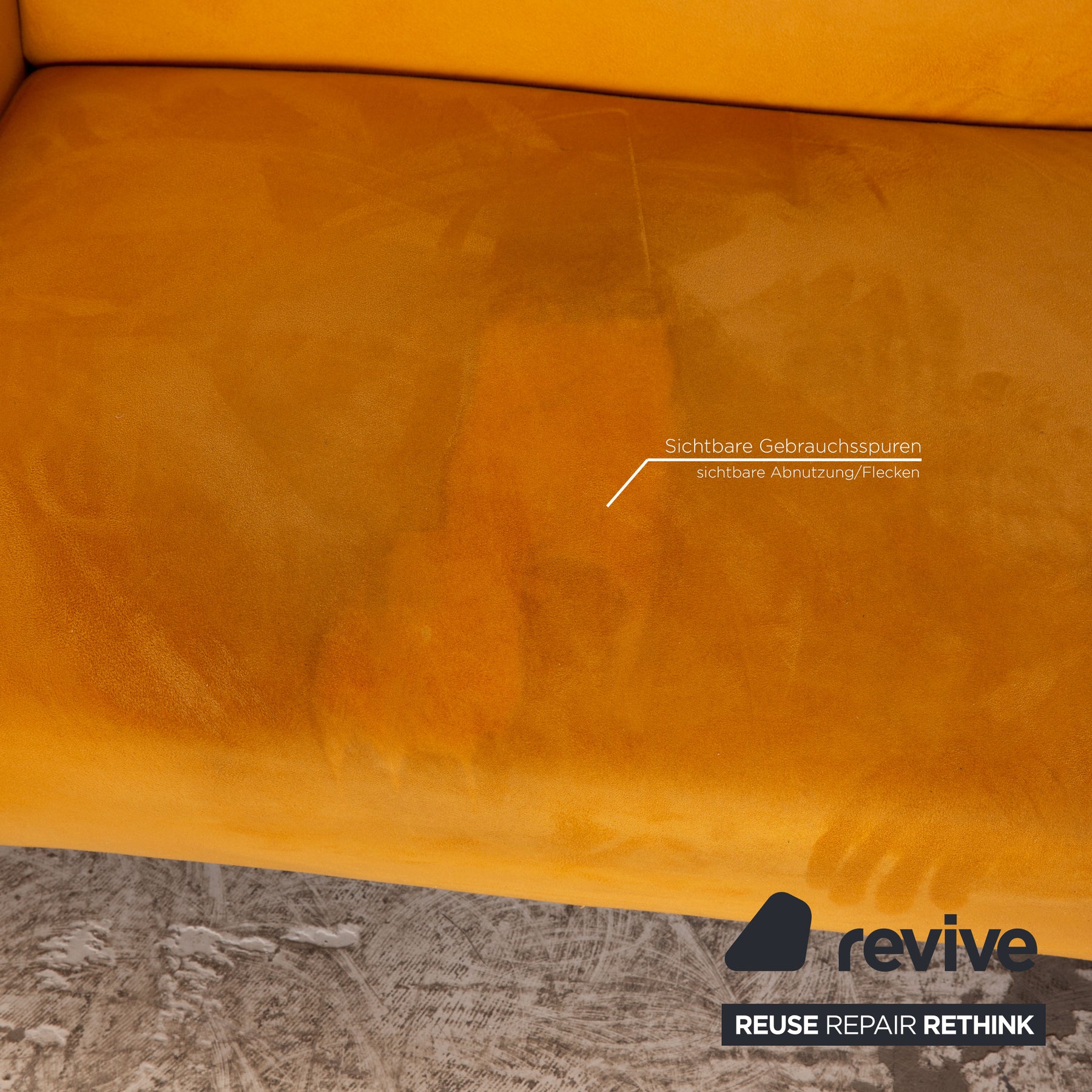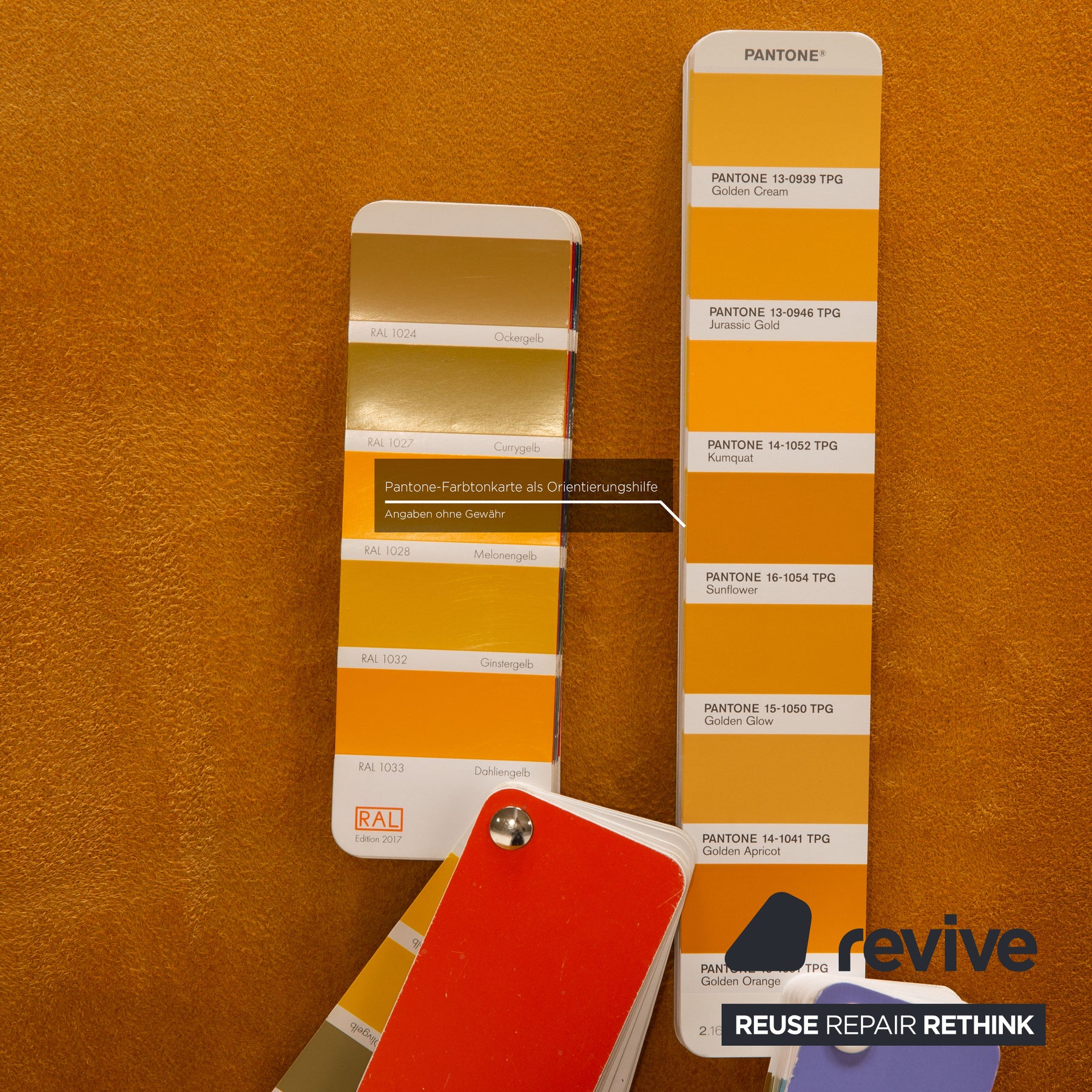 The Laaus sofa set is covered with a yellow fabric and stands on small metal feet. It convinces with its timeless design and the slanted armrests.