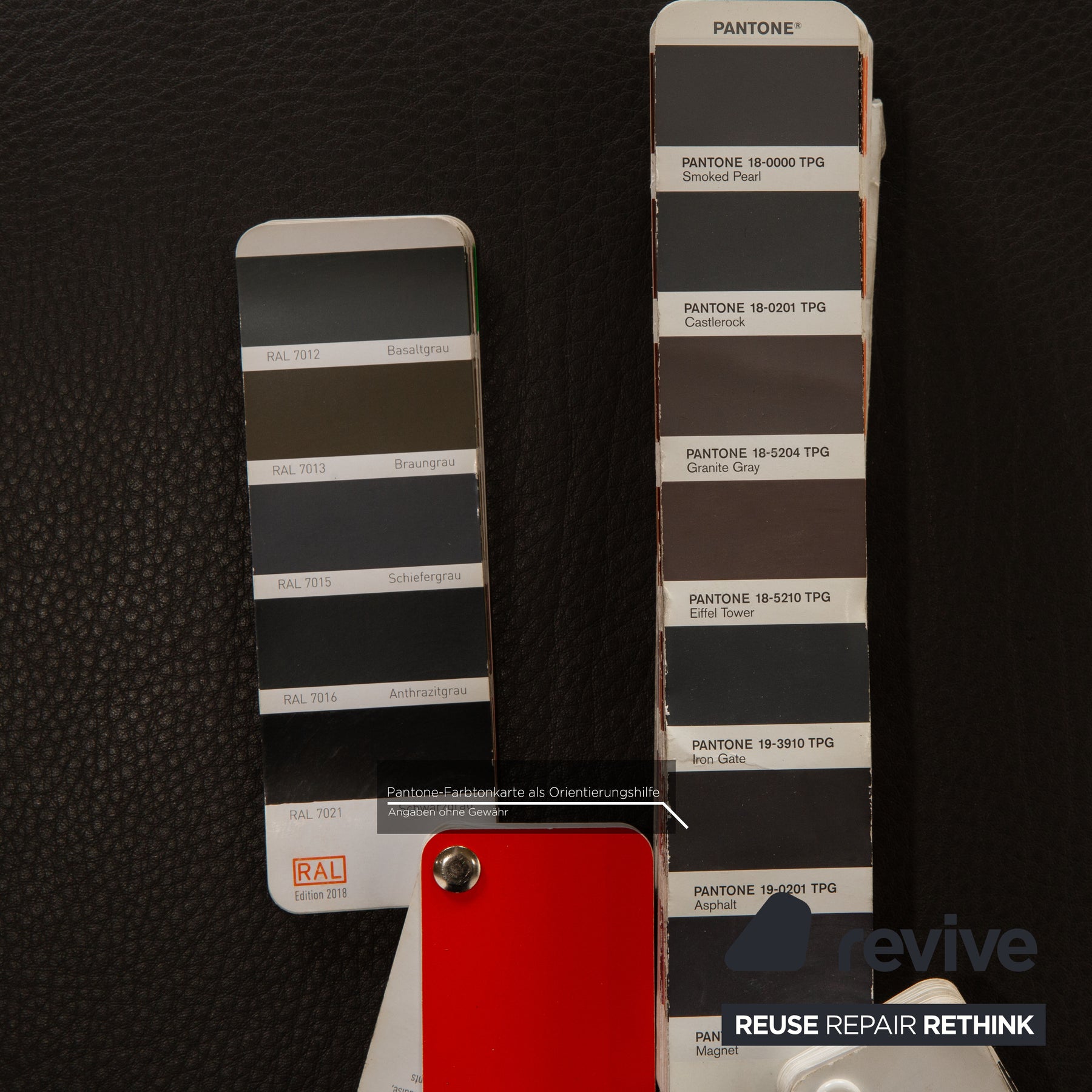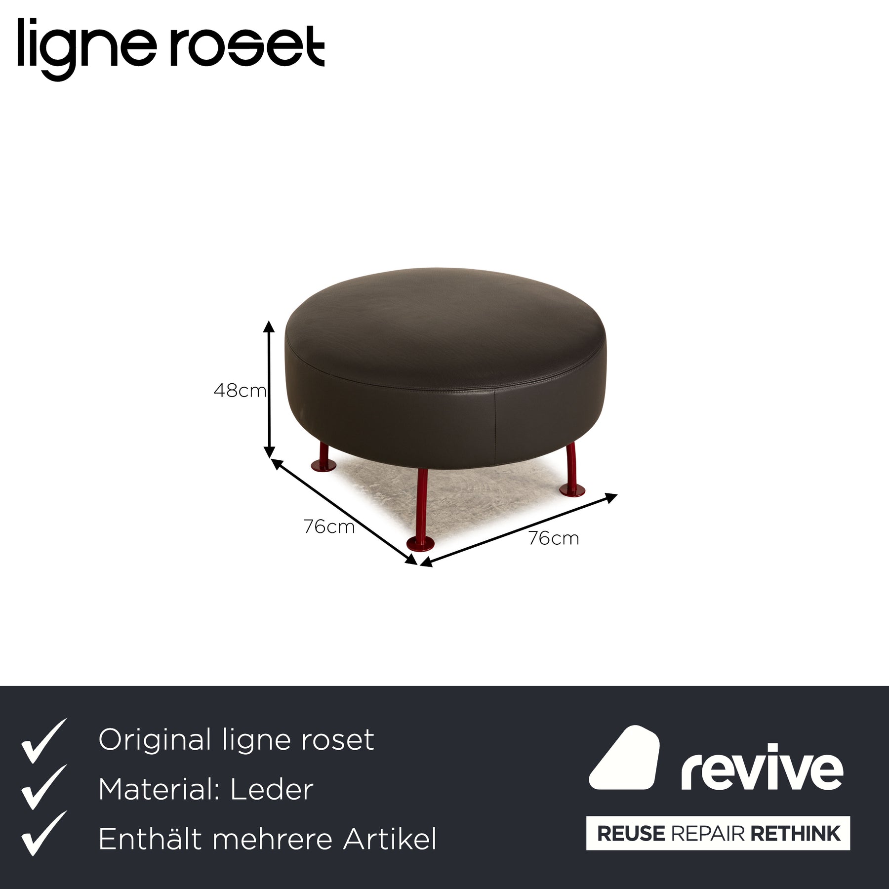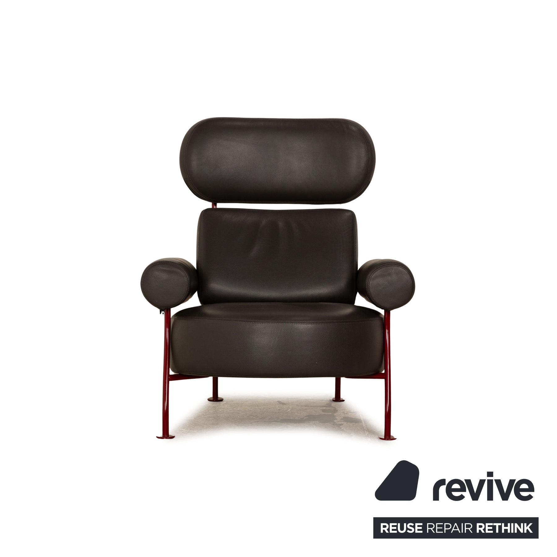The Astair armchair set from ligne roset is covered with anthracite-colored genuine leather and stands on red metal feet. It is characterized by its rounded, organic look and modern, stylish design. The set consists of an armchair and a stool.