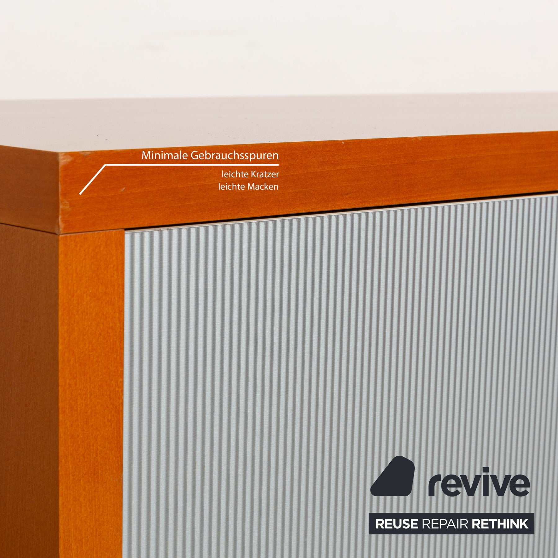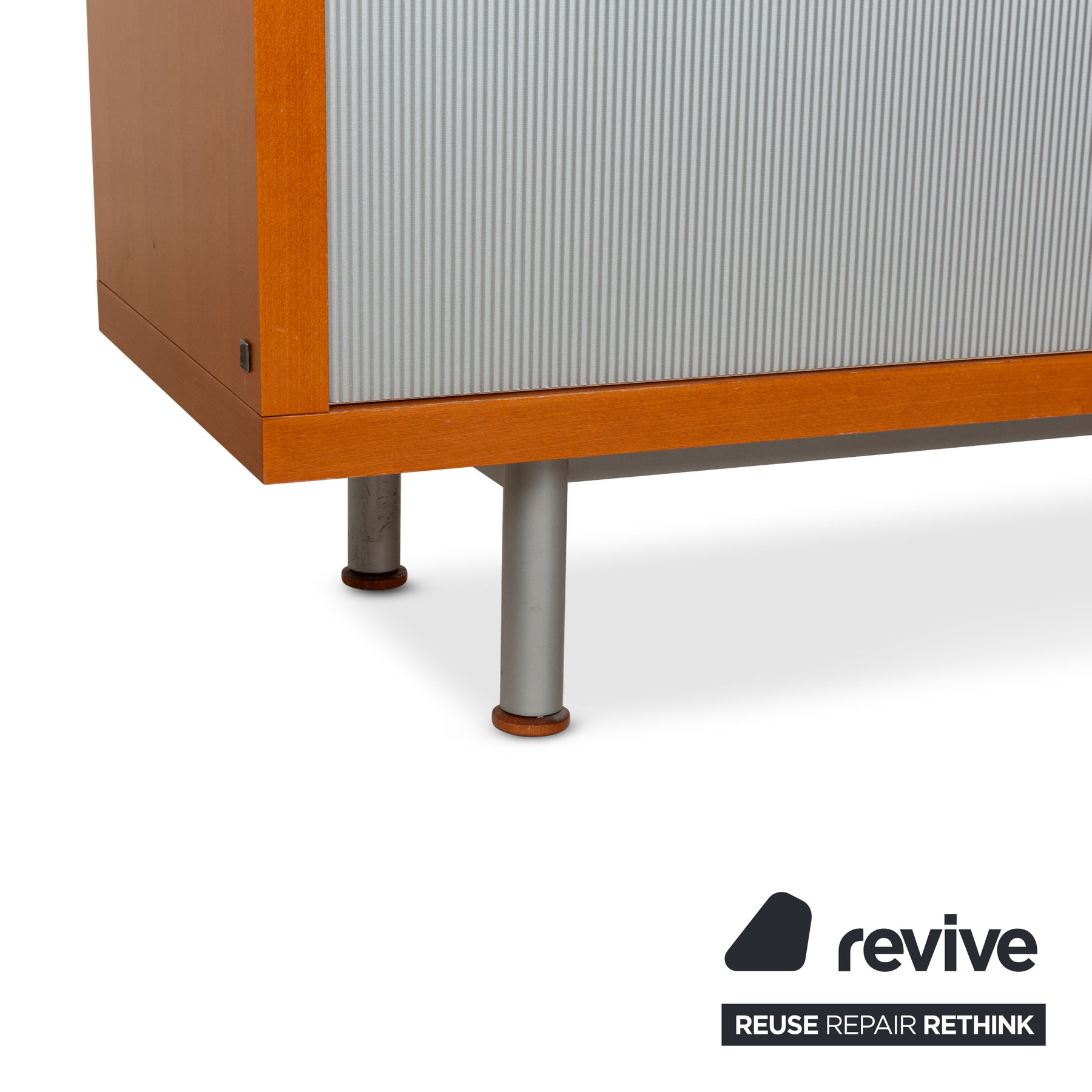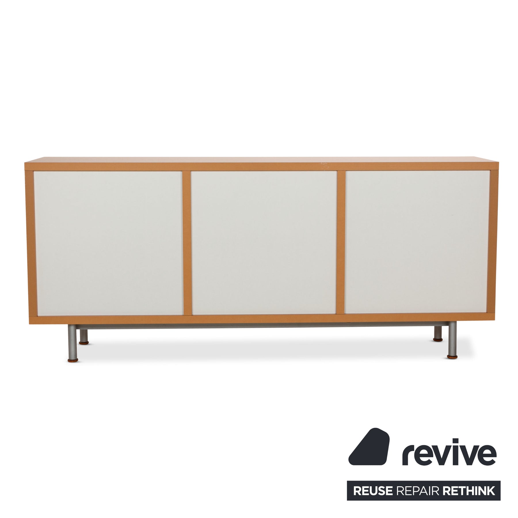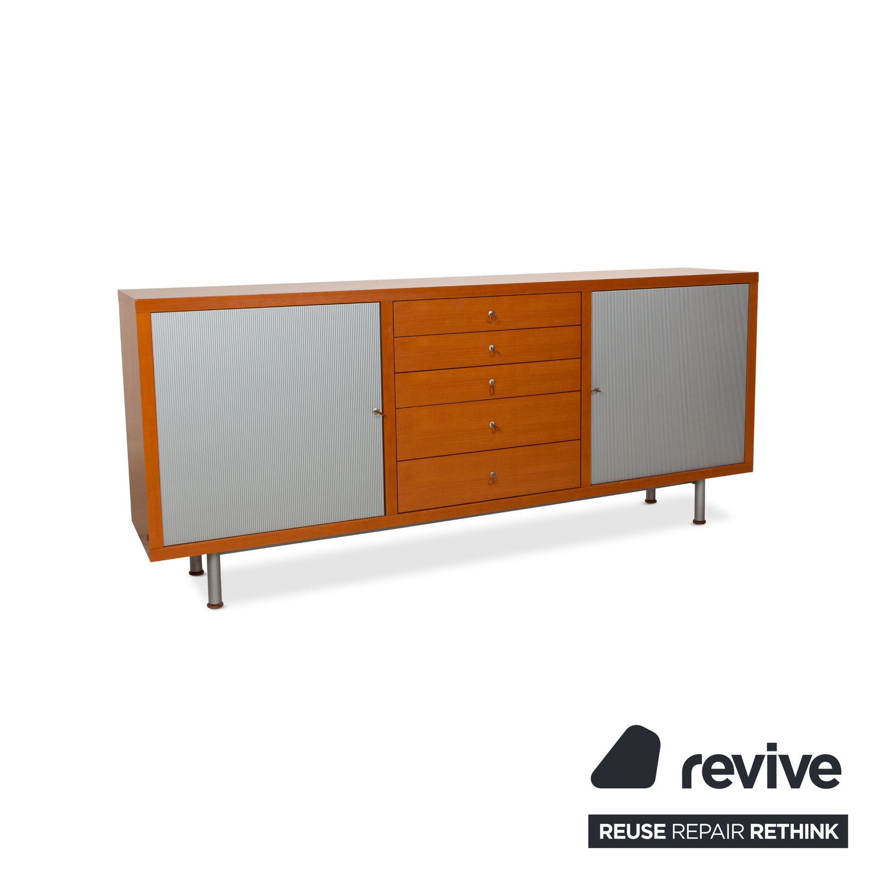 The sideboard by ligne roset is made of wood and stands on narrow metal legs. The classic design and large, cleverly divided storage space characterize this piece of furniture. It has two cupboard compartments with interior shelves and five drawers.