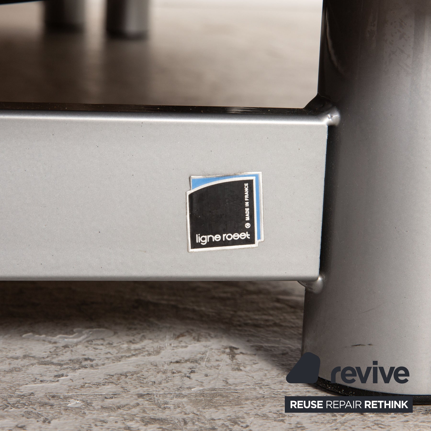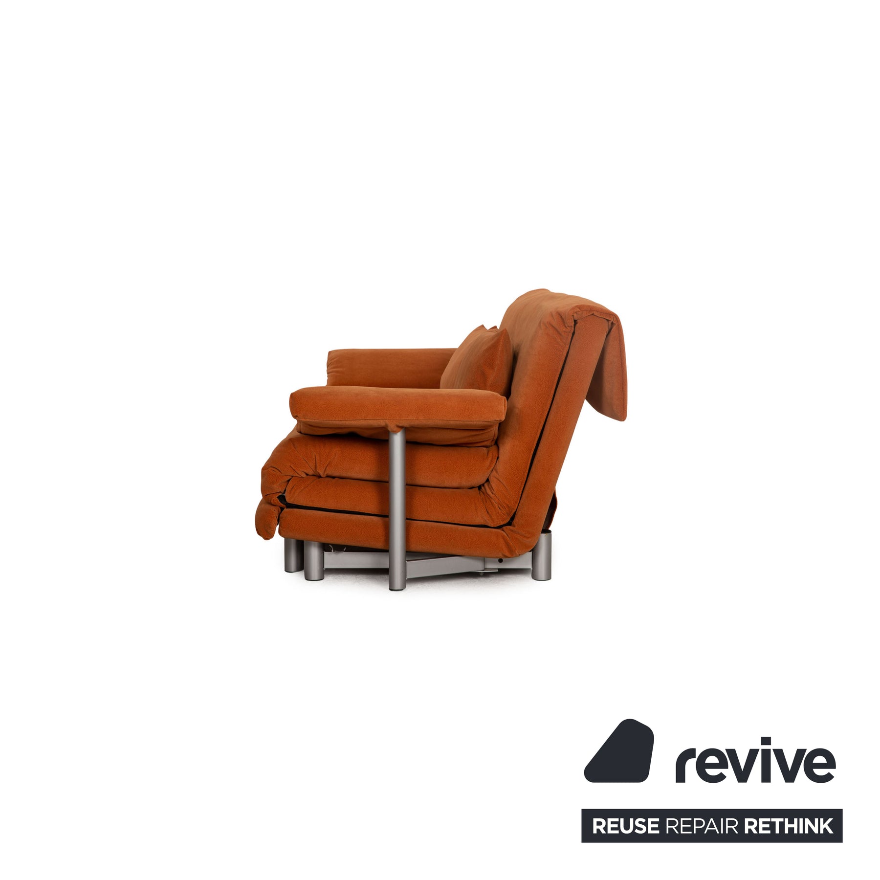 The Multy sofa from ligne roset is reupholstered with an orange fabric (PELLINI 144 (Longlife) SOPO base layer: 80% polyester, 20% cotton wear layer: 100% polyamide) and stands on round metal feet. The simple design and the comfortable sleeping function characterize the three-seater.