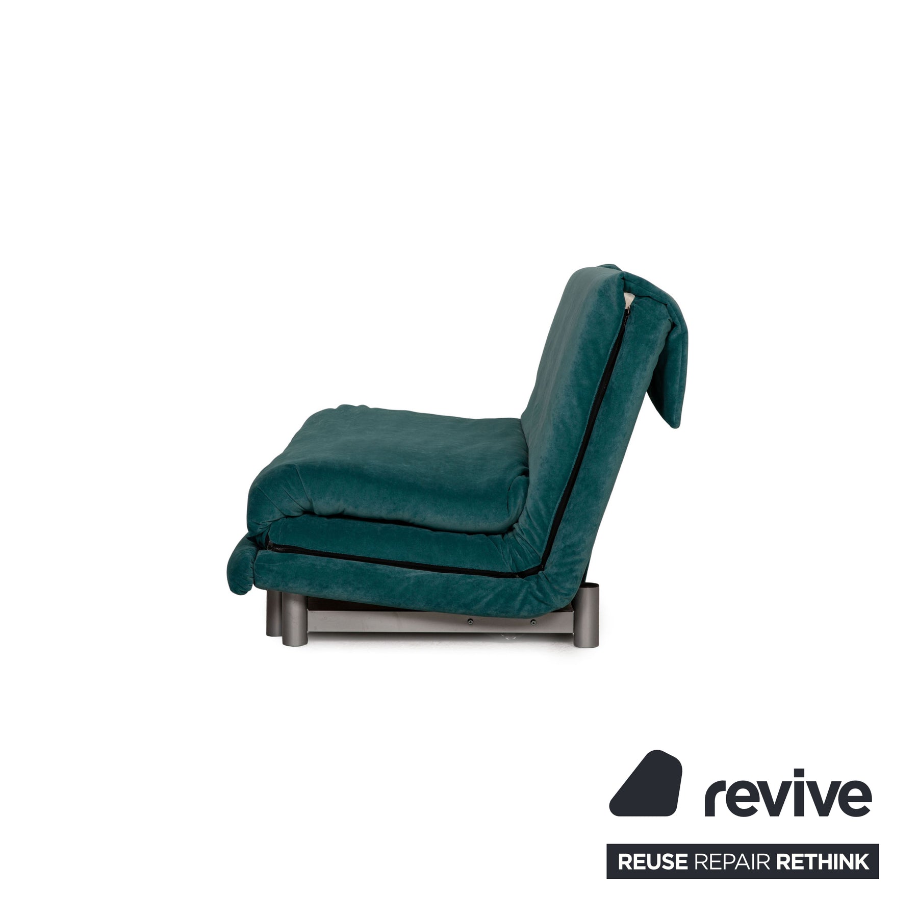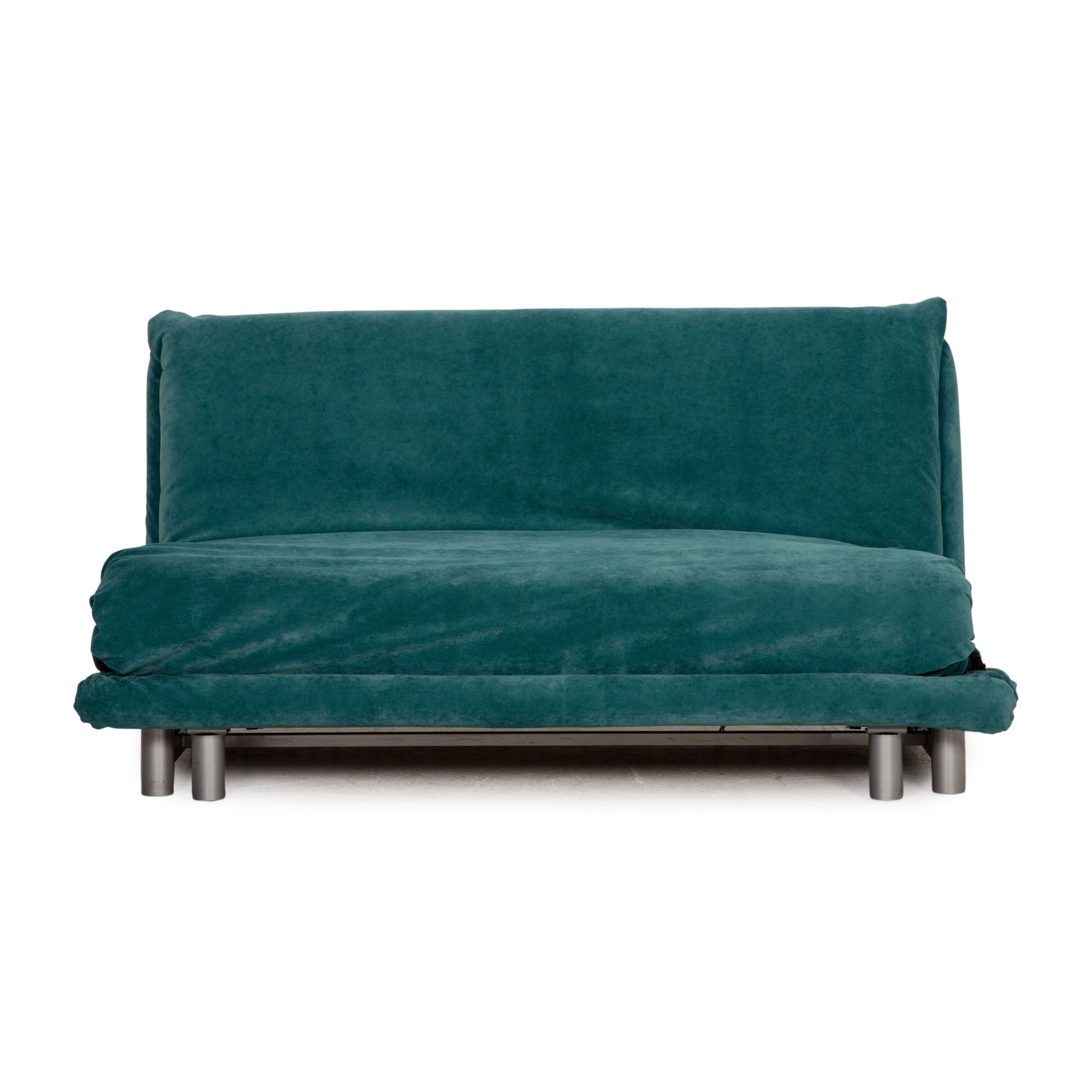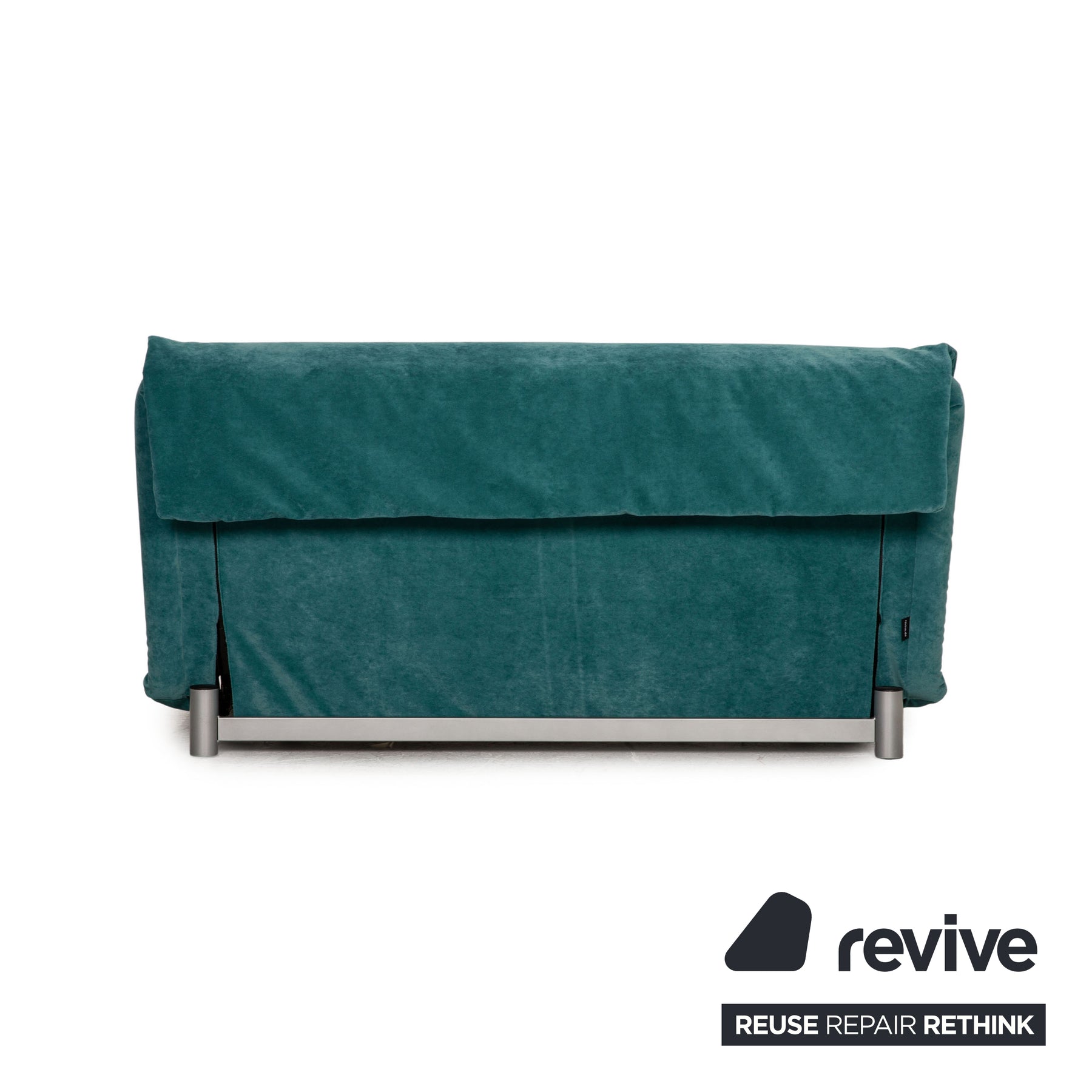 The Multy sofa from ligne roset has been reupholstered with a turquoise fabric (CONTEMPO 119 (Longlife) SOPO base layer: 80% polyester, 20% cotton wear layer: 100% polyamide) and stands on round, silver feet. The minimalist design and the comfortable sleeping function characterize the two-seater.