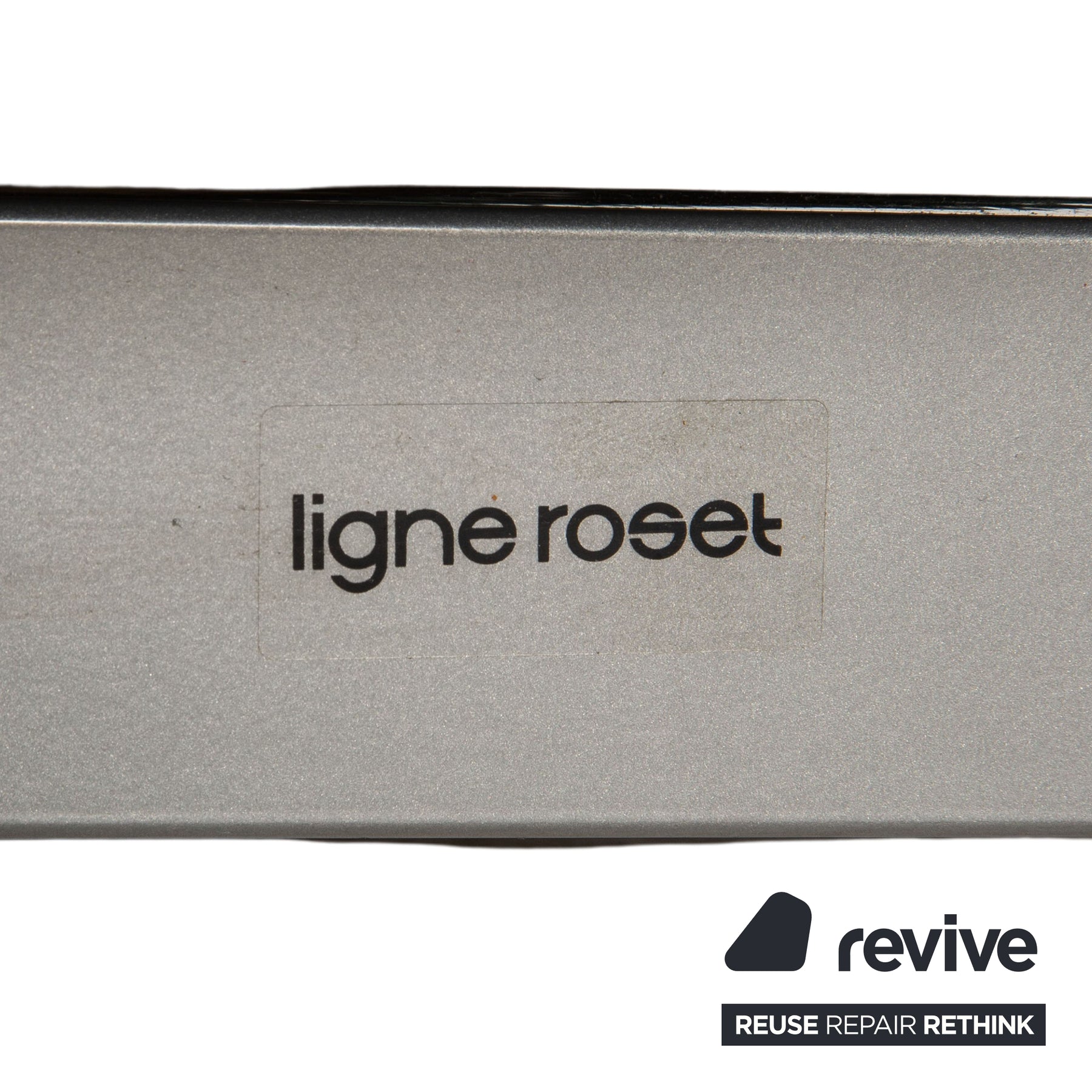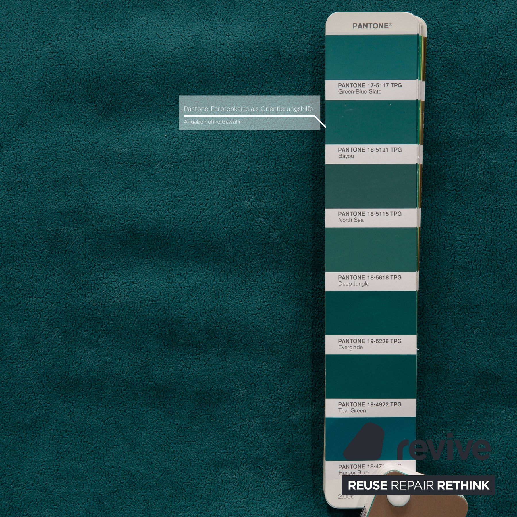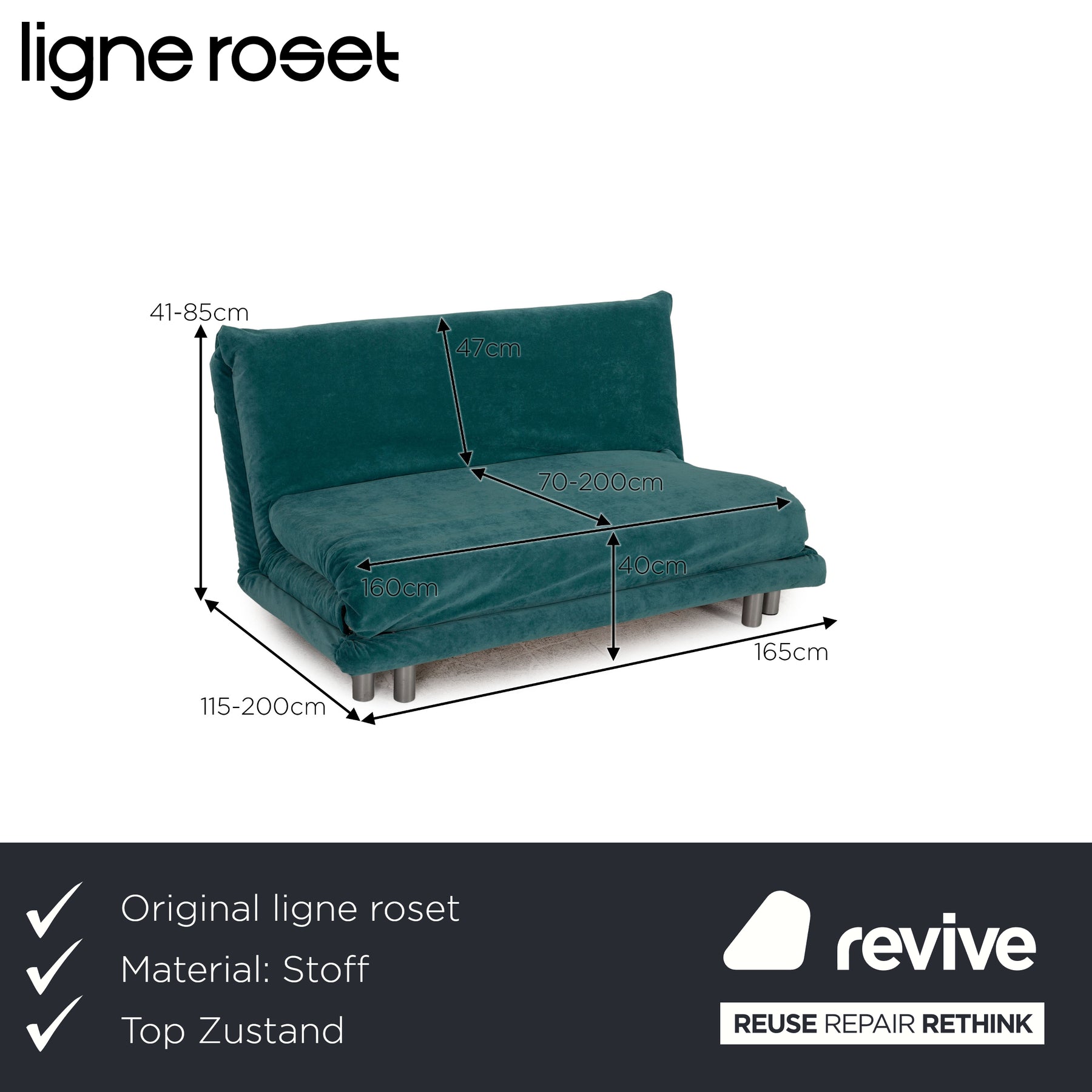 The Multy sofa from ligne roset has been reupholstered with a turquoise fabric (CONTEMPO 119 (Longlife) SOPO base layer: 80% polyester, 20% cotton wear layer: 100% polyamide) and stands on round, silver feet. The minimalist design and the comfortable sleeping function characterize the two-seater.