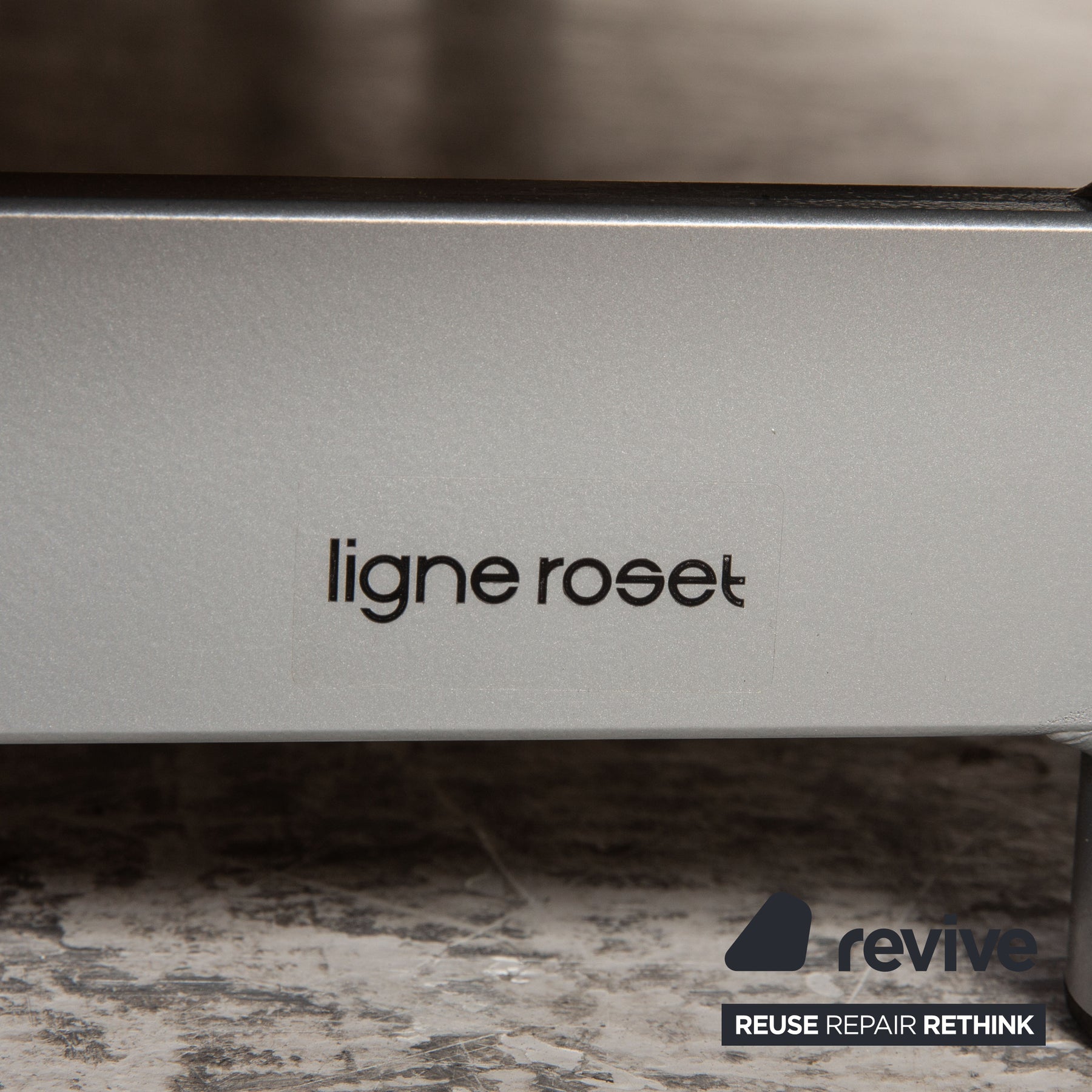 The three-seater Multy by ligne roset is upholstered in beige fabric and stands on silver metal feet. It is characterized by the comfortable sleeping function and the simple, minimalistic look.