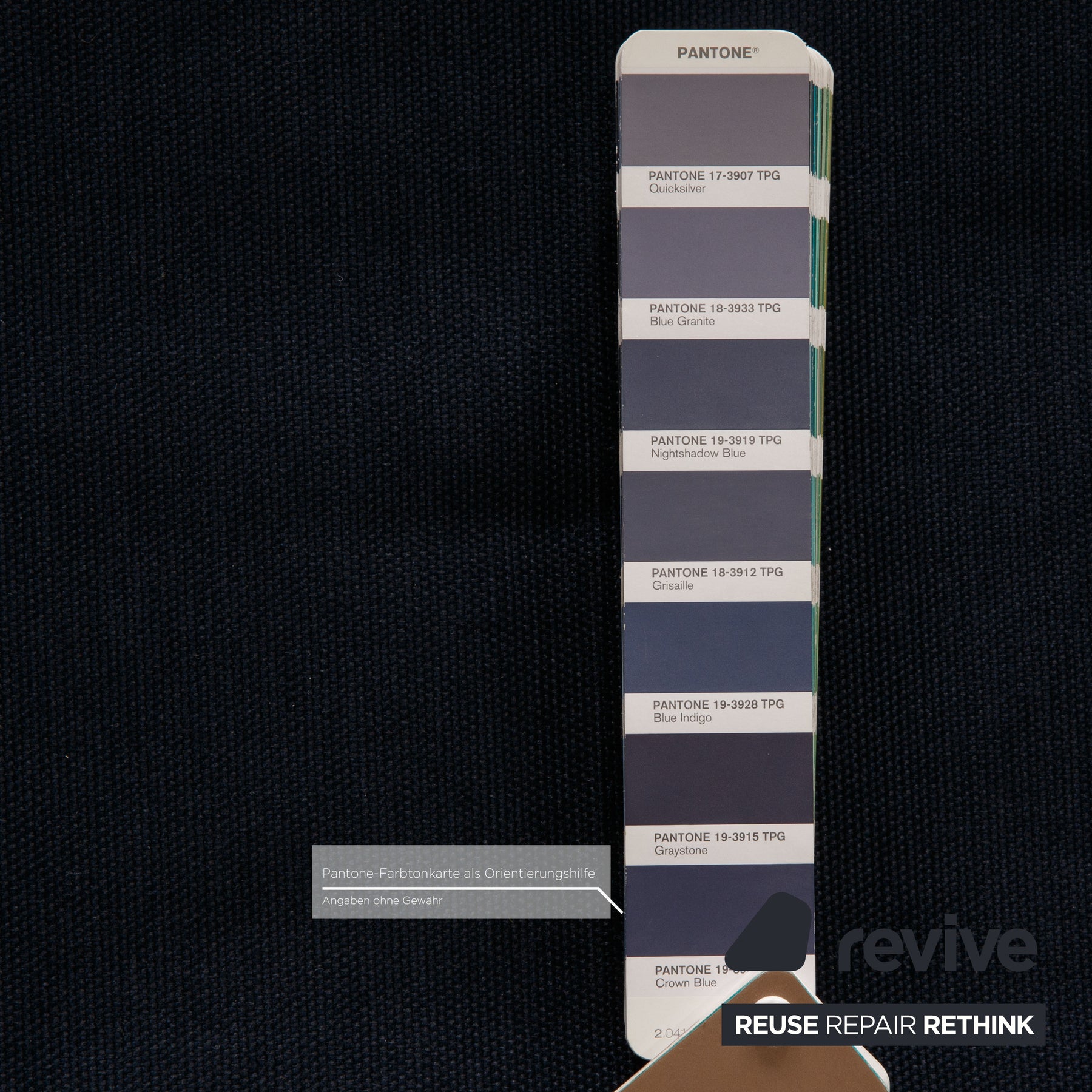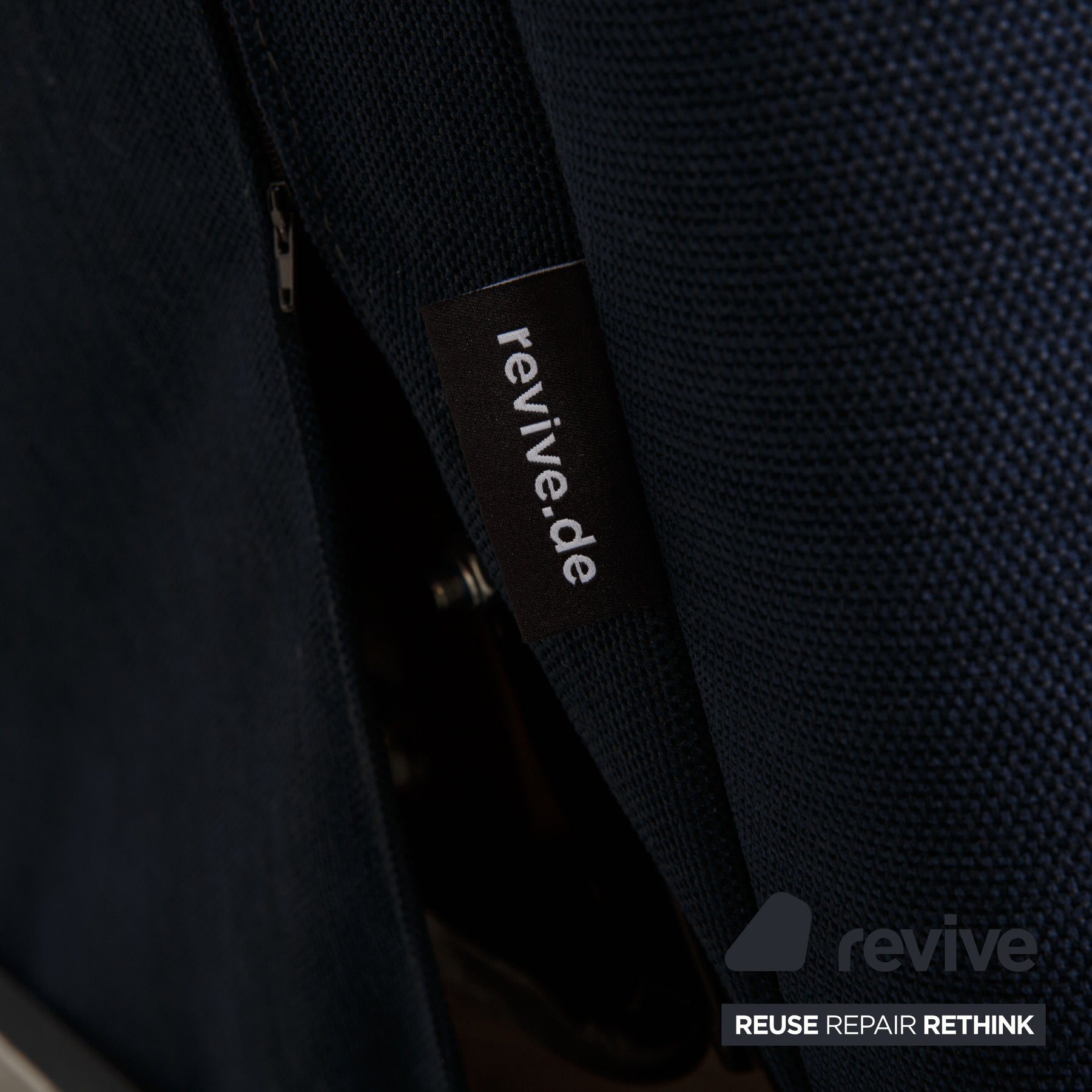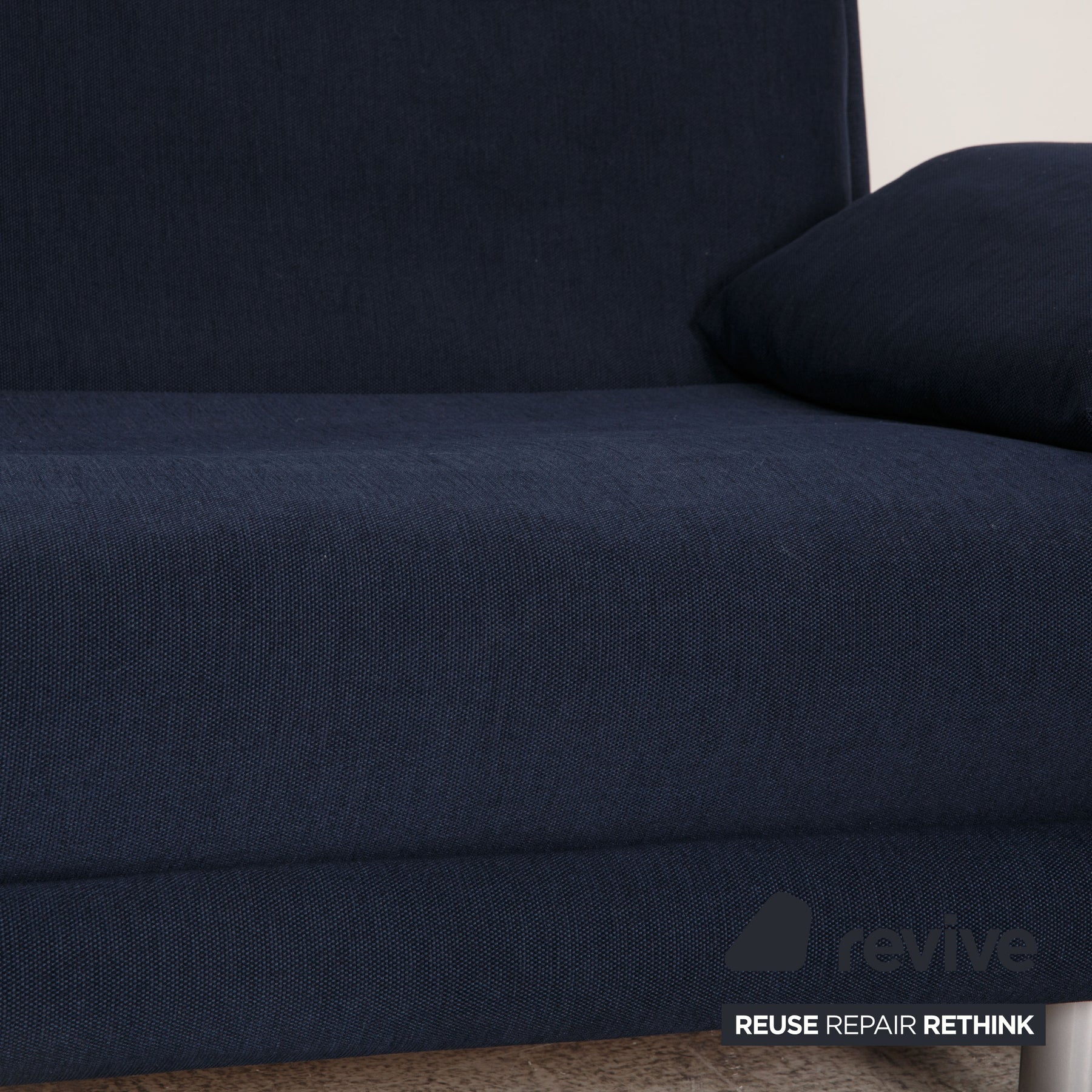 The Multy sofa from ligne roset is reupholstered with a blue fabric (JOOP! BASIC FLAT 805-690 So.Po. uni FL Material: 100% polyester) and stands on silver metal feet. The timeless design and the comfortable sleeping function characterize the two-seater.