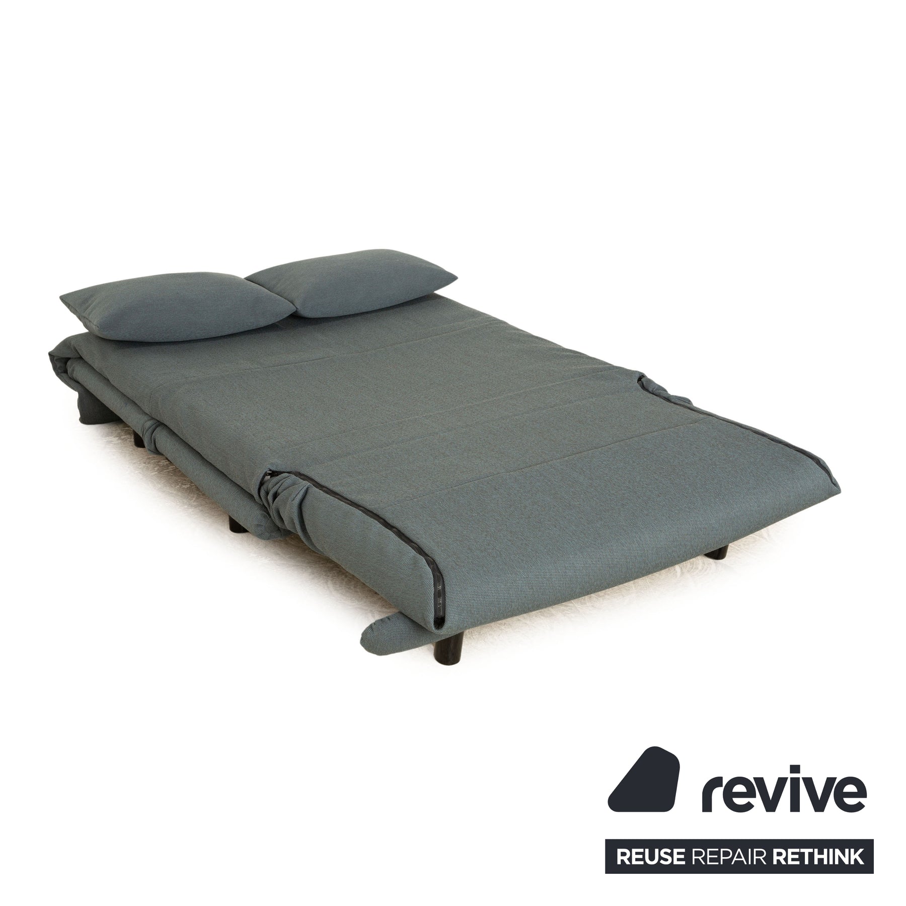 The Multy sofa from ligne roset is reupholstered in a blue fabric and stands on round feet. The minimalist design and the practical sleeping function characterize the two-seater.