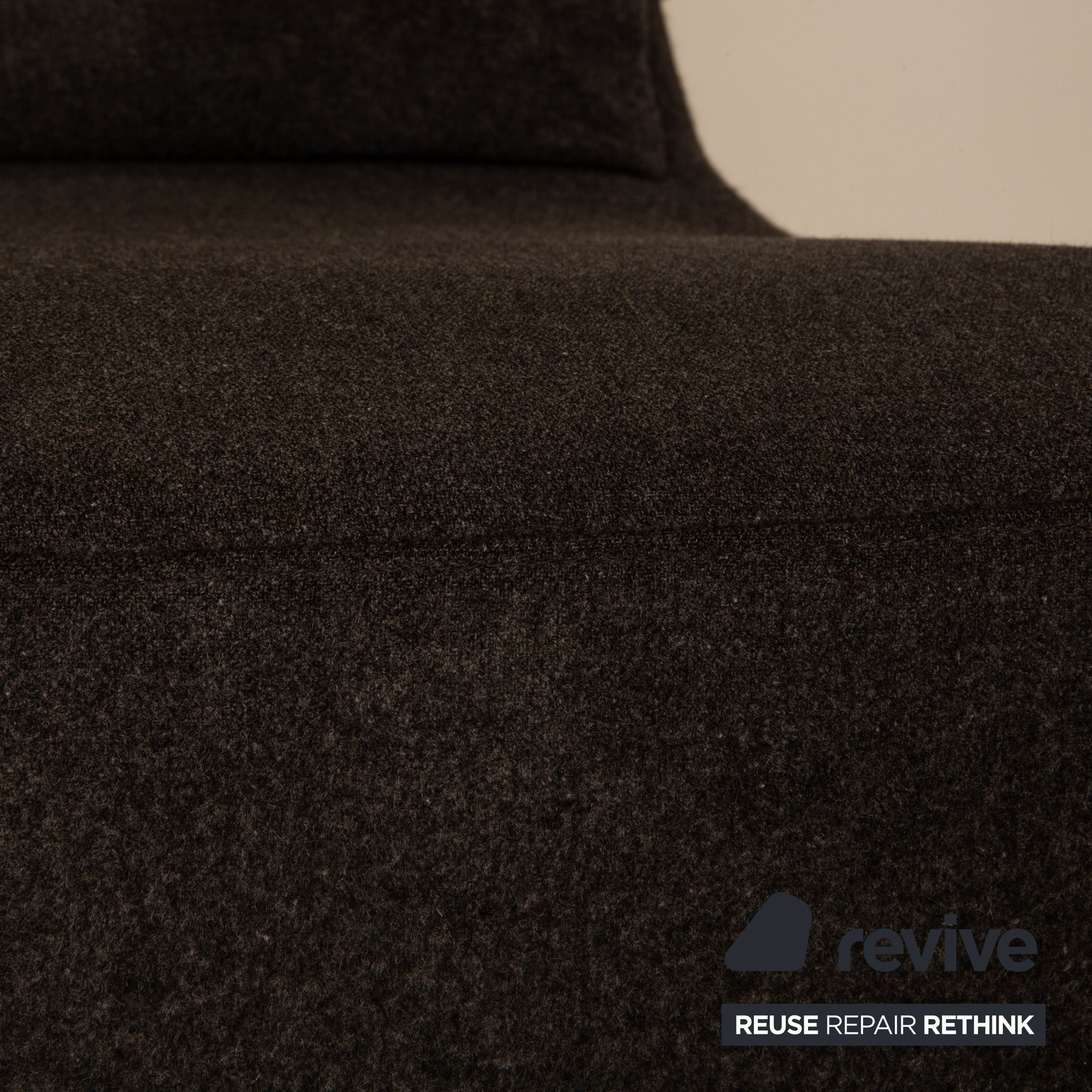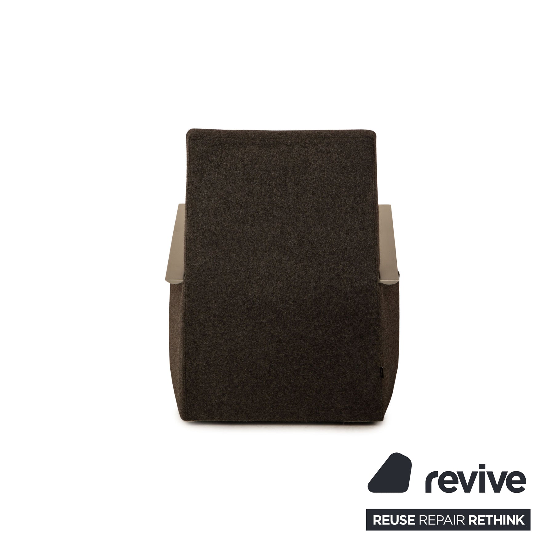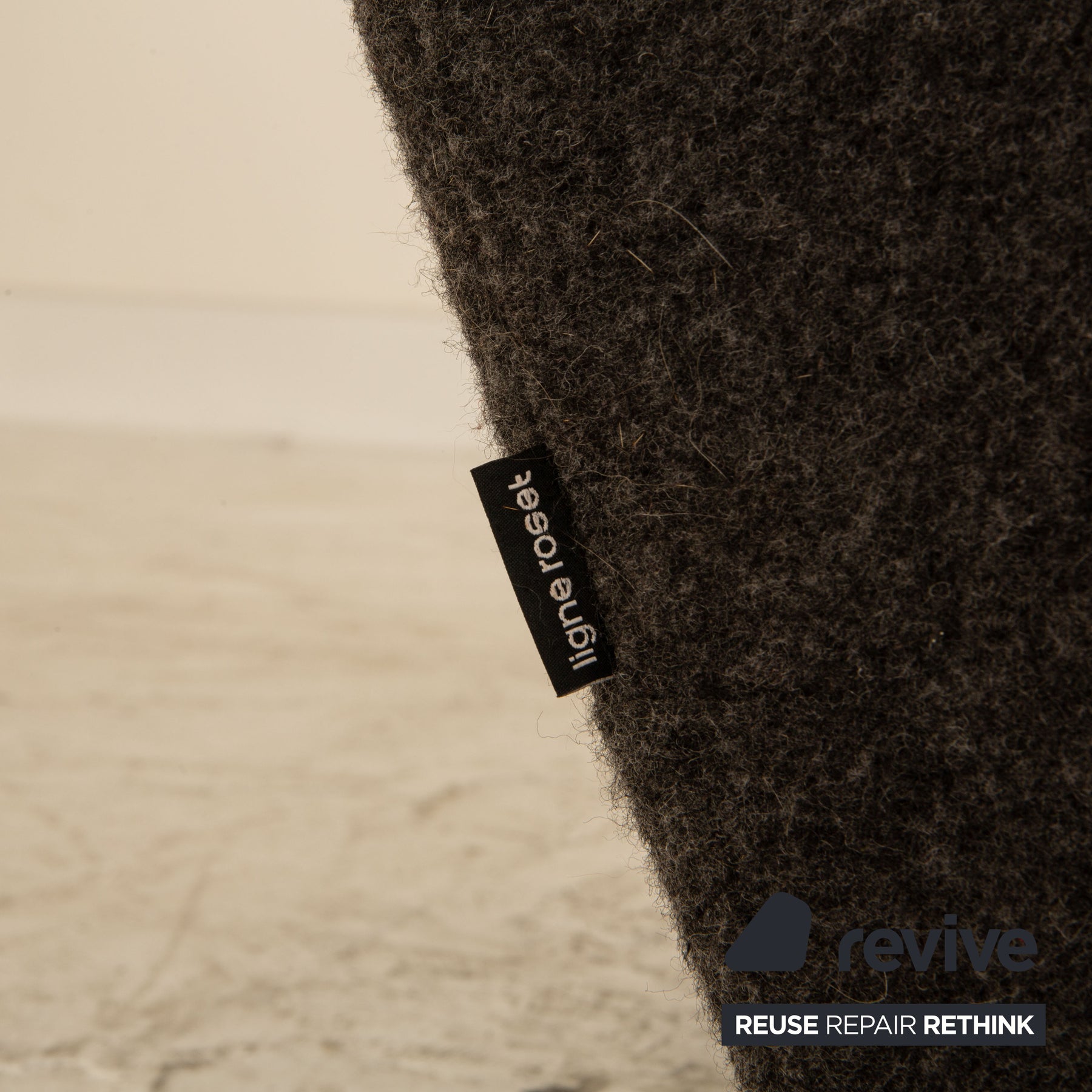 The Neo armchair by ligne roset is upholstered in a gray fabric and is floor-to-ceiling. The practical armrests and the simple design distinguish it.