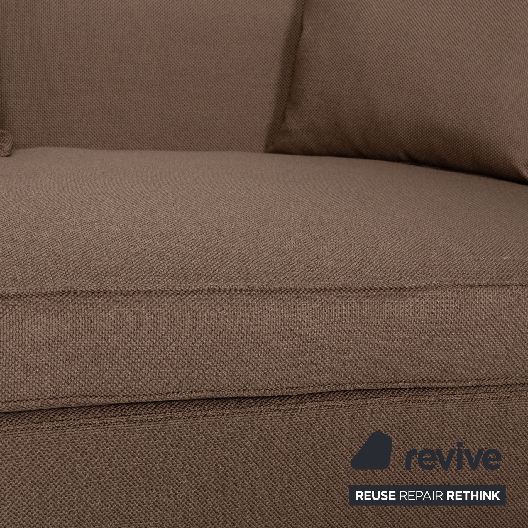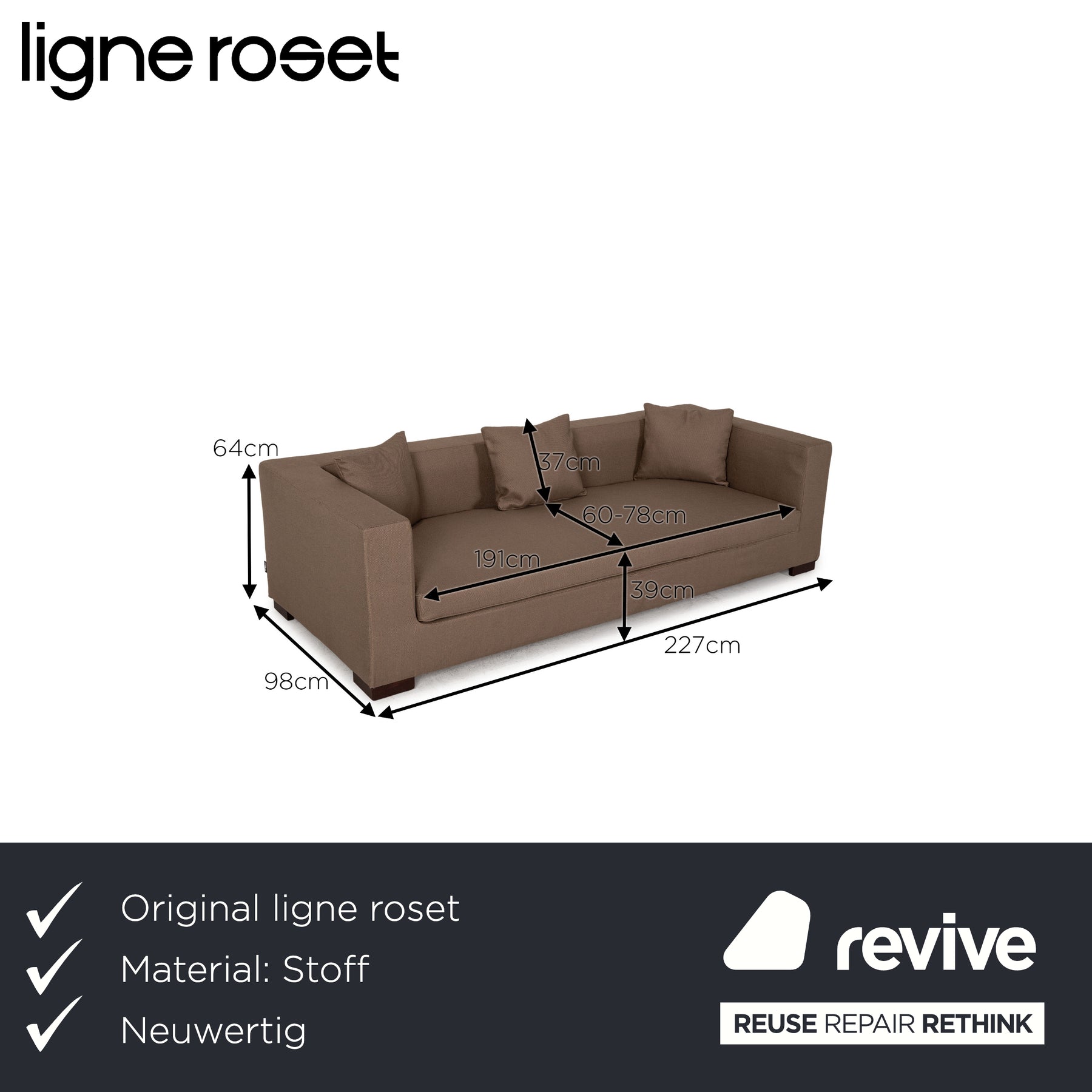 The three-seater Rive Gauche by ligne roset has been reupholstered with an olive green fabric and stands on black feet. It is characterized by the compact, minimalist design and the additional decorative cushions.