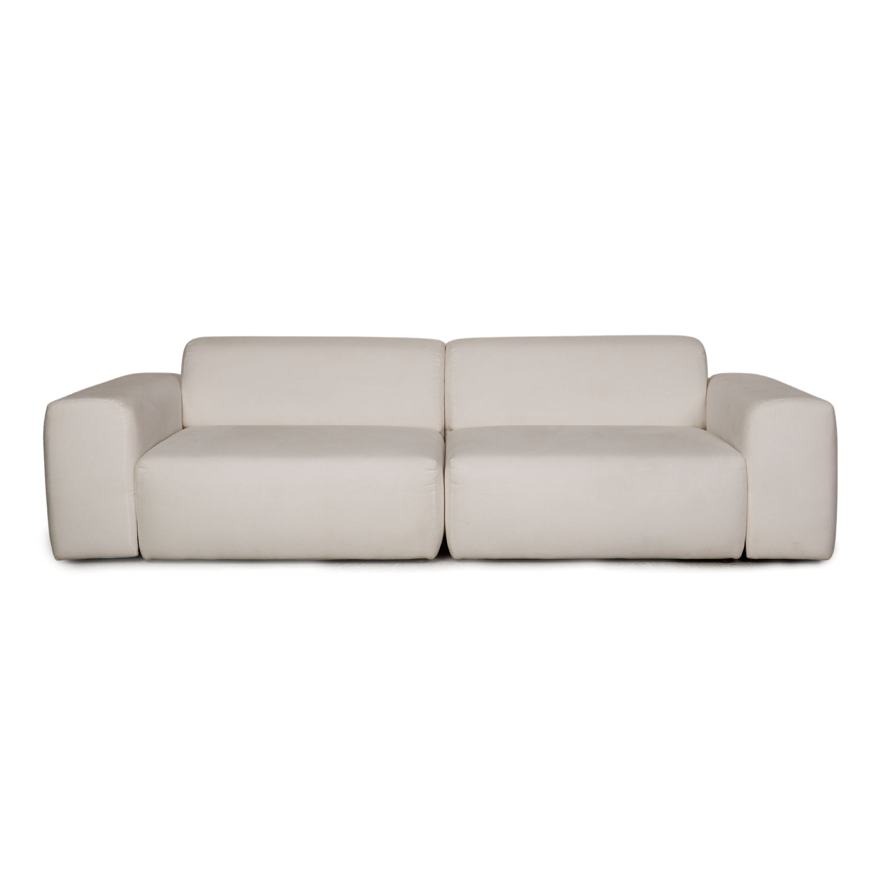 The PYLLOW sofa by MYCS is upholstered in a white fabric and is floor-to-ceiling. The timeless, minimalist design and the straight lines characterize the three-seater.