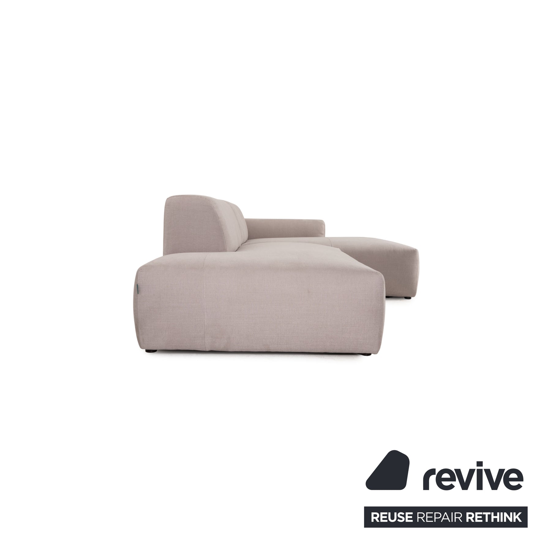 The PYLLOW sofa by MYCS is upholstered in a gray fabric and stands on unobtrusive black feet. The minimalist, timeless design and the rounded edges characterize the corner sofa.
