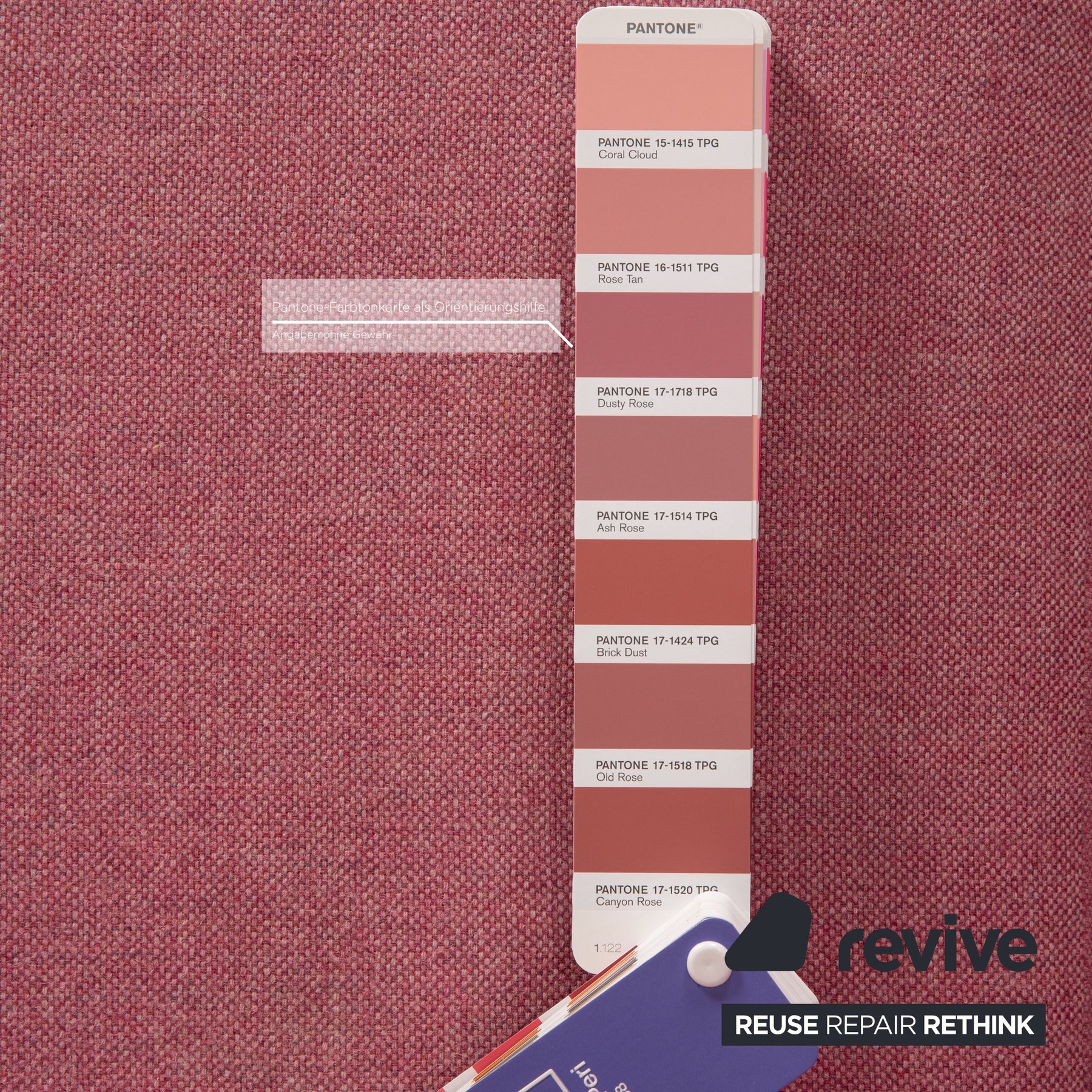 The MYCS TYME sofa is upholstered in a pink fabric and stands on wooden feet. The simple design and the eye-catching color characterize the corner sofa.