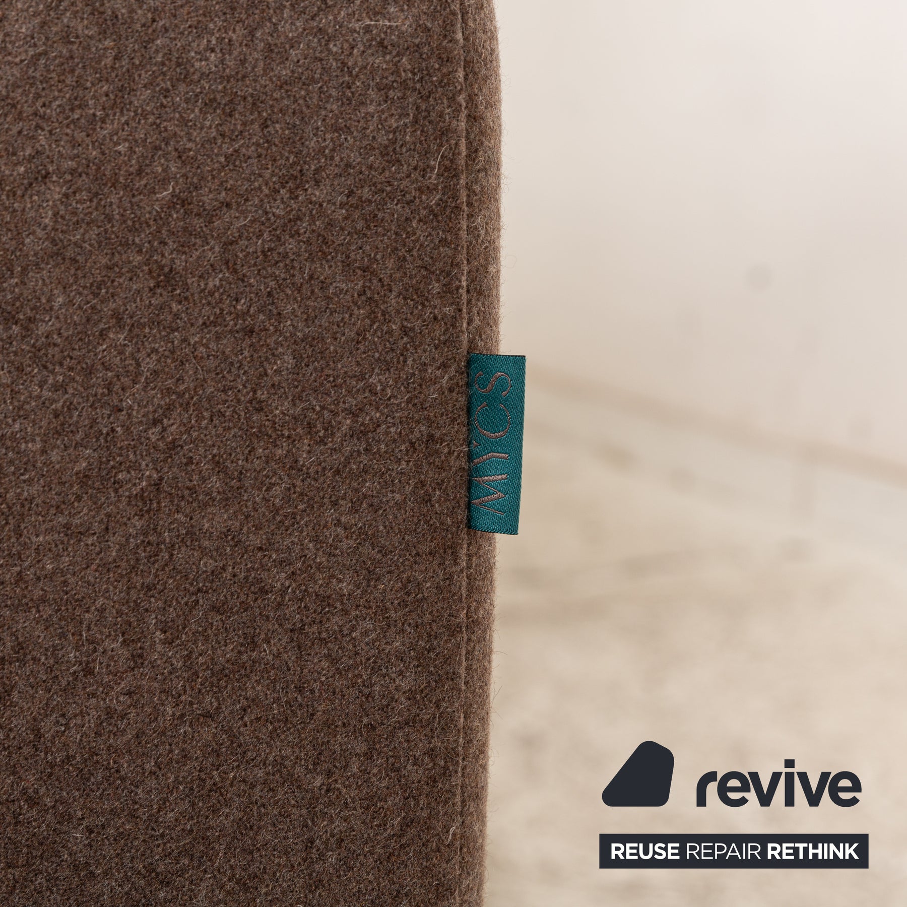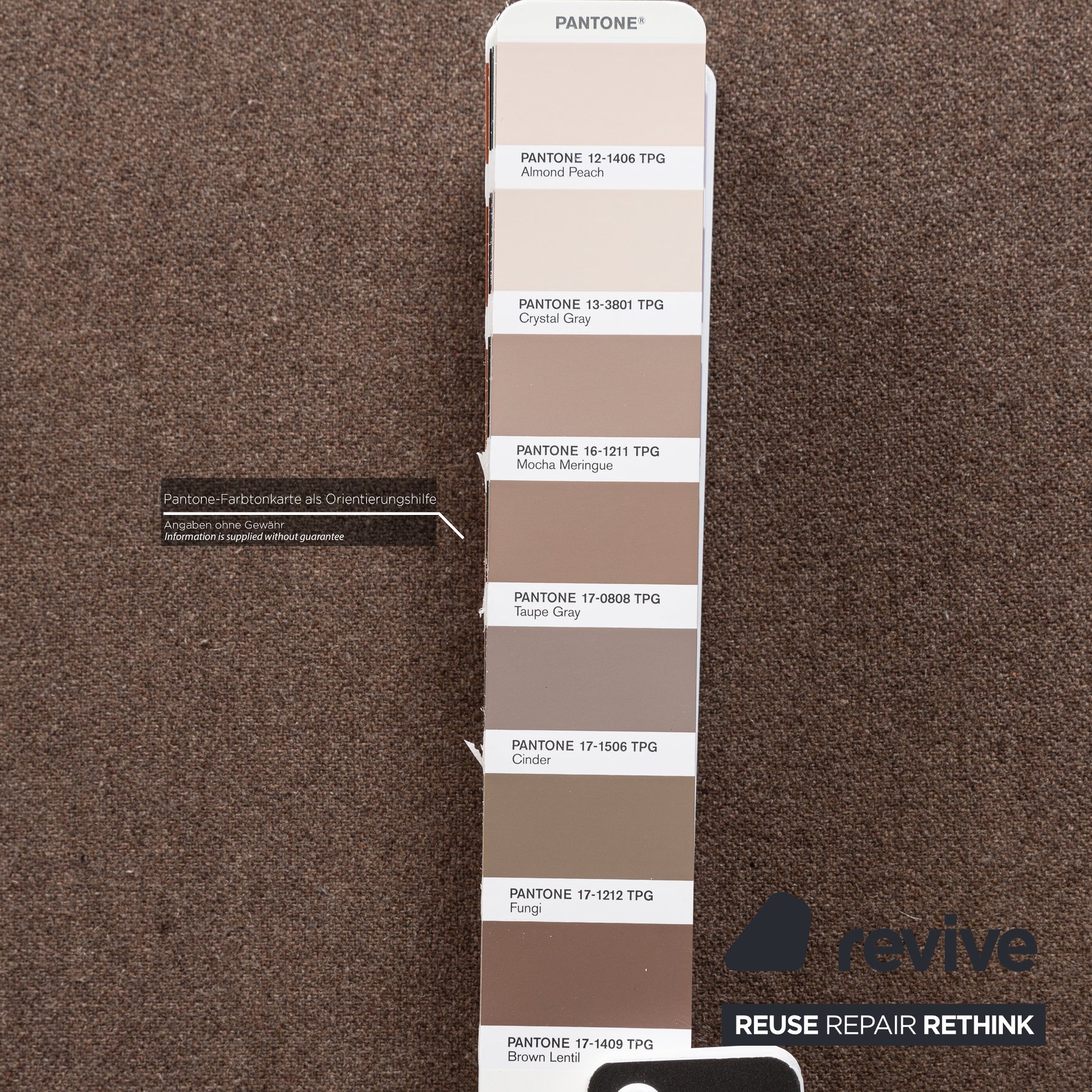The TYME corner sofa from MYCS is covered with a brown fabric and stands on silver metal feet. It is characterized by its simple, minimalist design and stylish appearance.