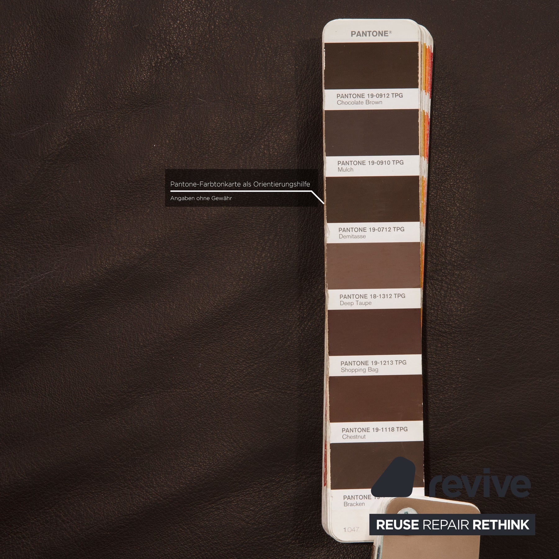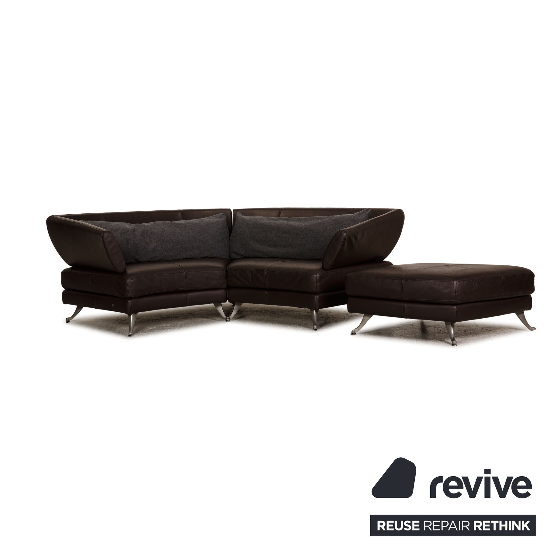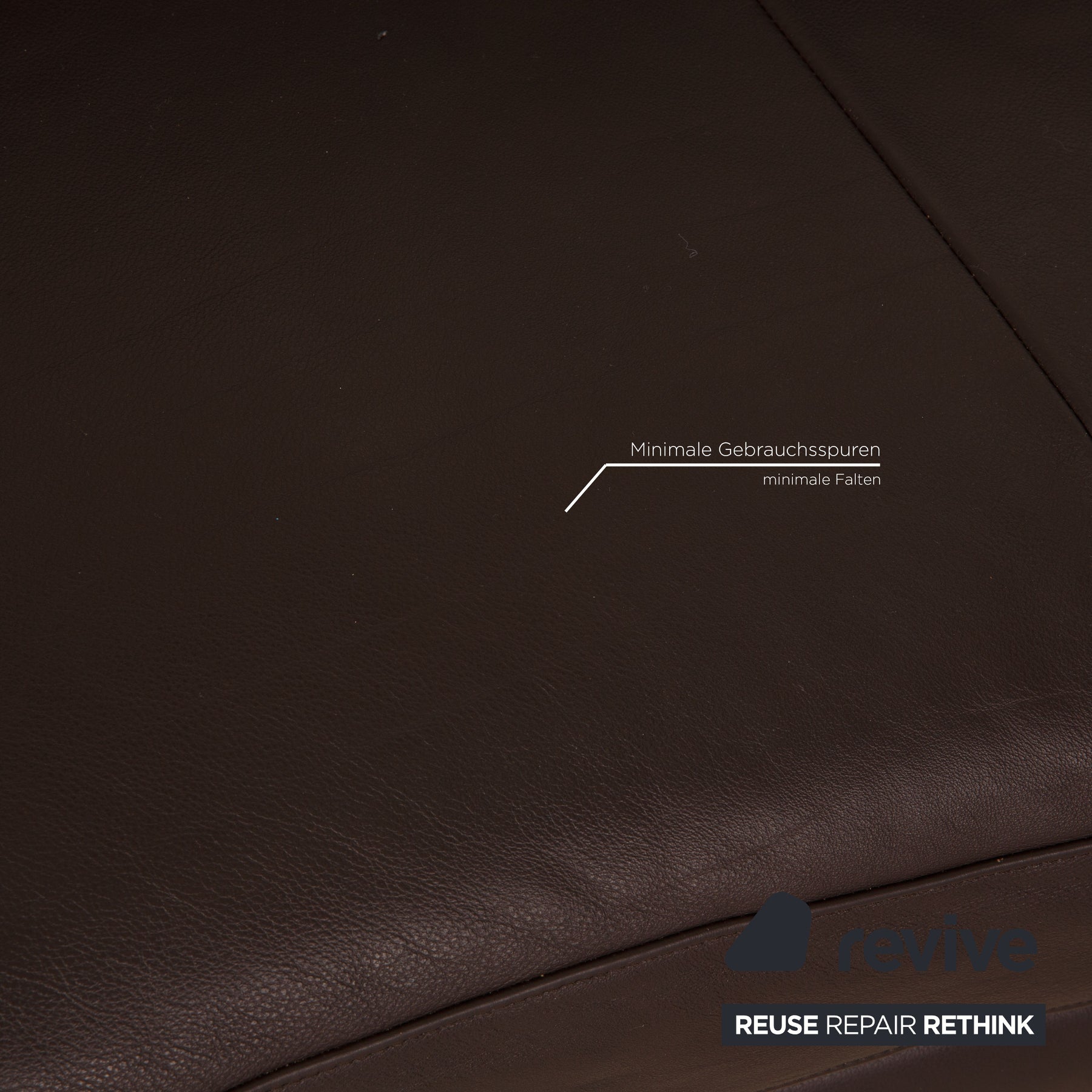 The 222 sofa by Rolf Benz is upholstered in brown genuine leather and stands on silver metal feet. The modern, timeless design and the versatile side stool characterize the corner sofa.