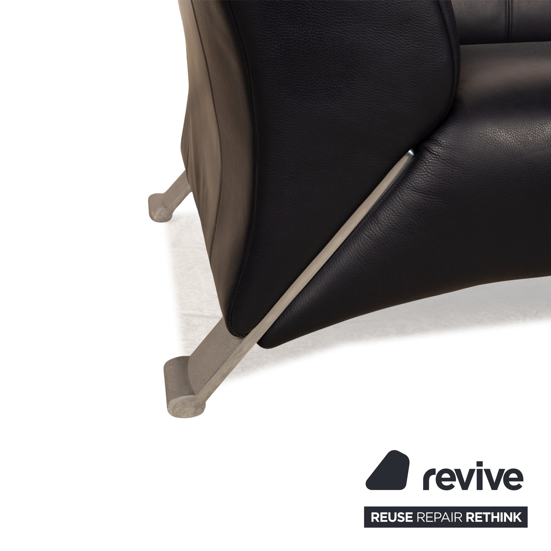 The 322 sofa by Rolf Benz is covered in dark blue genuine leather and stands on silver metal feet. The modern design and rounded edges characterize the three-seater.