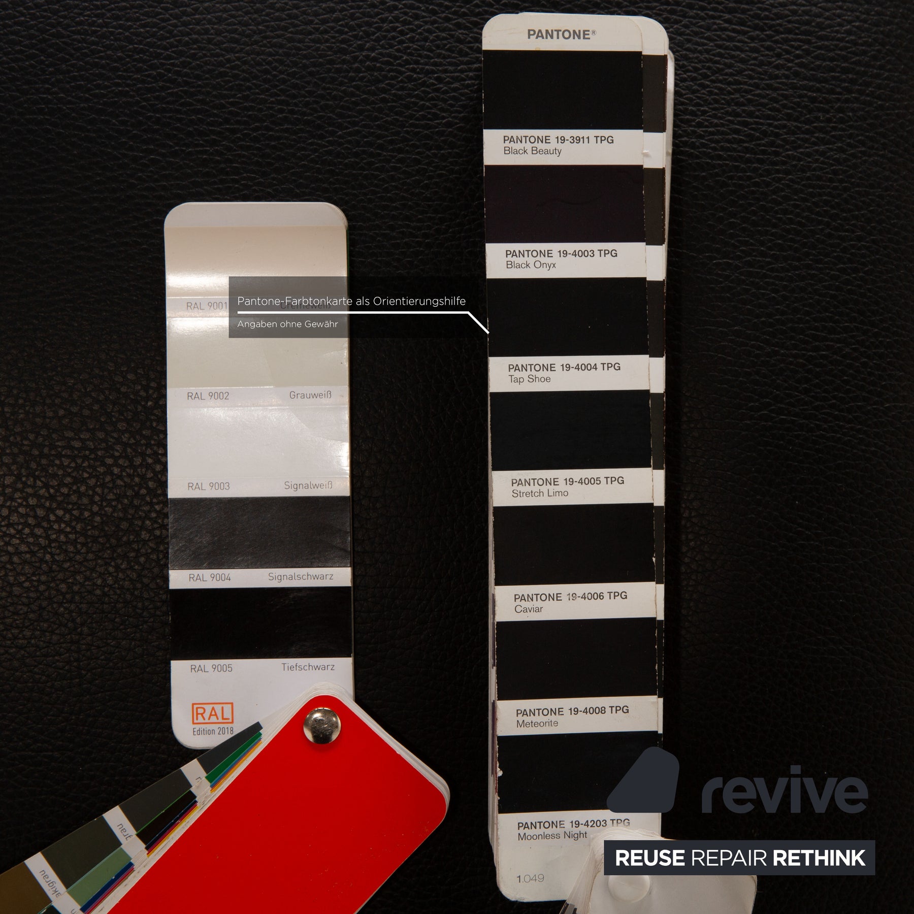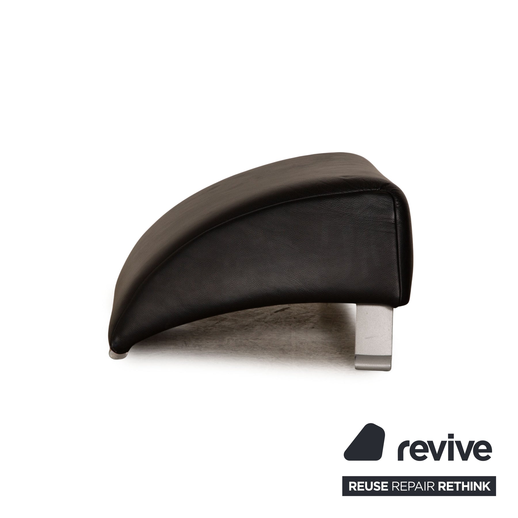 The 322 stool by Rolf Benz is covered in black genuine leather and stands on metal feet. The rounded design sets it apart.