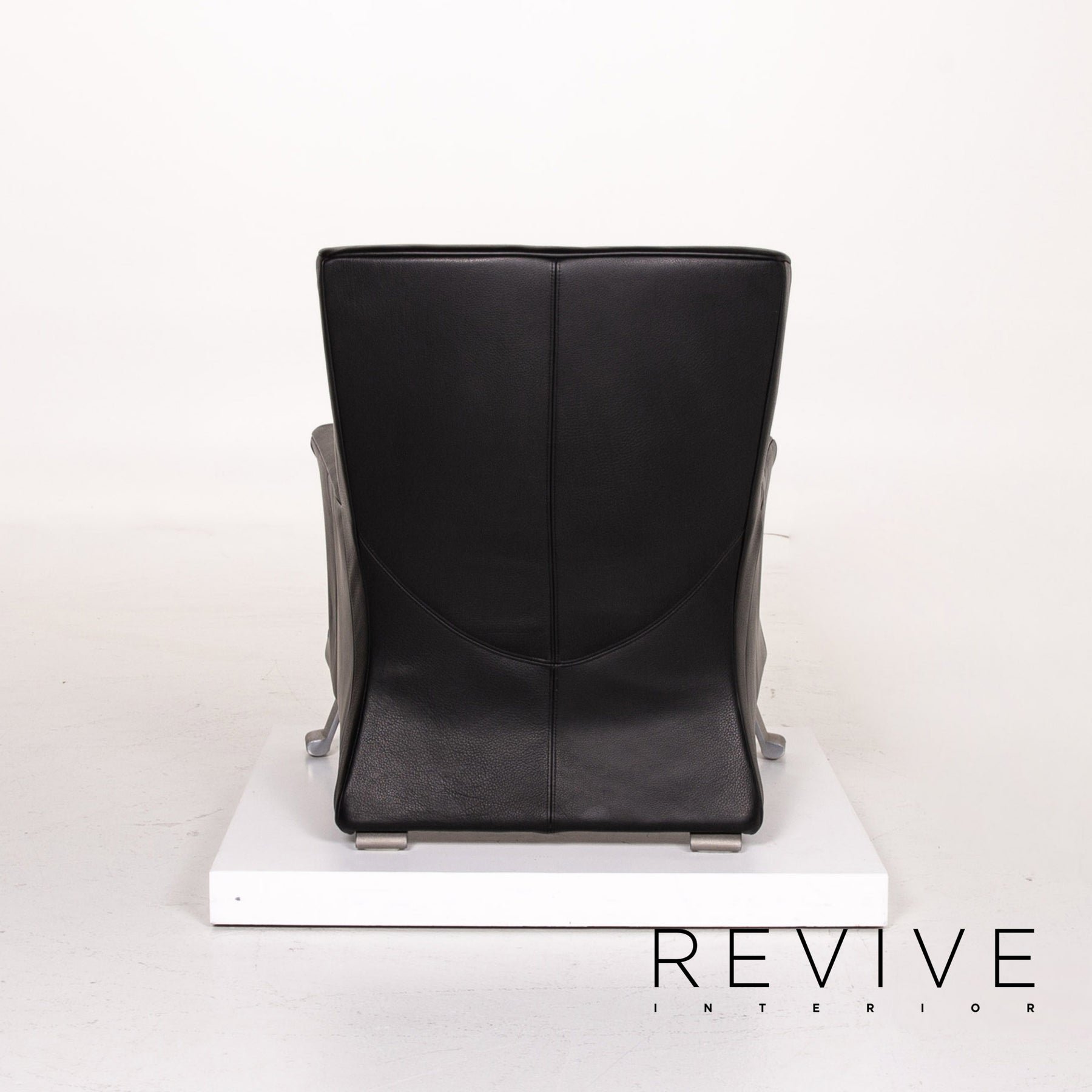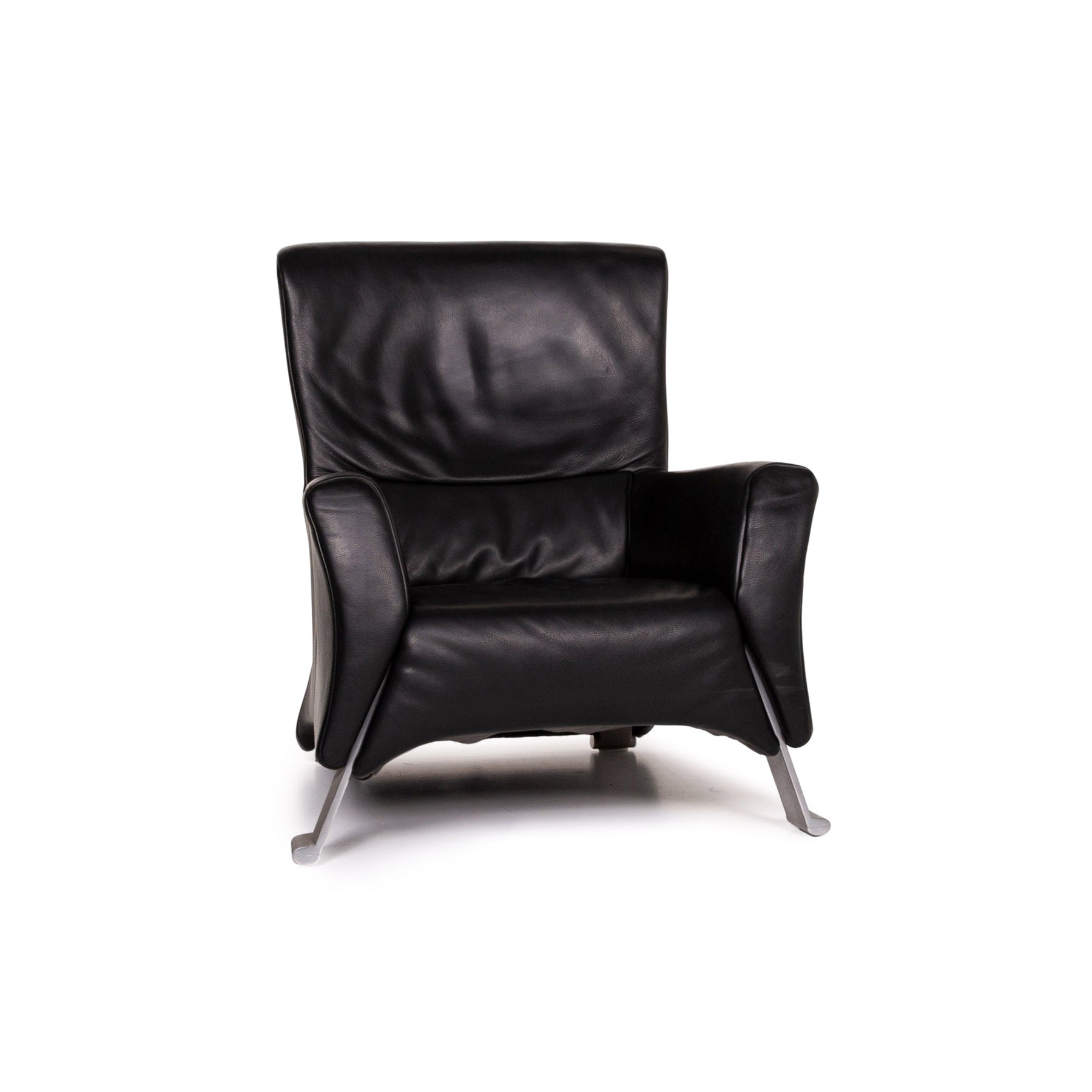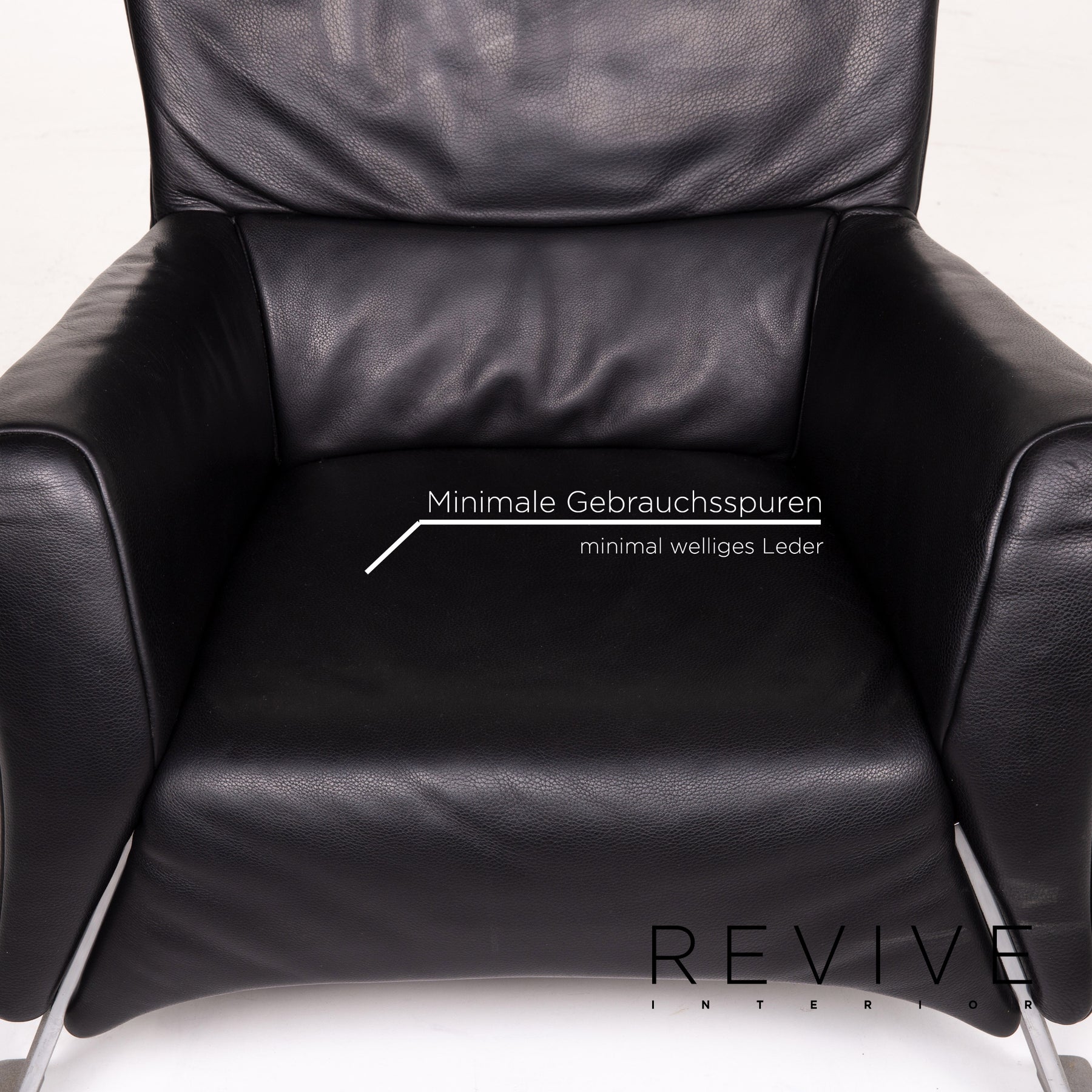 The 322 armchair from Rolf Benz, covered with smooth black leather, is a classic where the compact body meets soft lines. The slanting aluminum feet of the armchair and the outwardly curved backrests ensure dynamism. The medium-firm seating comfort ensures stability and relaxation in equal measure.