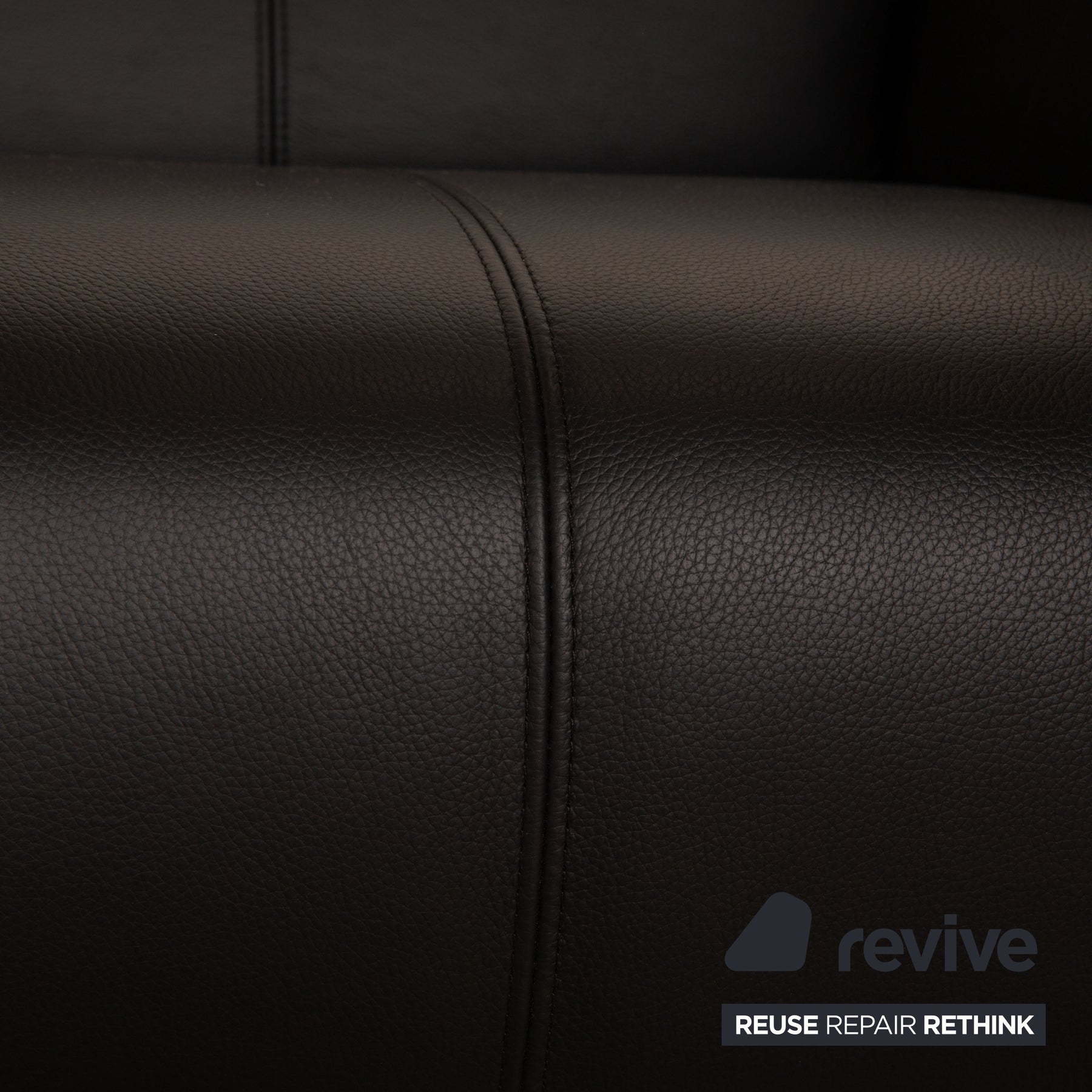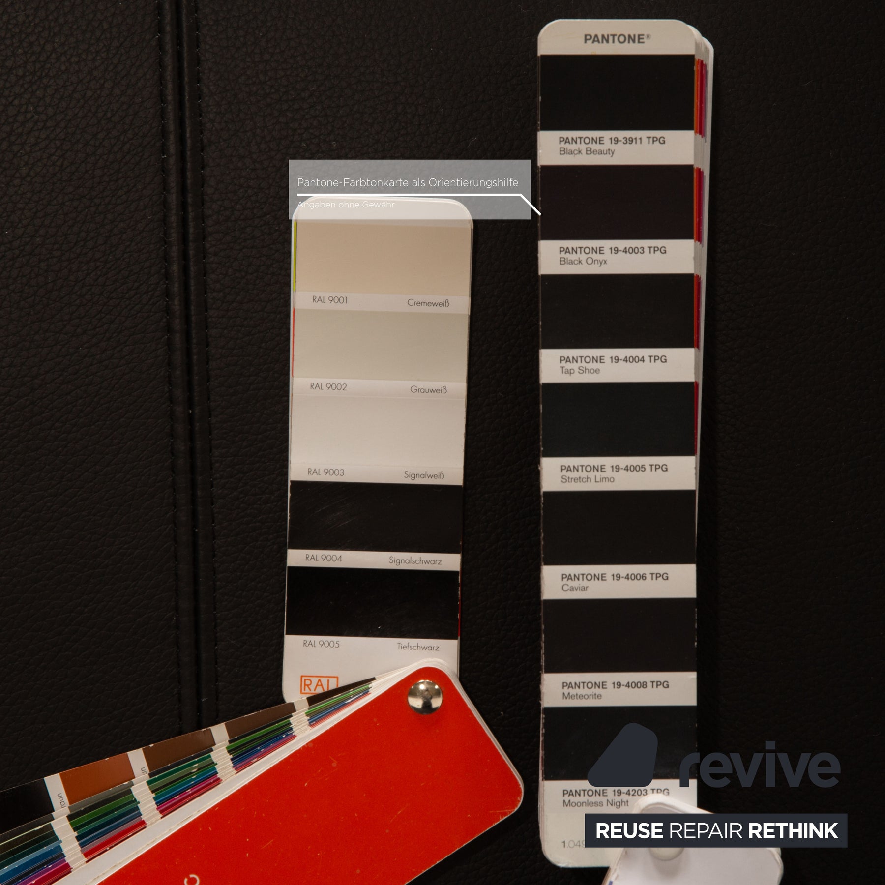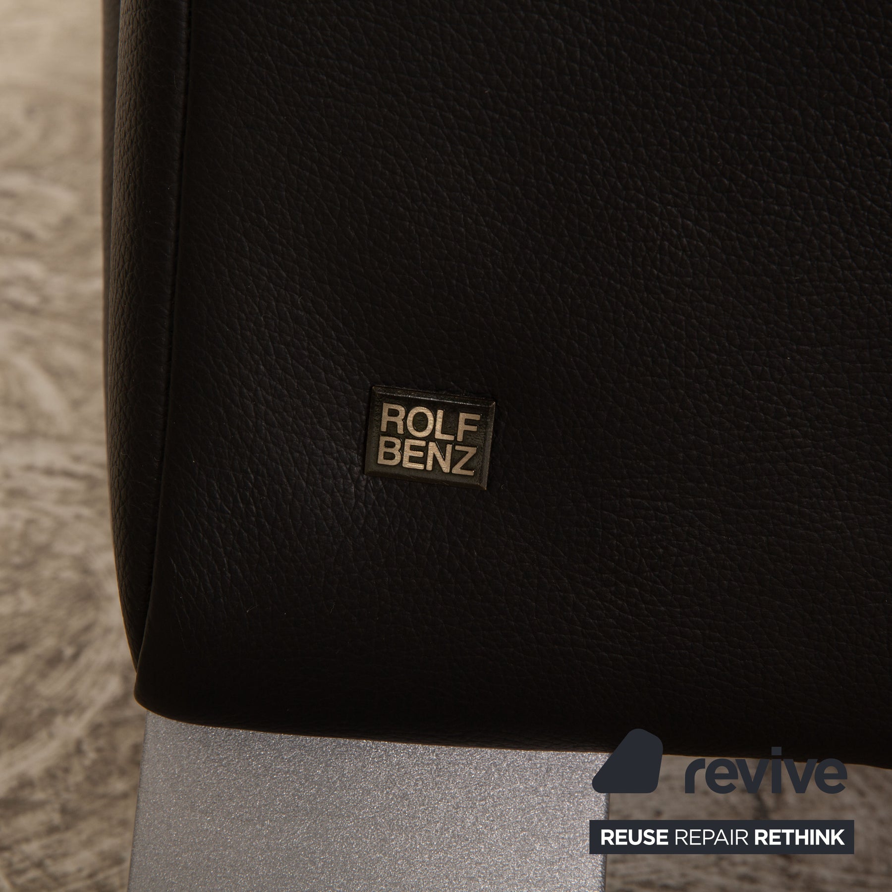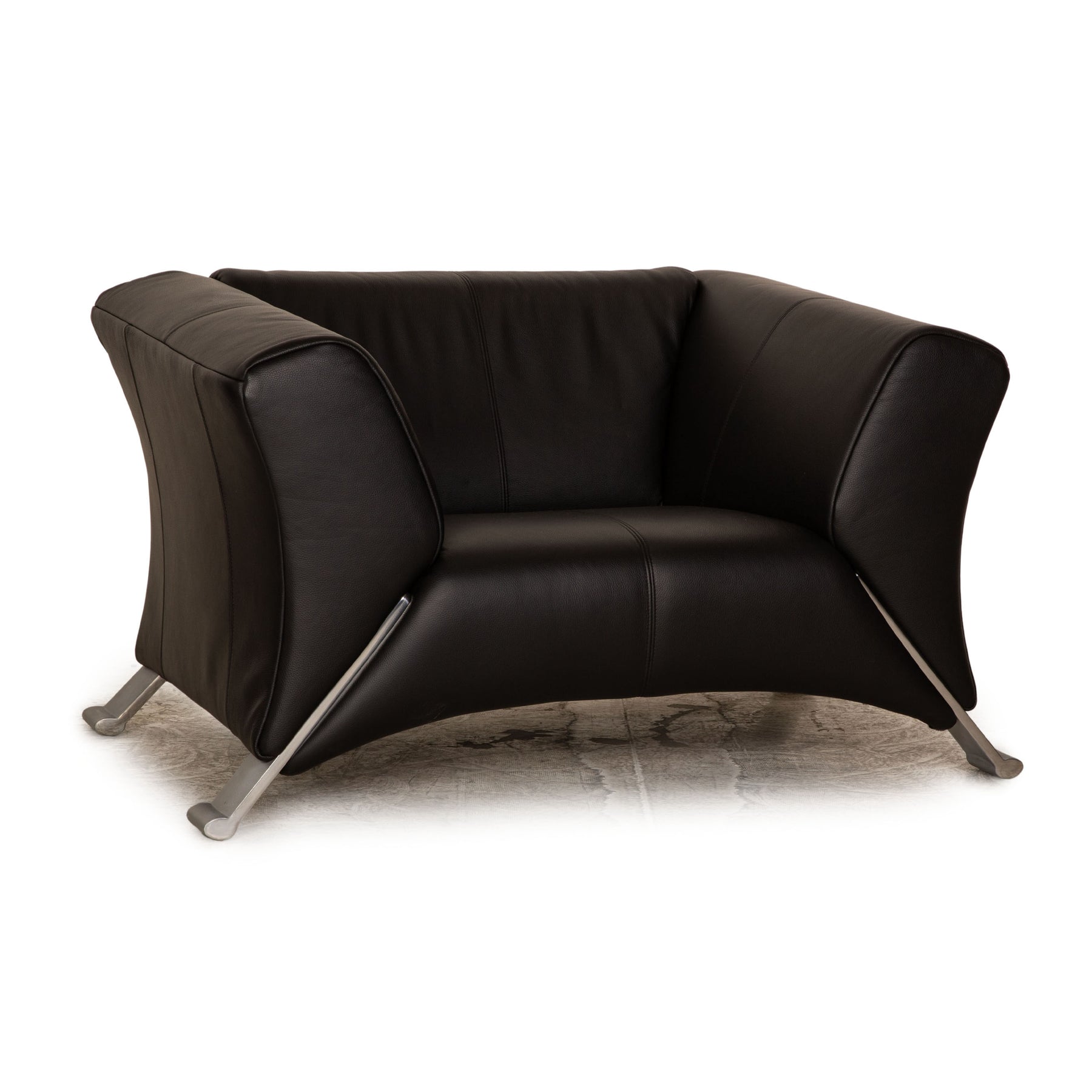 The 322 armchair is upholstered in black genuine leather and stands on slanted metal feet. It is characterized by the timeless design and the rounded edges.