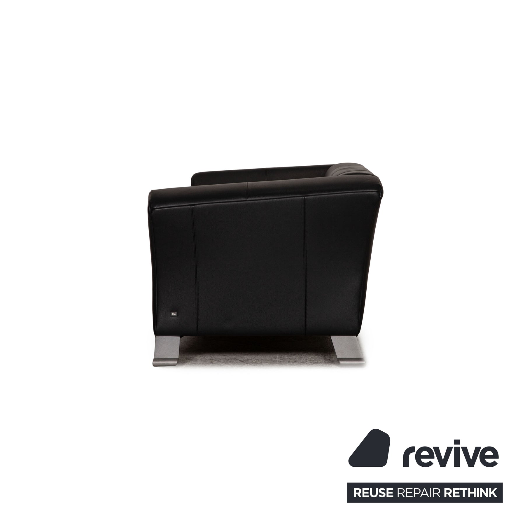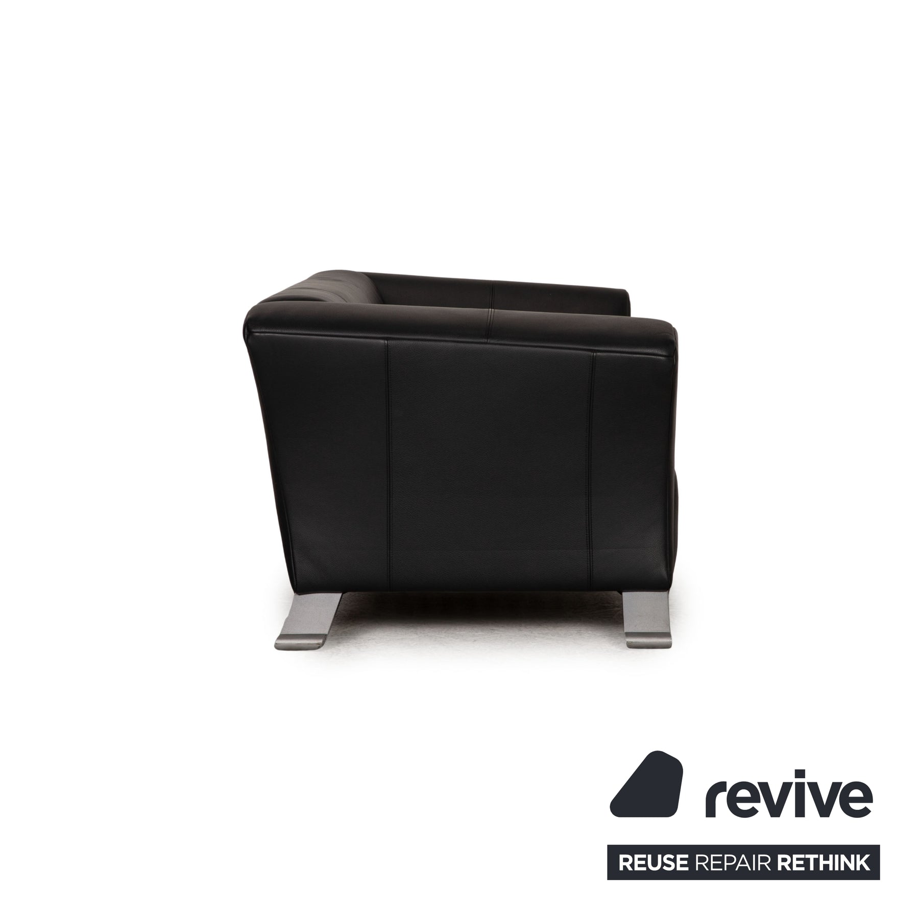 The 322 sofa set by Rolf Benz is upholstered in dark blue real leather and stands on silver metal feet. They are characterized by the simple, classic design and the slanted armrests.