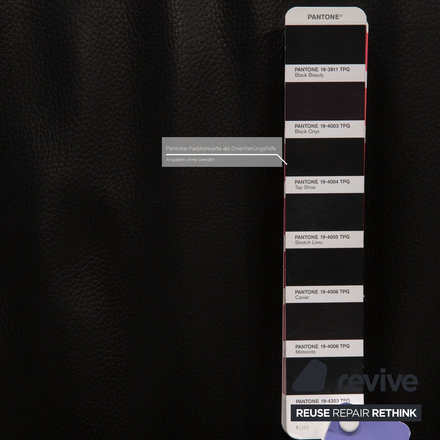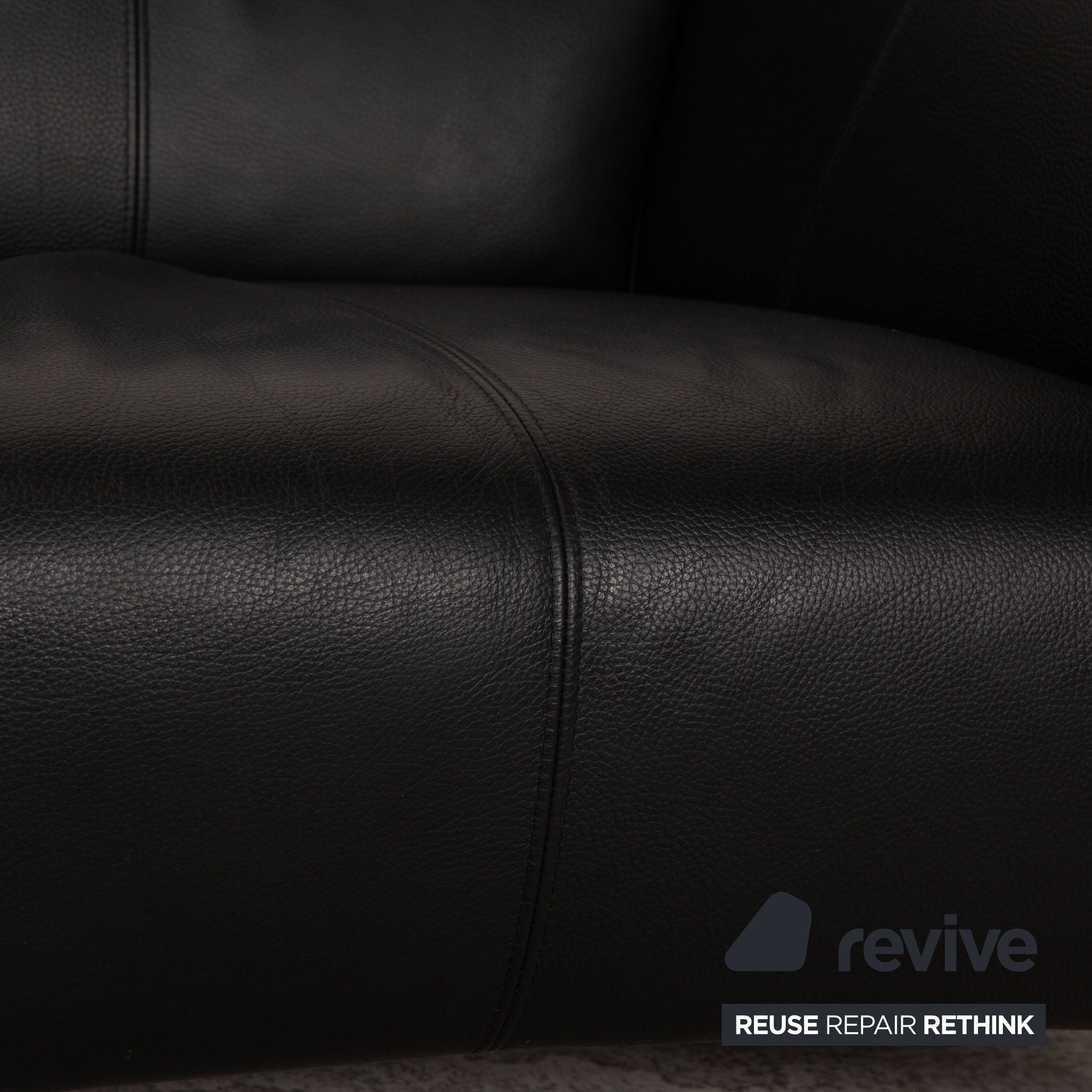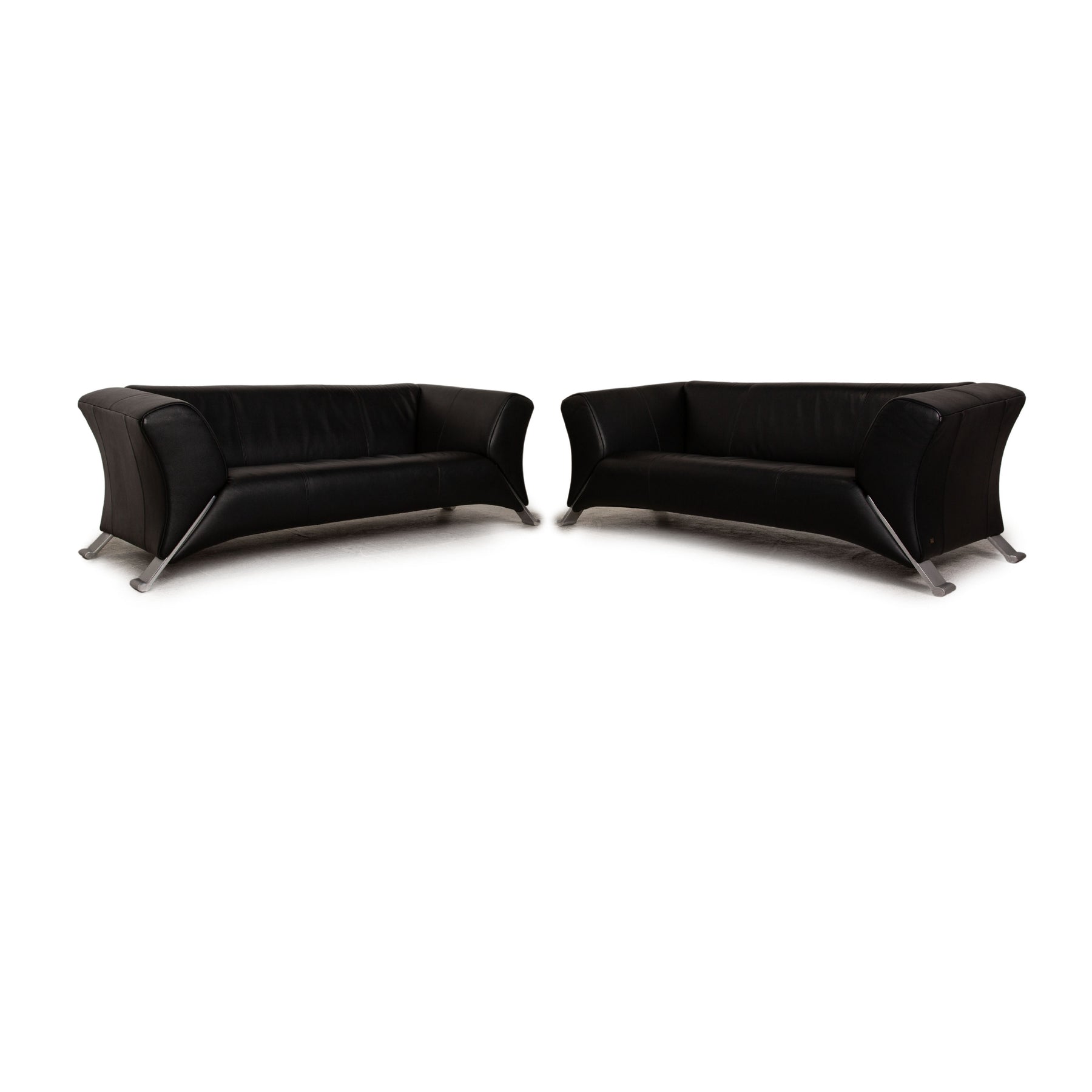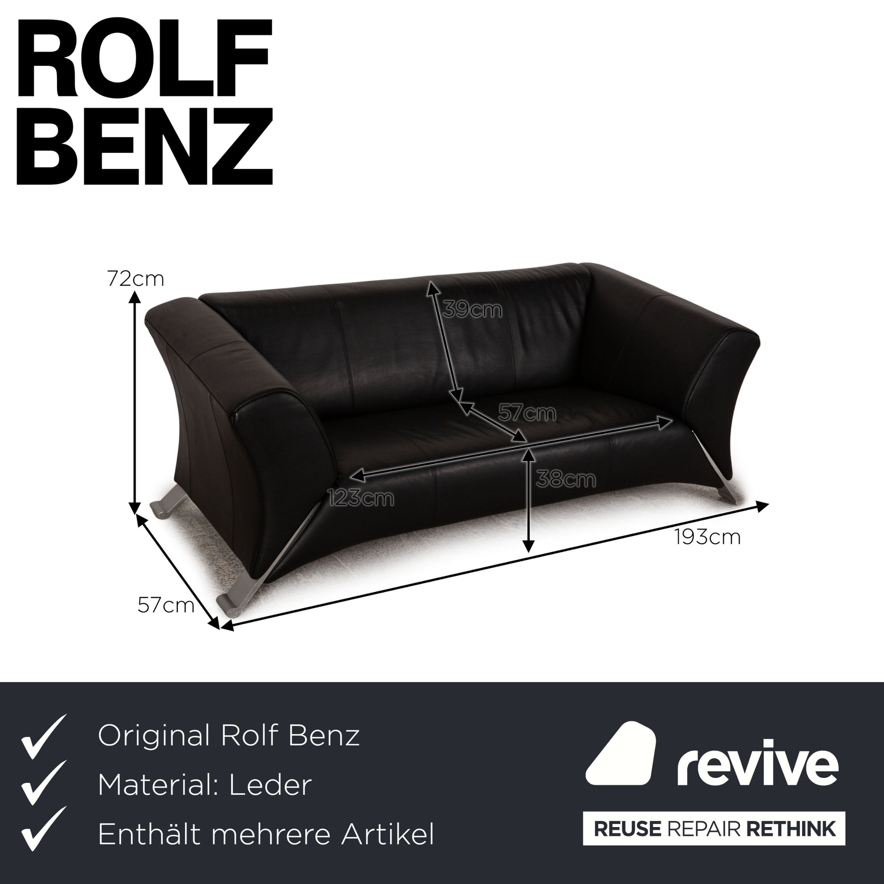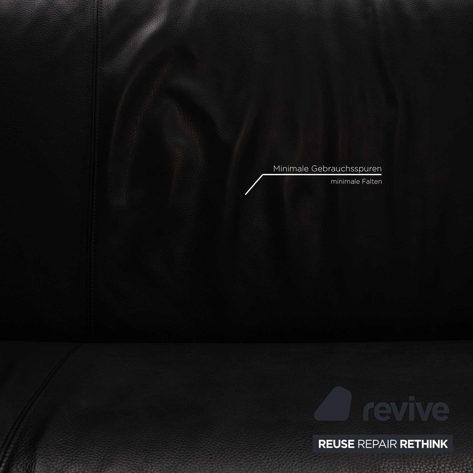 The 322 sofa by Rolf Benz is upholstered in black genuine leather and stands on silver metal feet. The simple design and the slanted armrests characterize the two-seater.