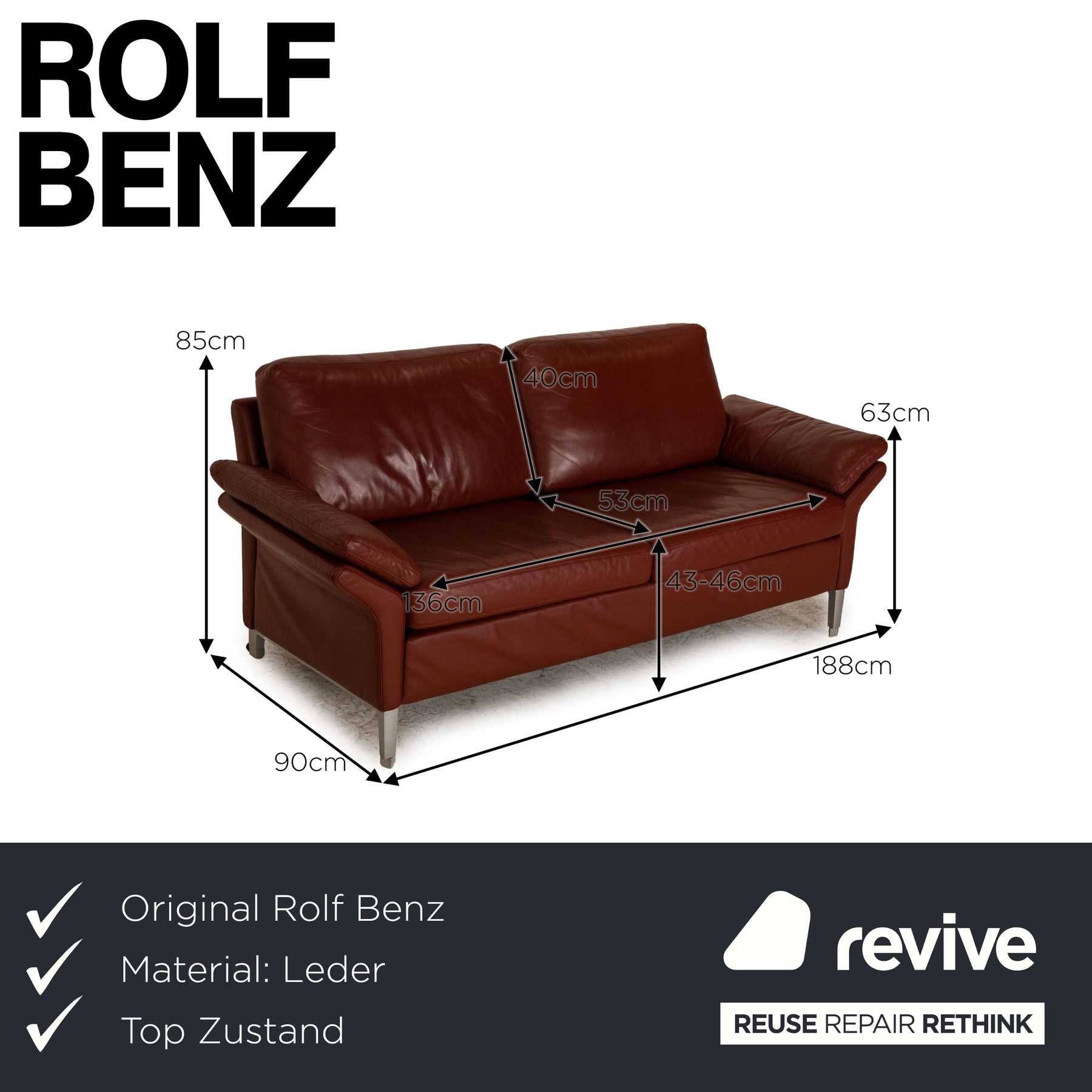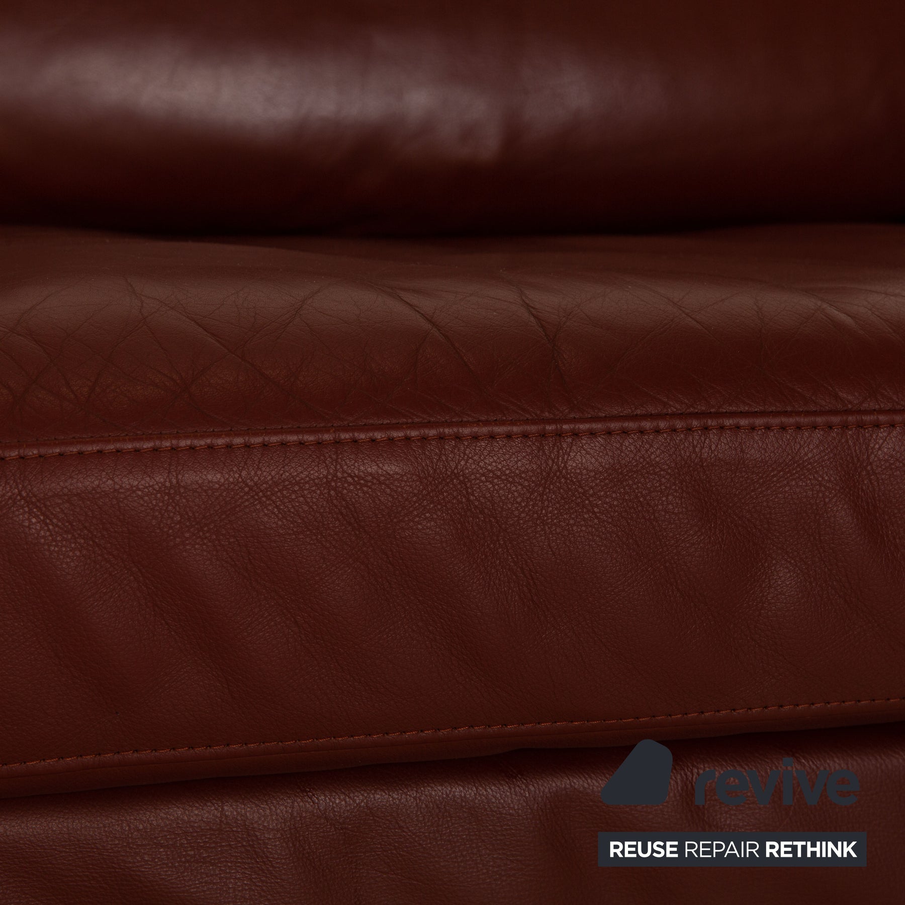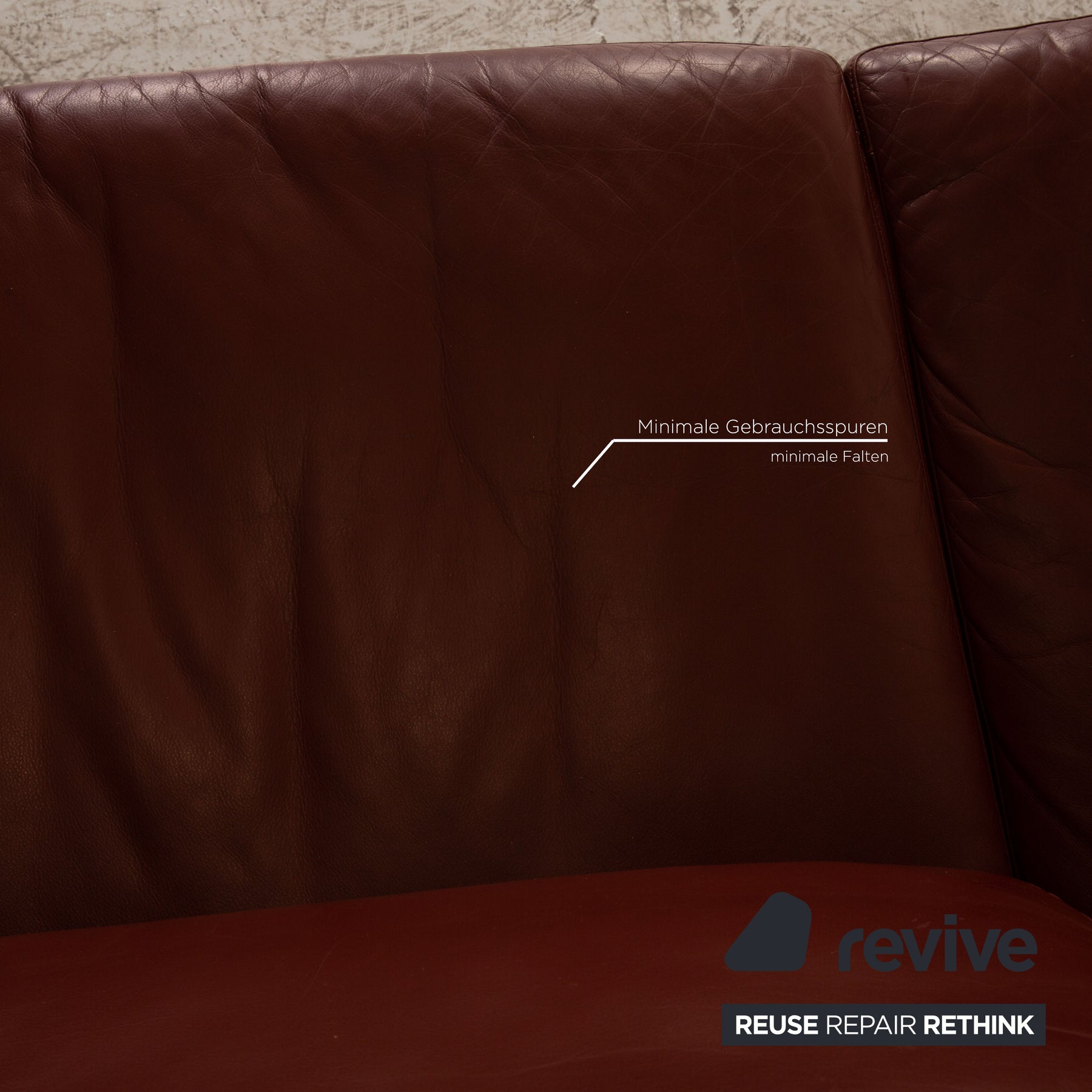 The 3300 sofa is upholstered in red genuine leather and stands on silver metal feet. The classic design and the slanted armrests characterize the two-seater.