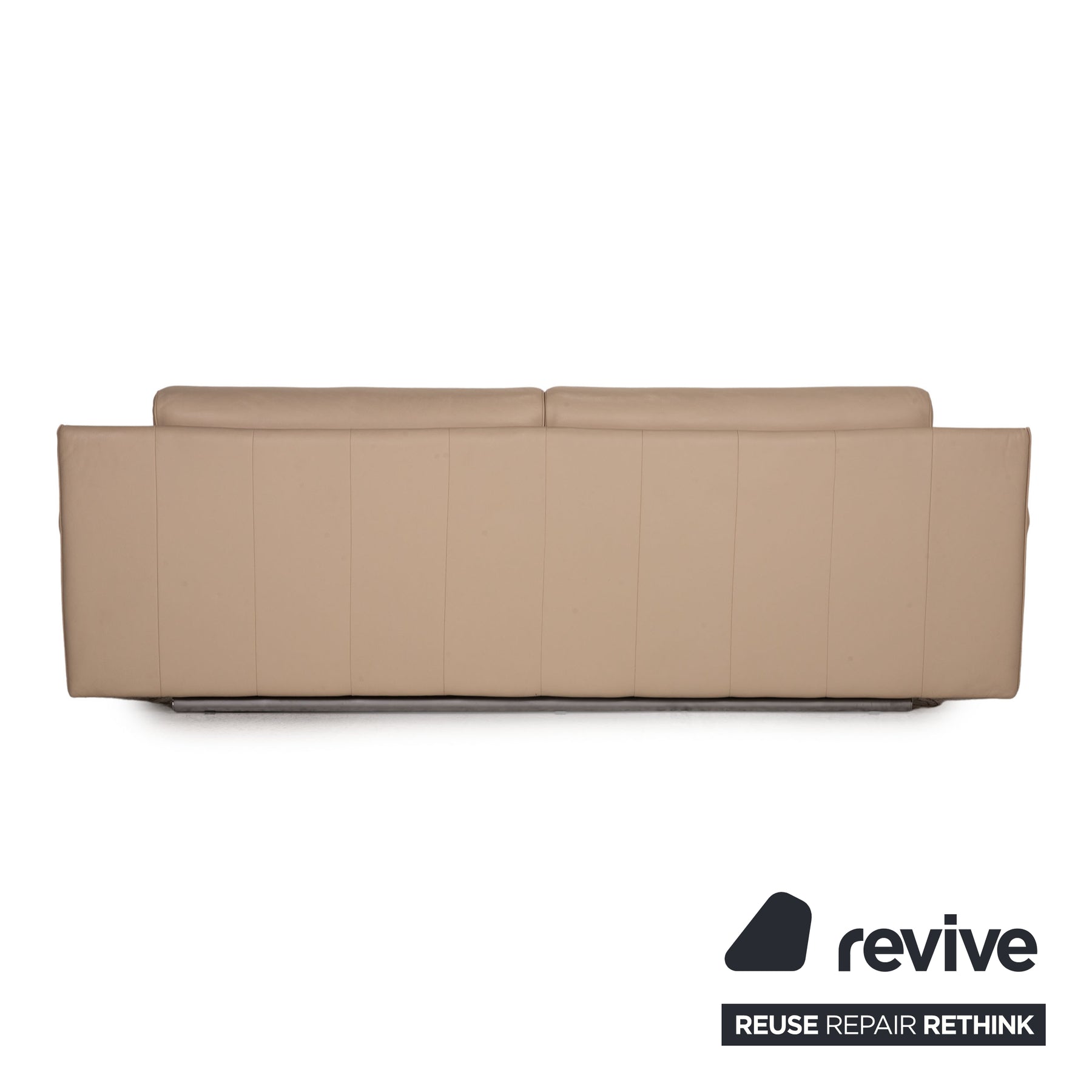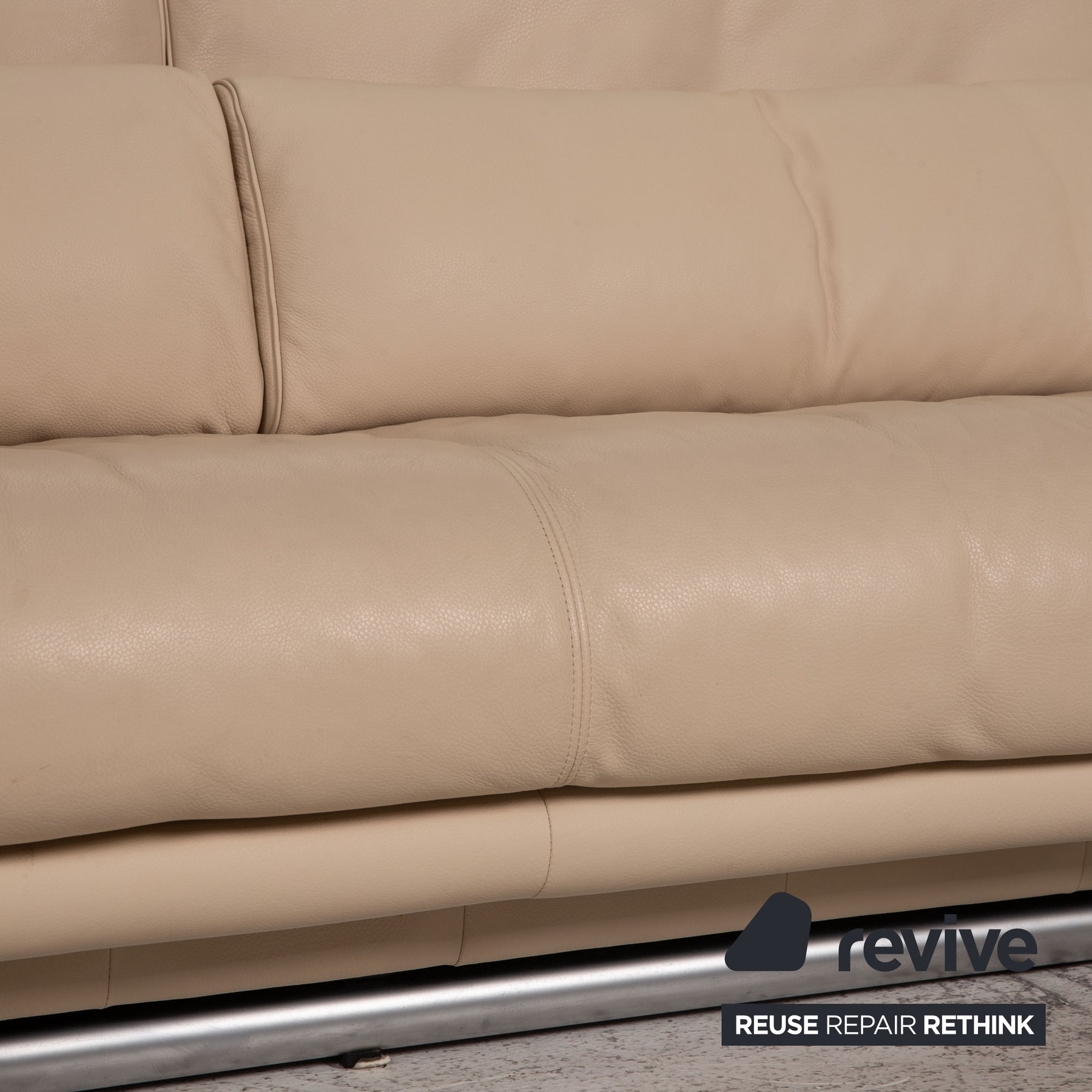The 6500 sofa set by Rolf Benz is covered with beige genuine leather. The classic is characterized by a unique design with a timeless character. The balanced, comfortable upholstery and support pillows ensure comfort.