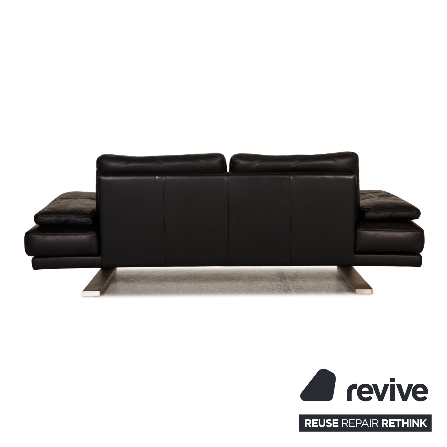 The three-seater 6600 from Rolf Benz is upholstered in black genuine leather and stands on two solid metal feet. It is characterized by the minimalist design and modern style.