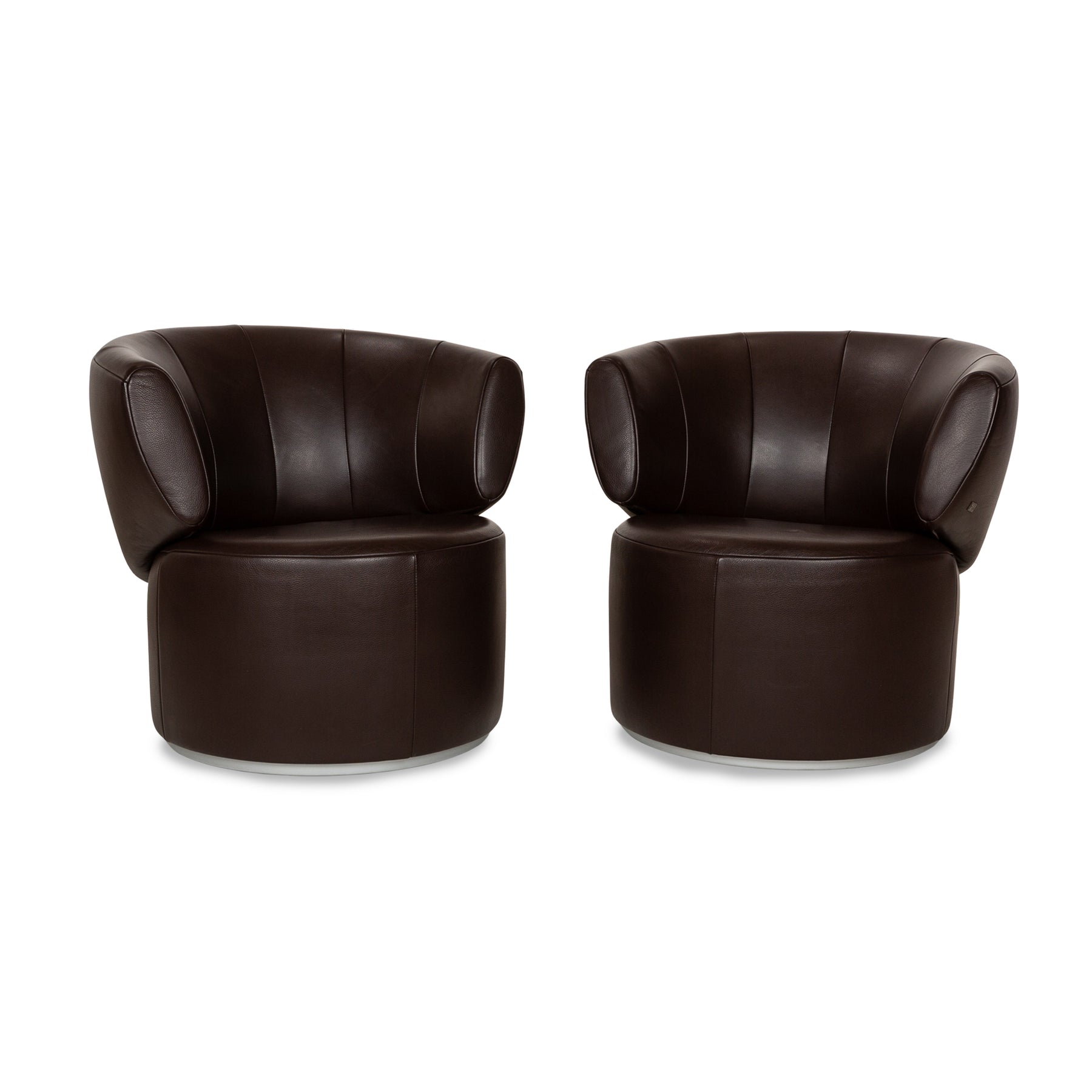 The armchair set 684 by Rolf Benz is covered with brown genuine leather and stands on a silver metal base. It is characterized by its stylish appearance and minimalist design. The set consists of two armchairs.