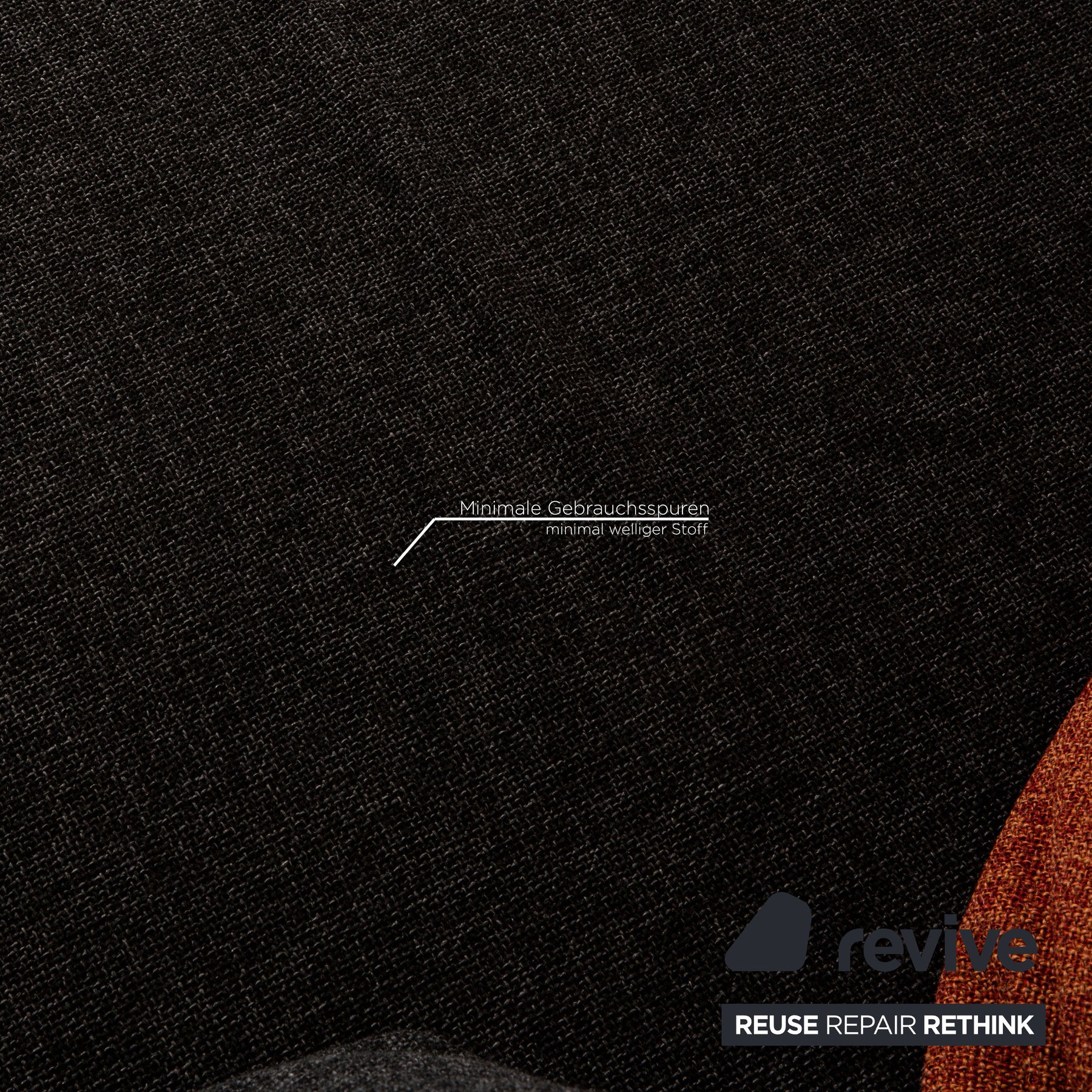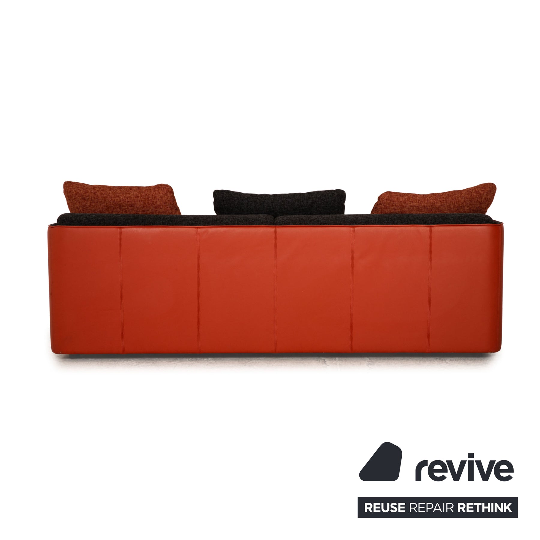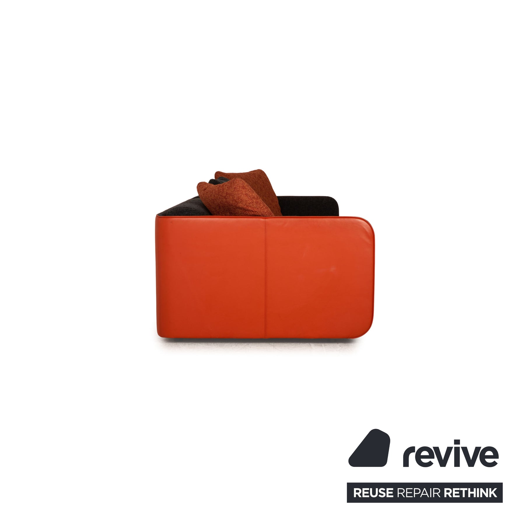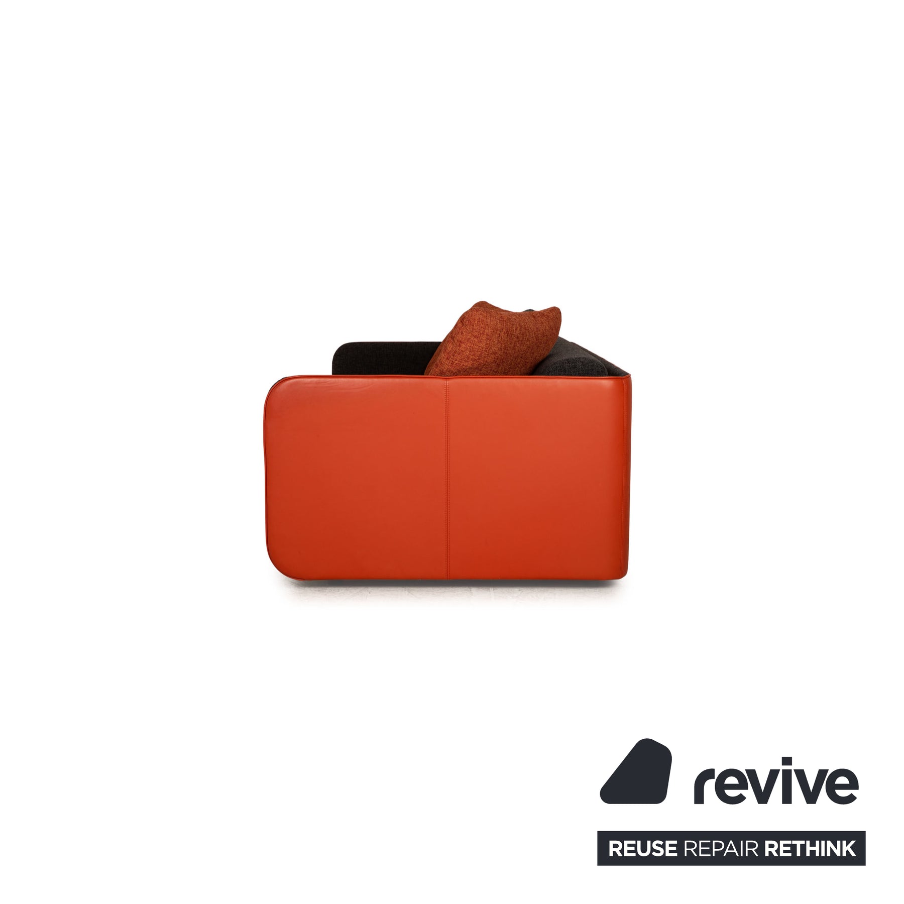 The 6900 sofa set by Rolf Benz consists of a three-seater and a stool. The three-seater is upholstered in gray fabric and orange-colored genuine leather. The stool is covered with an orange genuine leather. The set is characterized by the compact, solid body and the orange details.