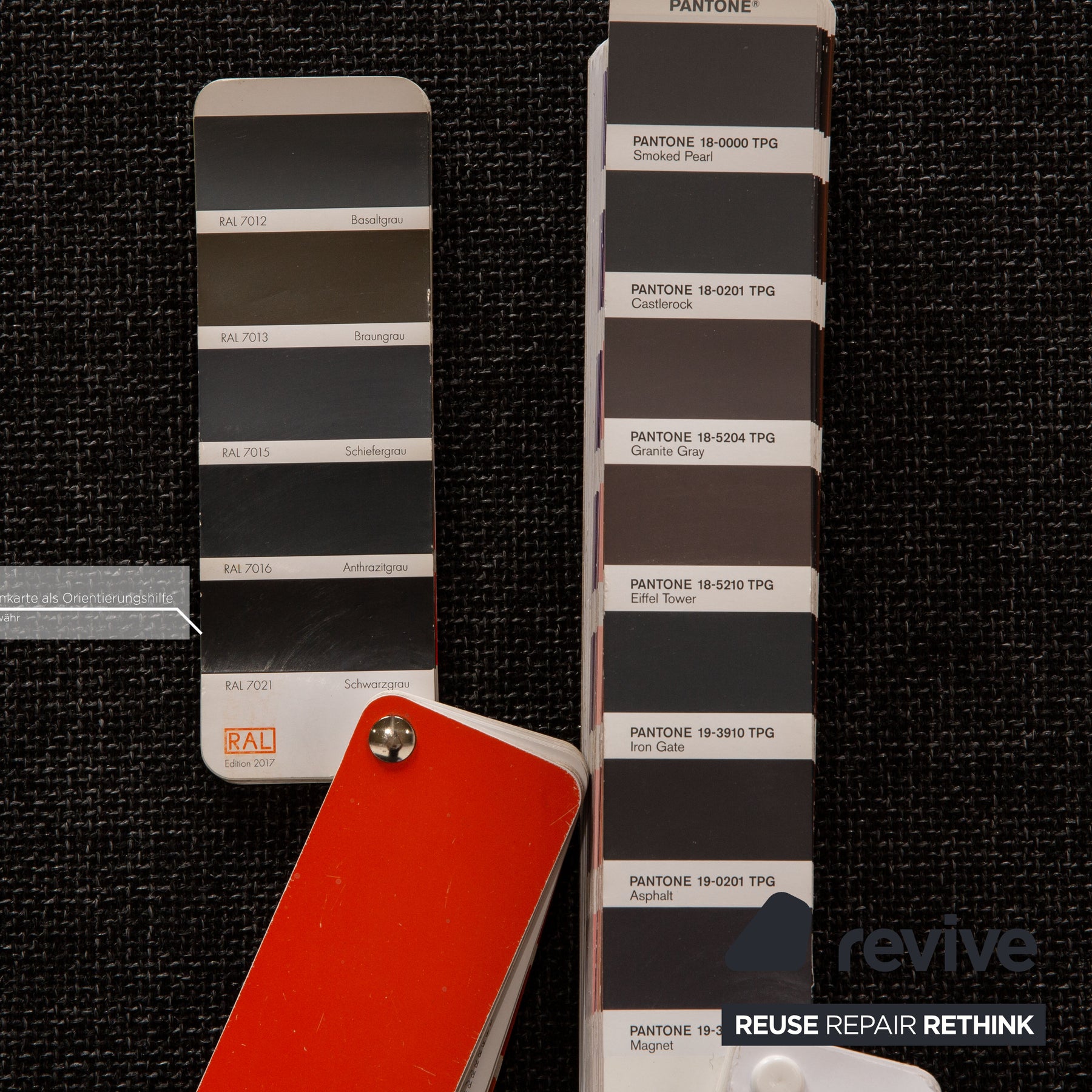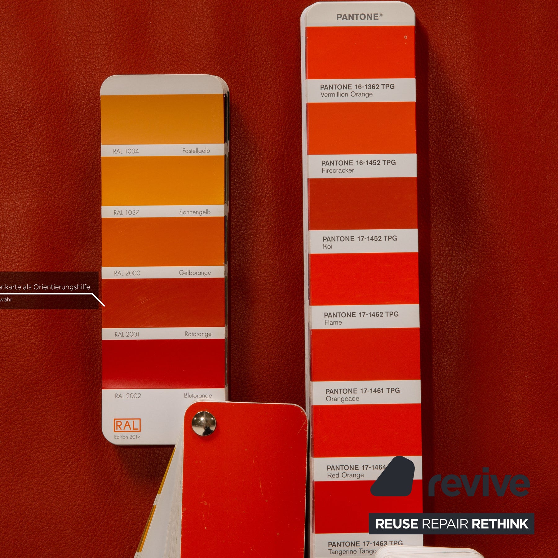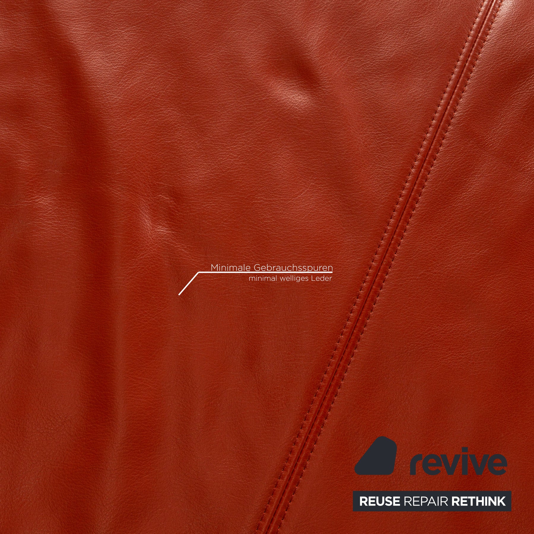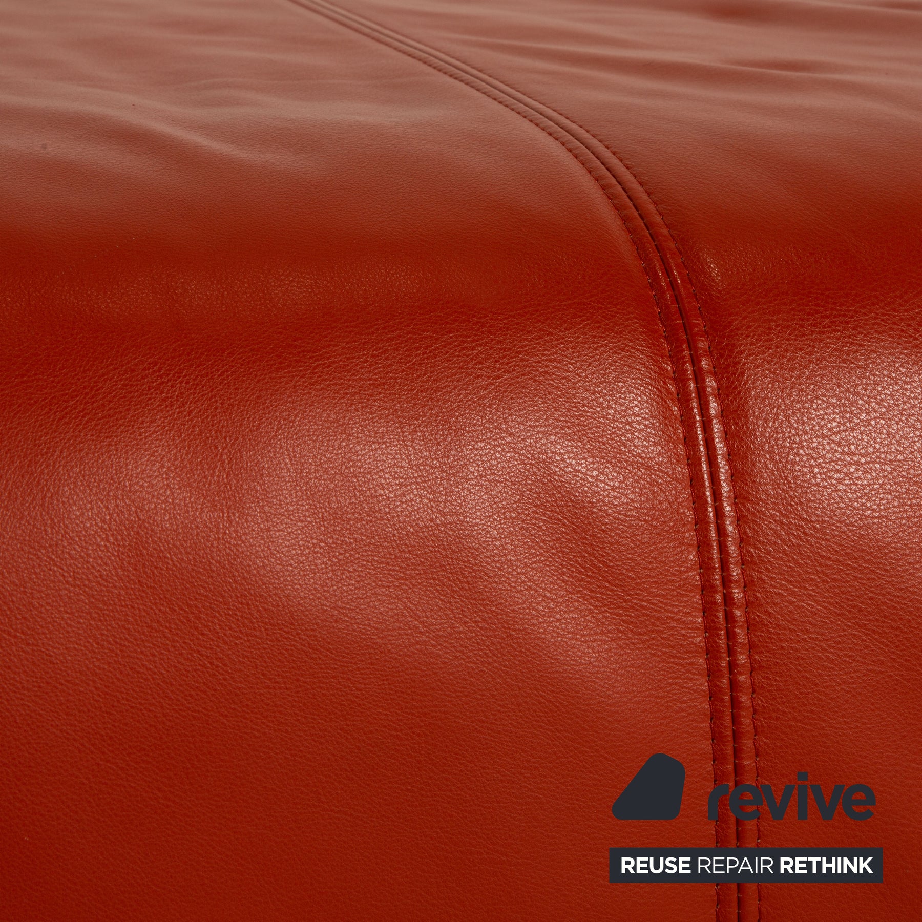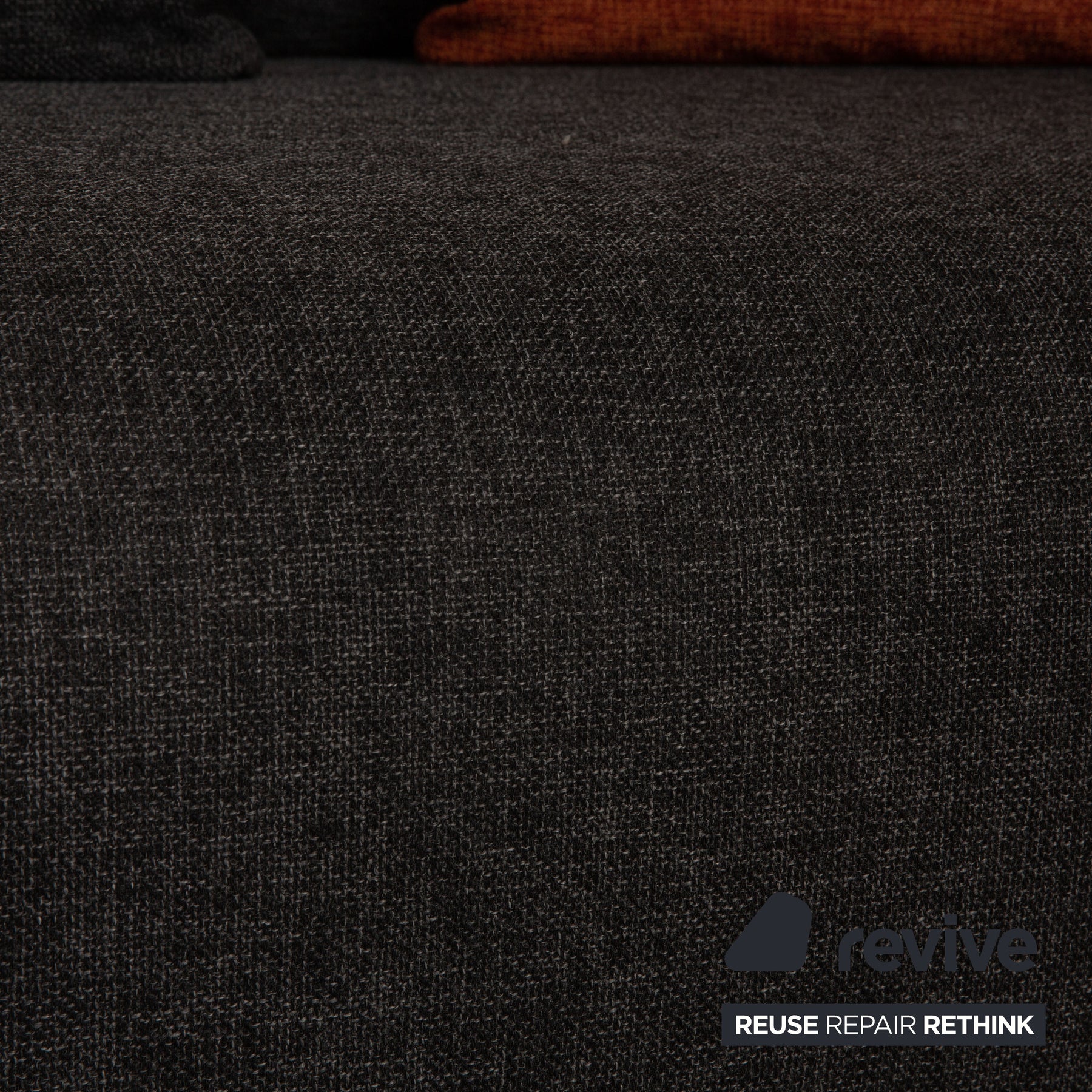 The 6900 sofa set by Rolf Benz consists of a three-seater and a stool. The three-seater is upholstered in gray fabric and orange-colored genuine leather. The stool is covered with an orange genuine leather. The set is characterized by the compact, solid body and the orange details.
