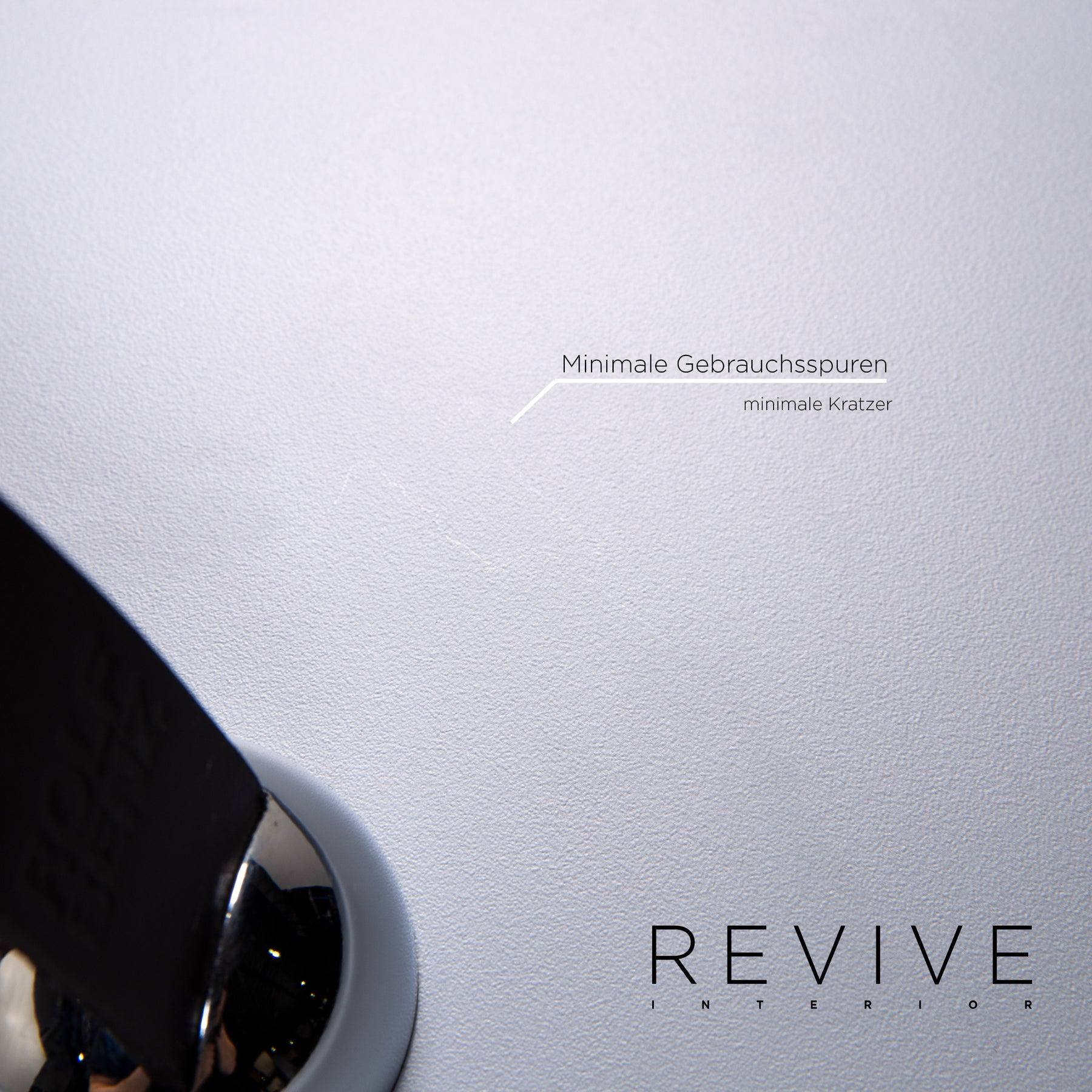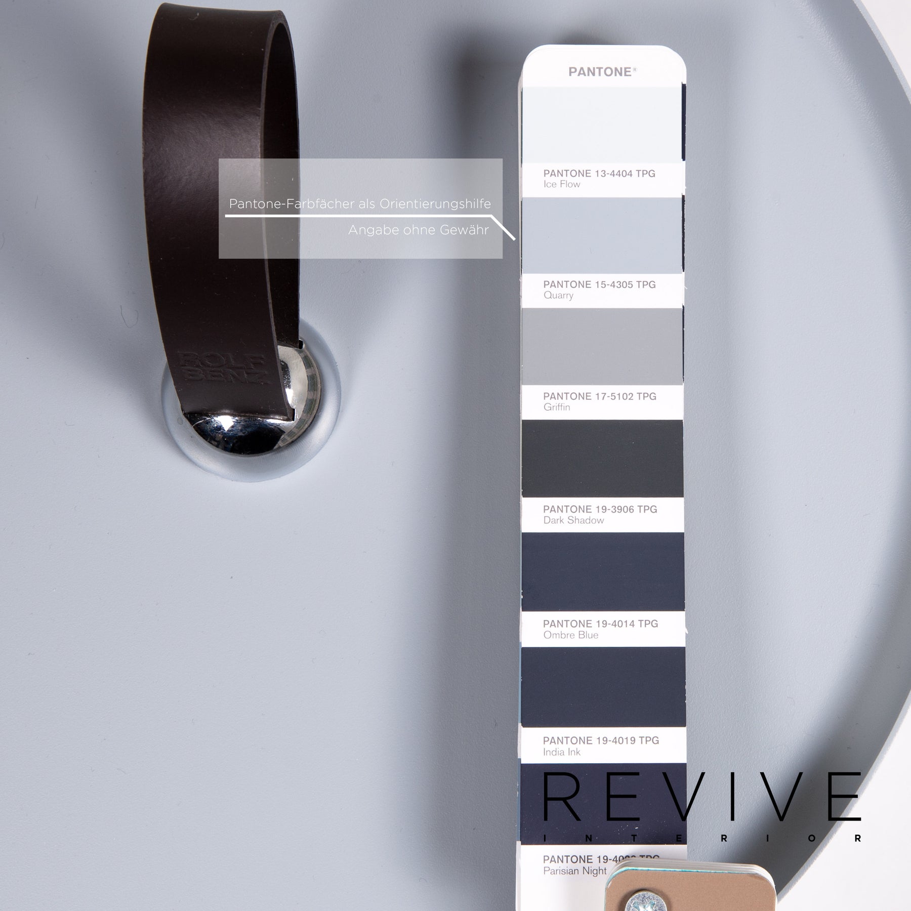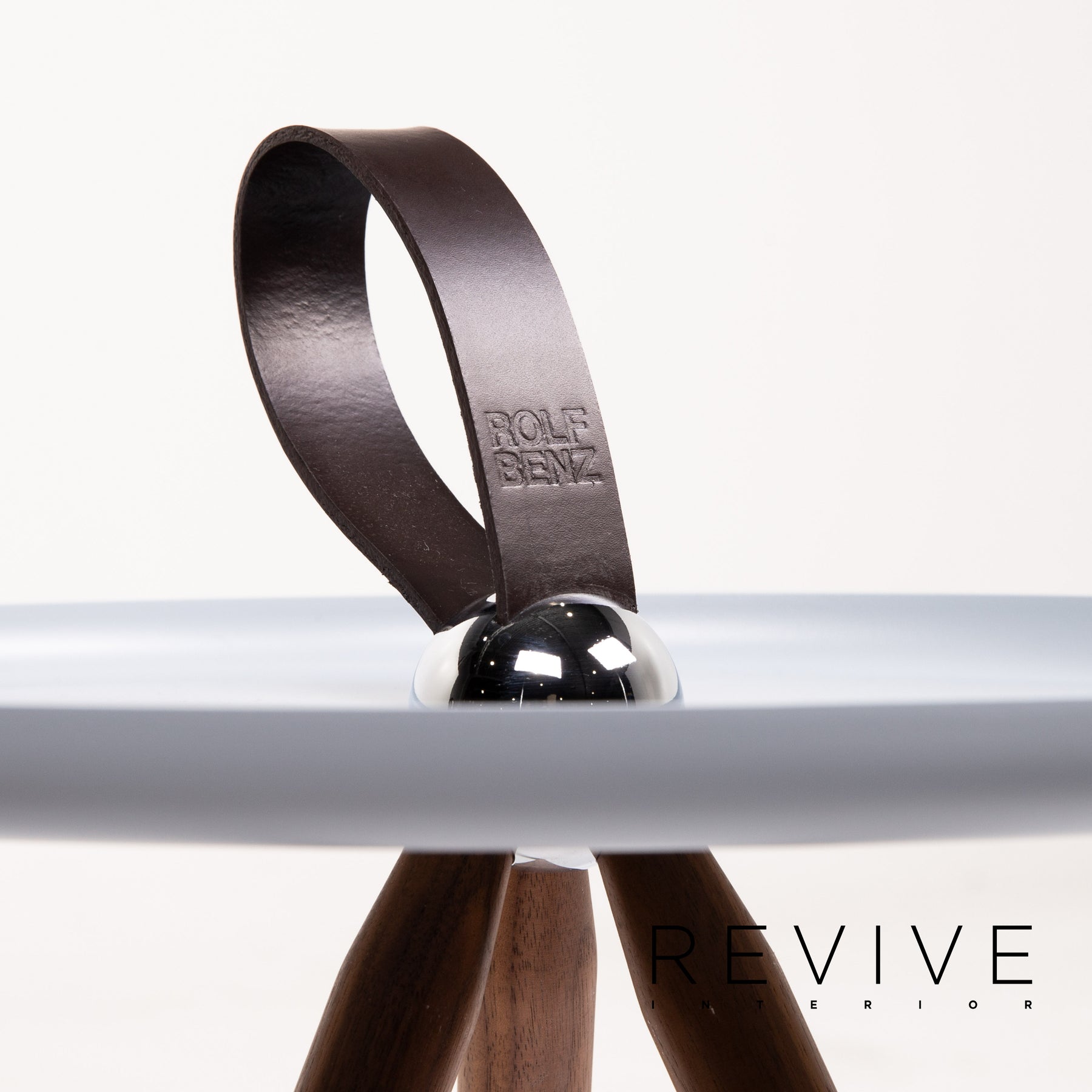 The 973 coffee table by Rolf Benz features an ice-blue sheet steel top that rests on a solid walnut frame. The eye-catcher is the dark brown loop made of butt leather in the middle of the table.