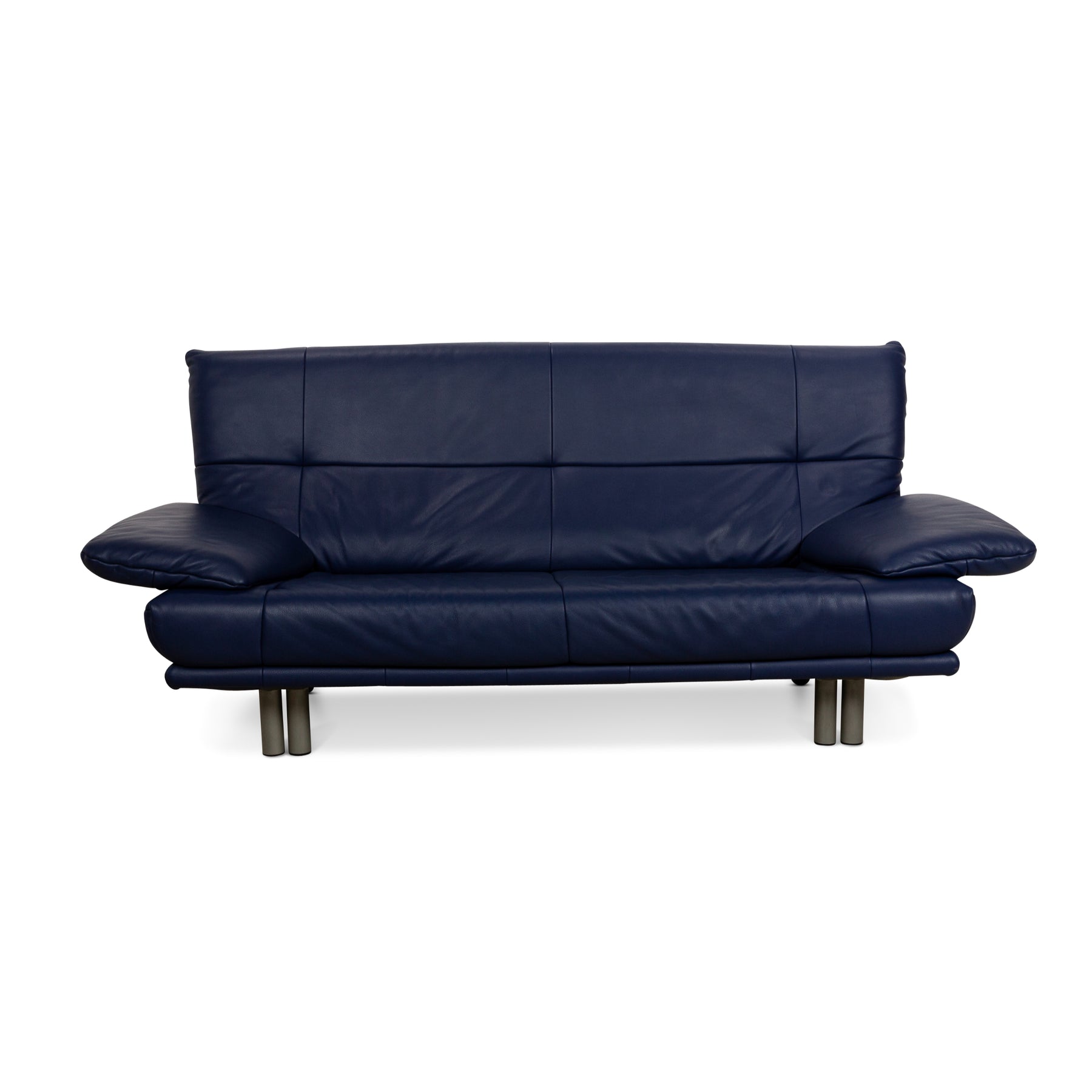 The three-seater BMP 418 by Rolf Benz is covered in blue genuine leather and stands on round metal feet. It is characterized by its classic design and simple, timeless appearance.