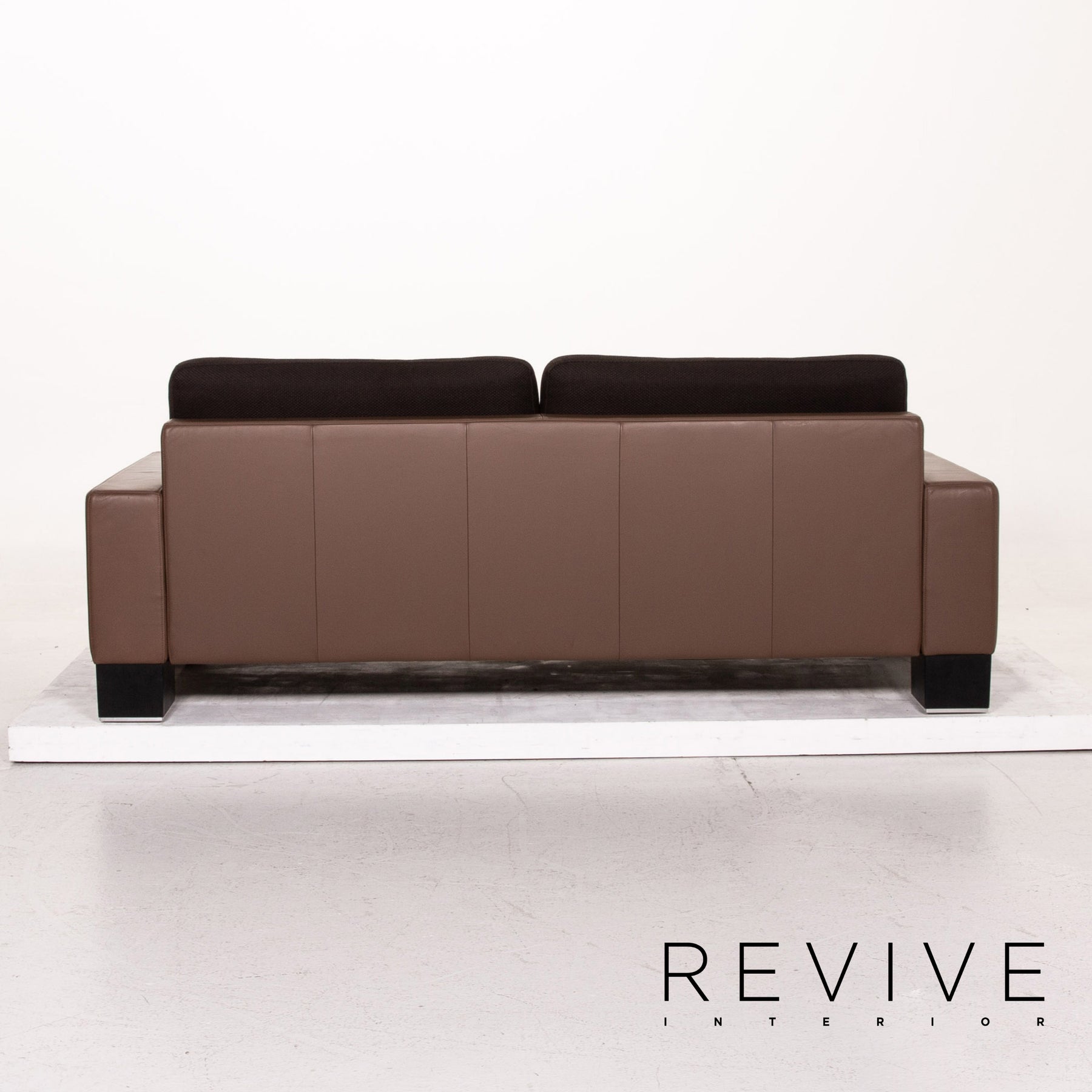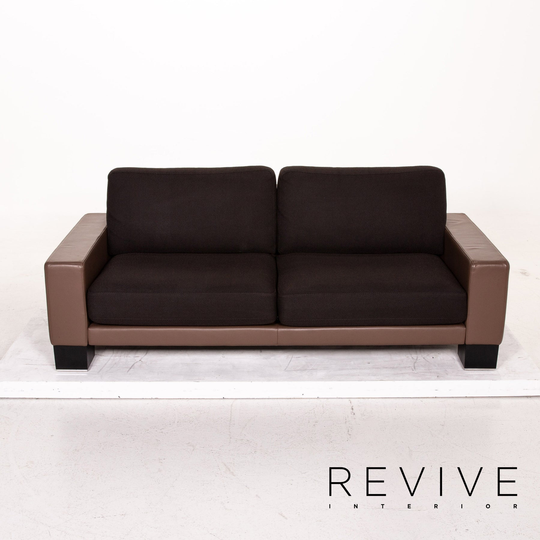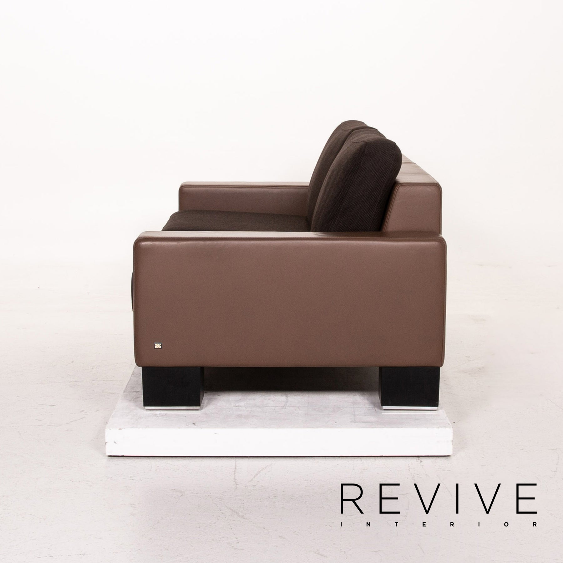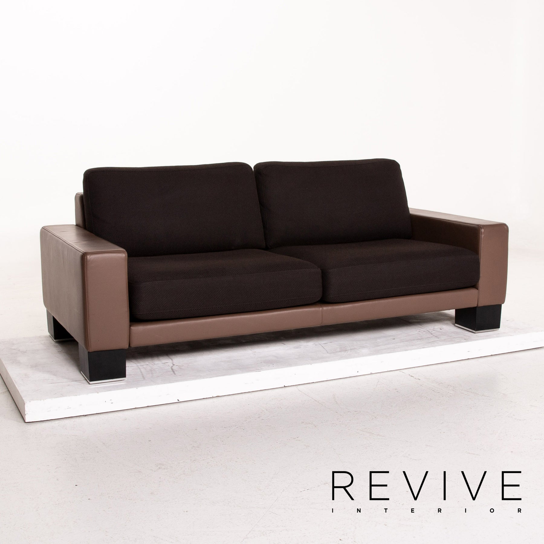 The three-seater from Rolf Benz is upholstered in brown genuine leather and dark brown fabric. It stands on dark feet with metal accents. The sofa is characterized by its cubic, linear design and the comfortable upholstery.